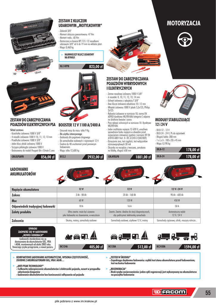 Zestaw z kluczem udarowym „motylkowym” MOTORYZACJA - Zabierak 3/8” - Moment statyczny gwarantowany: 47 Nm - Moment maks.: 60 Nm - Dostarczany w kasecie BP.112 z 12 nasadkami udarowymi 3/8” od 6 do 19 mm na wkładce plast. - Waga: 0,460 kg NAJMNIEJSZY KLUCZ UDAROWY NA RYNKU! 823,00 zł NJ.14FPB 180° 120 mm Zestaw do zabezpieczania pojazdów hybrydowych i elektrycznych Zestaw do zabezpieczania pojazdów elektrycznych PSA Booster 12 V 1100 A/2400 A Skład zestawu: - Grzechotka izolowana 1000 V 3/8” - 4 nasadki izolowane 1000 V 10, 11, 12, 13 mm - Przedłużka izolowana 1000 V 3/8” - Jeden klucz płaski izolowany 1000 V - Szczypce półokrągłe izolowane 1000 V - Dostosowany do modeli Peugeot iOn i Citroën C-zero CM.ELPSAPB - Stosunek masy do mocy: tylko 9 Kg - Do użytku intensywnego - Doskonały dla pogotowia drogowego - Do samochodów osobowych i ciężarowych 12 V - Średnio do 40 uruchomień przed ponownym ładowaniem - Waga: tylko 12,600 kg 856,00 zł 2932,00 zł B12.2 - Zestaw nasadowy izolowany 1000 V 3/8” - 6 nasadek: 8, 10, 11, 12, 13, 14 mm - Uchwyt izolowany z rękojeścią T 3/8” - Dwa klucze izolowane odsadzane 10 i 12 mm - Wkrętak izolowany 1000 V płaski 5,5x125, Philips 2x125 - Rękawice izolowane w rozmiarze 10; norma EN 60903 dyrektywa WE/89/686 kategoria C odporne na działanie kwasów i ozonu - Para rękawic ochronnych w rozmiarze 10. Dyrektywa WE/89/686 - Jeden multitester napięcia 12-690 V; umożliwia sprawdzenie braku napięcia w obwodzie przed rozpoczęciem interwencji zgodnie z normami NF EN 61010-600 V kat. 3 i IEC 61243-3 (VAT/DDT) - Oznaczenie zera, test ciągłości, test wyłączników różnicowoprądowych 30 mA - Skrzynka na narzędzia z tworzywa, zamykana na kłódkę, długość 650 mm 1881,00 zł CM.HYELPB ModułY stabilizującE 12 i 24 V - DX.8-12 - 12 V - DX.8-24 - 24 V, PL-do ciężarówek - Długość kabla: 300 mm - 1 x L x h : 100 x 20 x 45 mm - Waga: 0,190 kg DX.8-12 178,00 zł DX.8-24 178,00 zł Ładowarki akumulatorów Napięcie akumulatora 12 V 12 V 12 V i 24 V 3 Ah - 80 Ah 20 Ah - 160 Ah 90 Ah - 600 Ah Moc 60 W 120 W 450 W Odpowiednik tradycyjnej ładowarki 10 A 16 A 50 A Ultra-zwarta: może być używana jako ładowarka na showroomie, w warsztacie Zwarta: Zwarta: idealna do stacji diagnostycznych, aby podtrzymać elektronikę samochodu Automatyczny wybór 12 V / 24 V Skutery, motory, samochody osobowe Samochody osobowe, użytkowe 12 V, motory Samochody ciężarowe, silniki, maszyny rolnicze... Zakres Zalety produktu Zalecenia UWAGA! ZAOPATRZ SIĘ W ŁADOWARKI „NOWEJ GENERACJI” Ładowarki standardowe nie są dostosowane do akumulatorów GEL, VRA i AGM, montowanych od około 2002 roku. Stwarzają ryzyko przegrzania, a nawet pożaru. BC124A 405,00 zł KOMPAKTOWE ŁADOWARKI AUTOMATYCZNE, WYSOKA CZĘSTOTLIWOŚĆ, ZGODNE Z AKUMULATORAMI GEL, VRA I AGM… „Anti Peak Technology” - Całkowite zabezpieczenie akumulatorów i elektroniki pojazdu, nawet w przypadku odwrócenia biegunów - Ładowanie akumulatorów bez konieczności odłączania od pojazdu BC128A 512,00 zł BC2430A 1594,00 zł „TESTER W ŚRODKU” - Zapobiega zbędnemu ładowaniu: szybki test stanu akumulatora przed ładowaniem; test na końcu ładowania „REGENERACJA” - Brak ryzyka zasiarczanienia: jeden cykl regeneracji jest wykonywany na akumulatorze na początku ładowania 55 plik pobrano z www.im.krakow.pl