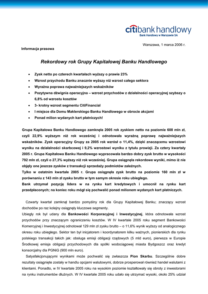 Warszawa, 1 marca 2006 r. Informacja prasowa Rekordowy rok Grupy Kapitałowej Banku Handlowego • Zysk netto po czterech kwartałach wyższy o prawie 23% • Wzrost przychodu Banku znacznie wyższy niż wzrost całego sektora • Wyraźna poprawa najważniejszych wskaźników • Pozytywna dźwignia operacyjna – wzrost przychodów z działalności operacyjnej szybszy o 6,8% od wzrostu kosztów • 3- krotny wzrost segmentu CitiFinancial • I miejsce dla Domu Maklerskiego Banku Handlowego w obrocie akcjami • Ponad milion wydanych kart płatniczych! Grupa Kapitałowa Banku Handlowego zamknęła 2005 rok zyskiem netto na poziomie 608 mln zł, czyli 22,9% wyższym niż rok wcześniej i odnotowała wyraźną poprawę najważniejszych wskaźników. Zysk operacyjny Grupy za 2005 rok wzrósł o 11,4%, dzięki znaczącemu wzrostowi wyniku na działalności skarbcowej i 9,2% wzrostowi wyniku z tytułu prowizji. Za cztery kwartały 2005 r. Grupa Kapitałowa Banku Handlowego wypracowała bardzo dobry zysk brutto w wysokości 792 mln zł, czyli o 27,3% wyższy niż rok wcześniej. Grupa osiągnęła rekordowe wyniki, mimo iż nie objęły one jeszcze zysków z transakcji sprzedaży podmiotów zależnych. Tylko w ostatnim kwartale 2005 r. Grupa osiągnęła zysk brutto na poziomie 160 mln zł w porównaniu z 143 mln zł zysku brutto w tym samym okresie roku ubiegłego. Bank utrzymał pozycję lidera w na rynku kart kredytowych i umocnił na rynku kart przedpłaconych; na koniec roku mógł się pochwalić ponad milionem wydanych kart płatniczych. Czwarty kwartał zamknął bardzo pomyślny rok dla Grupy Kapitałowej Banku; znaczący wzrost dochodów po raz kolejny osiągnęły kluczowe segmenty. Ubiegły rok był udany dla Bankowości Korporacyjnej i Inwestycyjnej, która odnotowała wzrost przychodów przy znaczącym ograniczeniu kosztów. W IV kwartale 2005 roku segment Bankowości Komercyjnej i Inwestycyjnej odnotował 129 mln zł zysku brutto – o 11,6% wynik wyższy od analogicznego okresu roku ubiegłego. Sektor ten był inicjatorem i koordynatorem kilku ważnych, pionierskich dla rynku polskiego transakcji takich jak: obsługa emisji obligacji rządowych (5 mld euro), pierwsza w Europie Środkowej emisja obligacji przychodowych dla spółki wodociągowej miasta Bydgoszcz oraz kredyt konsorcjalny dla PGNiG (900 mln euro). Satysfakcjonującymi wynikami może pochwalić się zwłaszcza Pion Skarbu. Szczególnie dobre rezultaty osiągnięte zostały w handlu opcjami walutowymi, dobrze prosperował również handel walutami z klientami. Ponadto, w IV kwartale 2005 roku na wysokim poziomie kształtowały się obroty z inwestorami na rynku instrumentów dłużnych. W IV kwartale 2005 roku udało się utrzymać wysoki, około 25% udział na rynku opcji walutowych, 22% udział na inwestorskim rynku instrumentów dłużnych oraz 25% udział na klientowskim rynku walut. W całym 2005 roku Bank umacniał swoją pozycję w obszarze bankowości transakcyjnej wzbogacając ofertę o innowacyjne produkty, m.in.: kartę przedpłaconą dla instytucji publicznych, produkty finansowania handlu i rachunek powierniczy dla Klientów instytucjonalnych. W ostatnim kwartale 2005 roku Bank rozszerzał swoją ofertę w zakresie produktów zarządzania gotówką wprowadzając nowe struktury zarządzania płynnością dla grup kapitałowych w ramach rozwiązań typu „cash pooling” w walutach obcych. W listopadzie 2005 roku produkt SpeedCollect Plus uzyskał prestiżową nagrodę przyznawaną przez The Banking Technology Magazine w kategorii: „Best business/corporate banking achievement for 2005”. W czwartym kwartale Bank podpisał pierwszą umowę o wydanie kart stypendialnych dla Wyższej Szkoły Administracji Publicznej w Białymstoku, a tym samym wprowadził na rynek polski pierwszą kartę przedpłaconą skierowaną do studentów. W odpowiedzi na potrzeby Klientów ubiegających się o wsparcie ze środków UE Bank wprowadził w 2005 r. pakiet „Europa Przedsiębiorstw” i rozpoczął aktywne pozyskiwanie Klientów z sektora publicznego. W październiku 2005 roku Bank w ramach umowy podpisanej z Kreditanstalt für Wiederaufbau („KfW”) na refinansowanie kredytów dla małych i średnich przedsiębiorstw otrzymał dotację z Komisji Europejskiej na kwotę 1,15 mln EUR. W grudniu ubiegłego roku Bank wydał ponad 40 promes bankowych do działania skierowanego na inwestycje dla małych i średnich przedsiębiorstw na łączną kwotę 19 mln USD. Bank Handlowy wzmacniał w 2005 roku swoją pozycję konkurencyjną w zakresie obsługi firm, ale także wykazywał się dużą aktywnością w wybranych obszarach bankowości detalicznej. W IV kwartale Segment ten wypracował 27 mln zł zysku brutto, notując 7 % wzrost w stosunku do analogicznego okresu roku 2004. Wynik z tytułu odsetek wyniósł w IV kwartale 2005 roku 110 mln zł i pomimo zmniejszenia oprocentowania kart kredytowych oraz spadków stóp procentowych w ciągu roku, był o 6% wyższy niż w analogicznym kwartale 2004 roku. Do wzrostu wyniku przyczyniły się wysokie przychody odsetkowe od kredytów gotówkowych, jak również efektywne zarządzanie marżą na depozytach. Bank Handlowy utrzymał wiodącą pozycję w sektorze kart kredytowych. Na dzień 31 grudnia 2005 roku liczba wydanych kart kredytowych wyniosła 580 tys. (12% wzrost w stosunku do tego samego okresu w ubiegłym roku). W czerwcu Bank Handlowy wprowadził znaczące zmiany w ofercie kart kredytowych, których celem było zachęcenie klientów do aktywnego i bardziej efektywnego korzystania z możliwości, jakie dają Karty Kredytowe Citibank. Dotychczasowa oferta uzupełniona została o najbardziej prestiżowy produkt, Kartę Kredytową Citibank Platinum; zmianie uległo oprocentowanie wszystkich kart. W IV kwartale 2005 roku Bank osiągnął bardzo dobre wyniki sprzedaży Kredytu Citibank. Głównymi czynnikami wspomagającym sprzedaż były promocje cenowe kredytu oraz wzrasta