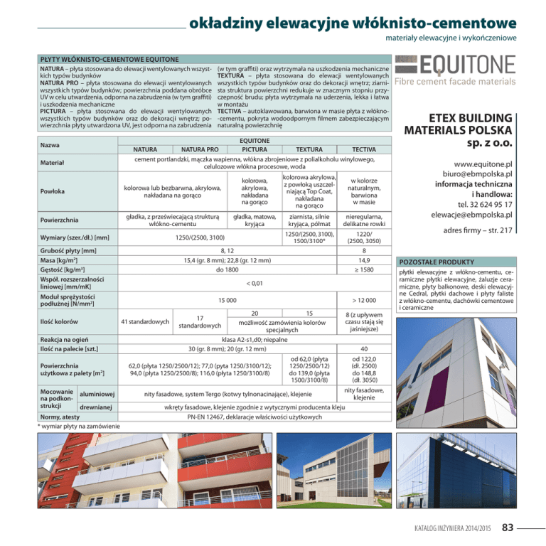 okładziny elewacyjne włóknisto-cementowe materiały elewacyjne i wykończeniowe PŁYTY WŁÓKNISTO-CEMENTOWE EQUITONE NATURA – płyta stosowana do elewacji wentylowanych wszystkich typów budynków NATURA PRO – płyta stosowana do elewacji wentylowanych wszystkich typów budynków; powierzchnia poddana obróbce UV w celu utwardzenia, odporna na zabrudzenia (w tym graffiti) i uszkodzenia mechaniczne PICTURA – płyta stosowana do elewacji wentylowanych wszystkich typów budynków oraz do dekoracji wnętrz; powierzchnia płyty utwardzona UV, jest odporna na zabrudzenia EQUITONE NATURA NATURA PRO PICTURA TEXTURA TECTIVA cement portlandzki, mączka wapienna, włókna zbrojeniowe z polialkoholu winylowego, celulozowe włókna procesowe, woda Nazwa Materiał Powłoka Powierzchnia kolorowa lub bezbarwna, akrylowa, nakładana na gorąco kolorowa, akrylowa, nakładana na gorąco kolorowa akrylowa, z powłoką uszczelniającą Top Coat, nakładana na gorąco gładka, z przeświecającą strukturą włókno-cementu gładka, matowa, kryjąca ziarnista, silnie kryjąca, półmat nieregularna, delikatne rowki 1250/(2500, 3100), 1500/3100* 1220/ (2500, 3050) 8 14,9 ≥ 1580 Wymiary (szer./dł.) [mm] 1250/(2500, 3100) Grubość płyty [mm] Masa [kg/m2] Gęstość [kg/m3] Współ. rozszerzalności liniowej [mm/mK] 8, 12 15,4 (gr. 8 mm); 22,8 (gr. 12 mm) do 1800 Ilość kolorów 15 000 41 standardowych Reakcja na ogień Ilość na palecie [szt.] Powierzchnia użytkowa z palety [m2] aluminiowej drewnianej Normy, atesty * wymiar płyty na zamówienie w kolorze naturalnym, barwiona w masie < 0,01 Moduł sprężystości podłużnej [N/mm2] Mocowanie na podkonstrukcji (w tym graffiti) oraz wytrzymała na uszkodzenia mechaniczne TEXTURA – płyta stosowana do elewacji wentylowanych wszystkich typów budynków oraz do dekoracji wnętrz; ziarnista struktura powierzchni redukuje w znacznym stopniu przyczepność brudu; płyta wytrzymała na uderzenia, lekka i łatwa w montażu TECTIVA – autoklawowana, barwiona w masie płyta z włókno-cementu, pokryta wodoodpornym filmem zabezpieczającym naturalną powierzchnię > 12 000 20 15 17 możliwość zamówienia kolorów standardowych specjalnych klasa A2-s1,d0; niepalne 30 (gr. 8 mm); 20 (gr. 12 mm) 62,0 (płyta 1250/2500/12); 77,0 (pyta 1250/3100/12); 94,0 (płyta 1250/2500/8); 116,0 (płyta 1250/3100/8) od 62,0 (płyta 1250/2500/12) do 139,0 (płyta 1500/3100/8) 8 (z upływem czasu stają się jaśniejsze) ETEX BUILDING MATERIALS POLSKA sp. z o.o. www.equitone.pl [email protected] informacja techniczna i handlowa: tel. 32 624 95 17 [email protected] adres firmy – str. 217 POZOSTAŁE PRODUKTY płytki elewacyjne z włókno-cementu, ceramiczne płytki elewacyjne, żaluzje ceramiczne, płyty balkonowe, deski elewacyjne Cedral, płytki dachowe i płyty faliste z włókno-cementu, dachówki cementowe i ceramiczne 40 od 122,0 (dł. 2500) do 148,8 (dł. 3050) nity fasadowe, klejenie wkręty fasadowe, klejenie zgodnie z wytycznymi producenta kleju PN-EN 12467, deklaracje właściwości użytkowych nity fasadowe, system Tergo (kotwy tylnonacinające), klejenie Katalog Inżyniera 2014/2015 83