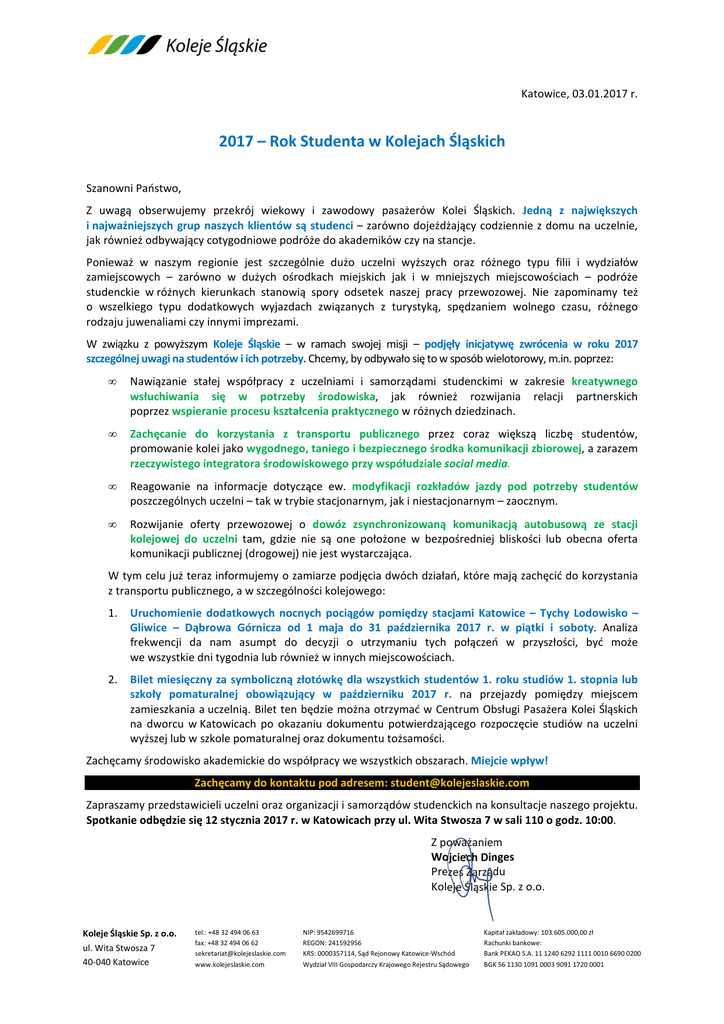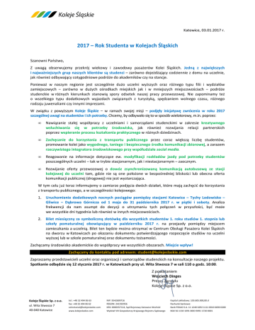 Katowice, 03.01.2017 r. 2017 – Rok Studenta w Kolejach Śląskich Szanowni Państwo, Z uwagą obserwujemy przekrój wiekowy i zawodowy pasażerów Kolei Śląskich. Jedną z największych i najważniejszych grup naszych klientów są studenci – zarówno dojeżdżający codziennie z domu na uczelnie, jak również odbywający cotygodniowe podróże do akademików czy na stancje. Ponieważ w naszym regionie jest szczególnie dużo uczelni wyższych oraz różnego typu filii i wydziałów zamiejscowych – zarówno w dużych ośrodkach miejskich jak i w mniejszych miejscowościach – podróże studenckie w różnych kierunkach stanowią spory odsetek naszej pracy przewozowej. Nie zapominamy też o wszelkiego typu dodatkowych wyjazdach związanych z turystyką, spędzaniem wolnego czasu, różnego rodzaju juwenaliami czy innymi imprezami. W związku z powyższym Koleje Śląskie – w ramach swojej misji – podjęły inicjatywę zwrócenia w roku 2017 szczególnej uwagi na studentów i ich potrzeby. Chcemy, by odbywało się to w sposób wielotorowy, m.in. poprzez: • Nawiązanie stałej współpracy z uczelniami i samorządami studenckimi w zakresie kreatywnego wsłuchiwania się w potrzeby środowiska, jak również rozwijania relacji partnerskich poprzez wspieranie procesu kształcenia praktycznego w różnych dziedzinach. • Zachęcanie do korzystania z transportu publicznego przez coraz większą liczbę studentów, promowanie kolei jako wygodnego, taniego i bezpiecznego środka komunikacji zbiorowej, a zarazem rzeczywistego integratora środowiskowego przy współudziale social media. • Reagowanie na informacje dotyczące ew. modyfikacji rozkładów jazdy pod potrzeby studentów poszczególnych uczelni – tak w trybie stacjonarnym, jak i niestacjonarnym – zaocznym. • Rozwijanie oferty przewozowej o dowóz zsynchronizowaną komunikacją autobusową ze stacji kolejowej do uczelni tam, gdzie nie są one położone w bezpośredniej bliskości lub obecna oferta komunikacji publicznej (drogowej) nie jest wystarczająca. W tym celu już teraz informujemy o zamiarze podjęcia dwóch działań, które mają zachęcić do korzystania z transportu publicznego, a w szczególności kolejowego: 1. Uruchomienie dodatkowych nocnych pociągów pomiędzy stacjami Katowice – Tychy Lodowisko – Gliwice – Dąbrowa Górnicza od 1 maja do 31 października 2017 r. w piątki i soboty. Analiza frekwencji da nam asumpt do decyzji o utrzymaniu tych połączeń w przyszłości, być może we wszystkie dni tygodnia lub również w innych miejscowościach. 2. Bilet miesięczny za symboliczną złotówkę dla wszystkich studentów 1. roku studiów 1. stopnia lub szkoły pomaturalnej obowiązujący w październiku 2017 r. na przejazdy pomiędzy miejscem zamieszkania a uczelnią. Bilet ten będzie można otrzymać w Centrum Obsługi Pasażera Kolei Śląskich na dworcu w Katowicach po okazaniu dokumentu potwierdzającego rozpoczęcie studiów na uczelni wyższej lub w szkole pomaturalnej oraz dokumentu tożsamości. Zachęcamy środowisko akademickie do współpracy we wszystkich obszarach. Miejcie wpływ! Zachęcamy do kontaktu pod adresem: [email protected] Zapraszamy przedstawicieli uczelni oraz organizacji i samorządów studenckich na konsultacje naszego projektu. Spotkanie odbędzie się 12 stycznia 2017 r. w Katowicach przy ul. Wita Stwosza 7 w sali 110 o godz. 10:00. Z poważaniem Wojciech Dinges Prezes Zarządu Koleje Śląskie Sp. z o.o. Koleje Śląskie Sp. z o.o. ul. Wita Stwosza 7 40-040 Katowice tel.: +48 32 494 06 63 fax: +48 32 494 06 62 [email protected] www.kolejeslaskie.com NIP: 9542699716 REGON: 241592956 KRS: 0000357114, Sąd Rejonowy Katowice-Wschód Wydział VIII Gospodarczy Krajowego Rejestru Sądowego Kapitał zakładowy: 103.605.000,00 zł Rachunki bankowe: Bank PEKAO S.A. 11 1240 6292 1111 0010 6690 0200 BGK 56 1130 1091 0003 9091 1720 0001
