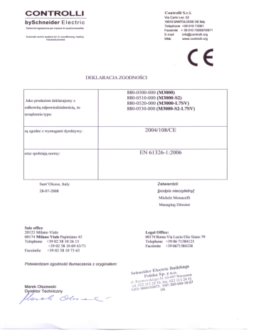 CONTROLLI bySchneider Controlli S.r.I. Via Carlo Lwi, 52 Electric 16010 SANTOLCESE GE ltaly Telephone Sistemidl regolazione per impianti di candnmnameMa, Facsimile Automatk rontrol systems for 4;r corcdIIionsng. heatinj), Wlduswialprocess +3901073061 + 39 010 73OS870/871 E-mail info@controllLorg Web www.controlli.org DEKLARACJA ZGODNOŚCI Jako producent deklarujemy z całkowitą odpowiedzialnością, że 880-0500-000 880-0510-000 880-0520-000 880-0530-000 (M3000) (M3000-S2) (M3000-L 7SV) (M3000-S2-L 7SV) urządzenia typu: 2004/108/CE są zgodne z wymogami dyrektywy: EN 61326-1 :2006 oraz spełniają normy: Sant'Olcese, Zatwierdził: Italy [podpis nieczytelny] 28-07-2008 Michele Monacelli Managing Director Sale office 20123 Milano Viale 00174 Milano Via le Papiniano 45 Telephone +390258 1026 15 +390258 10 69 43/71 Facsimlie + 3902 58 10 73 65 Potwierdzam zgodność tłumaczenia z oryginałem: LegalOffice: 00174 Roma Via Lucio Elio Siano 79 Telephone +390671584125 Facsimite +390671584338 "c 'Bulld,ngs "der E\ectrt e Schn \ S z 0.0. polska _p. "'1-697 Warszawa \ li· icl. Marek Olszewski ~/ktor ~ R1\lm)\\5 \;.i-:no )3.0.,l" 24 \1 :: l' x 022.J.J 27 \ O, a '. 585-000- \82873 NIP. 0',"'1'1324 ---' KRS: 0000\0 TeC~CZny c9-r?-7 \4)