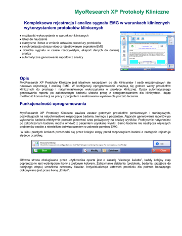 MyoResearch XP Protokoły Kliniczne Kompleksowa rejestracja i analiza sygnału EMG w warunkach klinicznych wykorzystaniem protokołów klinicznych możliwość wykorzystania w warunkach klinicznych łatwy do nauczenia elastyczne i łatwe w zmianie ustawień procedury protokołów synchronizacja obrazu video z rejestrowanym sygnałem EMG obróbka sygnału w czasie rzeczywistym, eksport danych do dalszej analizy automatyczne generowanie raportów z analizy Opis MyoResearch XP Protokoły Kliniczne jest idealnym narzędziem do dla klinicystów I osób niezajmujących się naukowo rejestracją I analizą EMG. W konfiguracji oprogramowania znajdują się gotowe wzory protokołów klinicznych do prostego i natychmiastowego wykorzystania w praktyce klinicznej. Opcja automatycznego generowania raportu po zakończonym badaniu ułatwia pracę z oprogramowaniem dla klinicystów., dając możliwość koncentracji na pracy z pacjentem i analizowaniu wyników dla potrzeb leczenia. Funkcjonalność oprogramowania MyoResearch XP Protokoły Kliniczne zawiera zestaw gotowych protokołów pomiarowych I treningowych, pozwalających na natychmiastowe rozpoczęcie badania, treningu z pacjentem. Algorytm generowania raportów po wykonaniu badania efektywnie pozwala planować czas poświęcony na analizę wyników. Praktycznie natychmiast po zakończonym badaniu można omówić z pacjentem uzyskane wyniki, Samo badanie nie nastręcza większych problemów osobie z niewielkim doświadczeniem w zakresie pomiaru EMG. W kilku prostych krokach przechodzi się przez kolejne etapy przed rozpoczęciem badani a następnie rejestruje się jego przebieg. Główna strona obsługiwana przez użytkownika oparta jest o zasadę “zielnego światła”, każdy kolejny etap poprzedzony jest wciśnięciem ikony z zielonym kolorem. Zatrzymanie działania (protokołu, badania, przejścia do kolejnego etapu) umożliwia czerwony klawisz. Indywidualizacja ustawień protokołu dla potrzeb badającego dokonywana jest przez ikonę „Zmień”. MyoResearch XP Protokoły Kliniczne Łatwość stosowania klinicznych protokołów pomiarowych Proponowane protokoły kliniczne wykorzystywane są podczas oceny siły mięśniowej (testów siły mięśniowej, analizy wzorców ruchowych (chód, przysiad, inne), treningu sportowego, ocenie dla celów ergonomicznych. Protokoły do monitorowania wykonania ćwiczenia z opcją biofeedback’u stosowane są w celu poprawy skuteczności wprowadzanych ćwiczeń i dokładności ich wykonania przez wybrane grupy mięśniowe. Poniżej przedstawiono sekwencję kroków do rozpoczęcia pomiaru. W 4 kolejnych krokach rozpocząć można rejestrację sygnału a następnie analizę EMG lub sygnału z innych czujników biomechanicznych. Krok 2 Krok 1 Pomiar St Potwierdź lub stwórz Step 2 ep 1 Krok 3 Krok 4 Step Zdefiniuj fazy 3 zapisu do analizy Step Przejrzyj& 4 wydrukuj raport Wymagania do instalacji oprogramowania Procesor: AMD lub Intel > 1 GHz Karta graficzna: 32 MB RAM, Direct X 8.1 Pamięć: 256 MB RAM, 40 GB HDD Interfejs: USB lub FireWire (DV-Video) System: Windows XP home lub Professional Microsoft MPEG 4 lub Div.X 5.1 Codecs Zalecany system: laptop lub PCs Lista przykładowych protokołów i ich zastosowań Standardowa analiza sygnału EMG Uniwersalny protokół dla zapisu aktywności mięśniowej EMG Podstawowa rejestracja parametrów (szczytowa I średnia wartość) w wybranych obszarach zapisu Tworzenie wykresów standardowych I histogramów z dokonanego zapisu Stworzony do ogólnej analizy sygnału Ocena symetrii Porównanie strony zajętej i niezajętej Pomiar czynności ruchowych obustronnych Przedstawia wzorzec aktywności mięśniowej i dane statystyczne z wykresem (histogram) Ocena (porównanie) różnicy unerwienia (deficytów) pomiędzy stroną prawą I lewą MyoResearch XP Protokoły Kliniczne Ocena koordynacji Analiza koordynacji pomiędzy agonistami I antagonistami Pomiar czynności jednostronnych I funkcjonalnych Prezentacja wzorca aktywności mięśniowej I danych w formie graficznej (histogram) ocena koordyancji neuromotorycznej Ocena wzorców aktywności EMG tworzenie uśrednionych I normalizowanych w czasie wzorców sygnału EMG stosowany do oceny powtarzalnych czynności ruchowych lub ćwiczeń możliwość normalizacji sygnału (MVC) analiza typowych wzorców innerwacji grup mięśniowych Trening z biofeedbackiem przedstawienie sygnału w postaci biofeedback’u pomoc wizualna I akustyczna podczas treningu z biofeedbackiem możliwość normalizacji sygnału (MVC) podczas planowania treningu i ustalanie progu aktywności ułatwia prowadzenie precyzyjnego I obiektywnego treningu mięśniowego w zaburzeniach (dysfunkcjach) mięśniowych Trening nietrzymania moczu wyświetlenie pracy mięśni w formie kurczącego się okręgu pomoc wizualna I akustyczna podczas treningu z biofeedbackiem zapis czynności ruchowych z fazami: spoczynkowej, szybkich skurczy maksymalnych napięć, napięć z utrzymanie (wytrzymałość) umiejętność relaksacji. Trening z wzorcami ćwiczeń trening z biofeedbackiem oparty na ustalonych wzorcach/protokołach ćwiczeń ustalenie parametrów ćwiczenia w oparciu o sygnał EMG/ustawienie kątowe/wartość siły z wykorzystaniem strony zdrowej jako wzorca dokładność ćwiczenia w stosunku do ustalonego wzorca uniwersalność tworzenia ćwiczeń do założonej koncepcji reedukacji neuromotorycznej