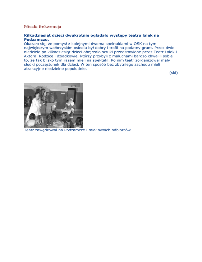 Kilkadziesiąt dzieci dwukrotnie oglądało występy teatru lalek na Podzamczu. Okazało się, że pomysł z kolejnymi dwoma spektaklami w OSK na tym największym wałbrzyskim osiedlu był dobry i trafił na podatny grunt. Przez dwie niedziele po kilkadziesiąt dzieci obejrzało sztuki przedstawione przez Teatr Lalek i Aktora. Rodzice i dziadkowie, którzy przybyli z maluchami bardzo chwalili sobie to, że tak blisko tym razem mieli na spektakl. Po nim teatr zorganizował mały słodki poczęstunek dla dzieci. W ten sposób bez zbytniego zachodu mieli atrakcyjne niedzielne popołudnie. (ski) Teatr zawędrował na Podzamcze i miał swoich odbiorców