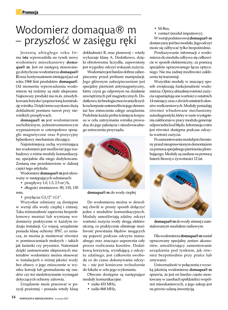 Promocja Wodomierz domaqua® m – przyszłość w zasięgu ręki Jesienią ubiegłego roku firma ista wprowadziła na rynek nowy wodomierz mieszkaniowy domaqua® m. Jest on następcą stosowanego dotychczas wodomierza domaqua® II oraz kontynuatorem istniejącej już od roku 1968 linii produktów domaqua®. Od momentu wprowadzenia wodomierze tej rodziny są stale ulepszane. Najnowszy produkt ma m.in. zmodyfikowane łożysko i poprawioną konstrukcję wirnika. Dzięki temu uzyskano dużą dokładność pomiaru nawet przy niewielkich przepływach. domaqua® m jest wodomierzem suchobieżnym, jednostrumieniowym wyposażonym w czteropolowe sprzęgło magnetyczne oraz 8-pozycyjny bębenkowy mechanizm zliczający. Najistotniejszą cechą wyróżniającą ten wodomierz jest możliwość jego rozbudowy o różne moduły komunikacyjne, specjalnie dla niego dedykowane. Zostaną one przedstawione w dalszej części tego artykułu. Wodomierz domaqua® m jest oferowany w następujących odmianach: • przepływy 1.0, 1.5, 2.5 m3/h, • długości montażowe: 80, 110, 130 mm, • przyłącza: G1/2” i G1”. Wszystkie odmiany są dostępne w wersji dla wody ciepłej i zimnej. Taka różnorodność zapewnia bezproblemowy montaż lub wymianę wodomierzy praktycznie w każdym rodzaju instalacji. Co więcej, urządzenie posiada klasę ochrony IP67, co oznacza, że można je montować również w pomieszczeniach mokrych – takich jak łazienki czy prysznice. Natomiast dzięki zastosowaniu ulepszonych materiałów wodomierz można stosować w instalacjach o różnej jakości wody bez obawy o jego zniszczenie w wyniku korozji lub gromadzenia się osadów czy też niedotrzymanie wymagań dotyczących ochrony zdrowia. Urządzenie może pracować w pozycji poziomej – posiada wtedy klasę 14 Wspólnota Mieszkaniowa wrzesień 2007 dokładności B, oraz pionowej – wtedy wykazuje klasę A. Dodatkowo, dzięki obrotowemu liczydłu, zapewniony jest wygodny odczyt wskazań zużycia. Wodomierz jest bardzo dobrze zabezpieczony przed próbami manipulacji. Jego głównym zabezpieczeniem jest specjalny pierścień antymagnetyczny, który czyni go odpornym na działanie zewnętrznych pól magnetycznych. Dodatkowo, technologia mocowania liczydła na korpusie uniemożliwia jego demontaż bez zniszczenia całego urządzenia. Podobnie każda próba ściśnięcia korpusu w celu zatrzymania wirnika prowadzą do jego pęknięcia i nieodwracalnego zniszczenia przyrządu. • M-Bus, • contact (moduł impulsowy). W wersji podstawowej domaqua® m dostarczany jest bez modułu. Jego odczyt może się odbywać tylko bezpośrednio. Przekazywanie informacji z wodomierza do modułu odbywa się całkowicie w sposób elektroniczny, za pomocą specjalnie opracowanego łącza optycznego. Nie ma żadnej możliwości zakłócenia tej transmisji. Wszystkie moduły w znaczący sposób zwiększają funkcjonalność wodomierza. Oprócz aktualnej wartości zużycia zapamiętują one wartości z ostatnich 14 miesięcy oraz z dwóch ostatnich okresów rozliczeniowych. Moduły posiadają również wbudowane mechanizmy autodiagnostyki, który w razie wystąpienia zakłócenia w pracy modułu generuje odpowiedni kod błędu. Informacja o nim jest również dostępna podczas odczytu wartości zużycia. Po zamontowaniu moduł jest chroniony przed nieuprawnionym demontażem za pomocą specjalnego pierścienia plombującego. Moduły są zasilane za pomocą baterii litowej o żywotności 12 lat. domaqua® m do wody ciepłej Do wodomierza można w dowolnej chwili w prosty sposób dołączyć jeden z modułów komunikacyjnych. Moduły umożliwiają zdalny odczyt wartości zużycia wody drogą elektroniczną, co praktycznie eliminuje możliwość powstania błędów mogących się pojawić podczas odczytu manualnego oraz znacząco usprawnia cały proces rozliczenia kosztów. Dodatkową korzyścią, wynikającą z odczytu zdalnego, jest całkowita swoboda co do czasu dokonywania odczytu – nie jest konieczne wchodzenie do lokalu w celu jego wykonania. Obecnie dostępne są następujące moduły komunikacyjne: • radio 433 MHz, • radio 868 MHz, domaqua® m do wody zimnej z zainstalowanym modułem radiowym Dla wodomierza domaqua® m został opracowany specjalny zestaw akcesoriów, umożliwiający zamontowanie urządzenia pod tynkiem, jak również bezpośrednio przy pralce lub zmywarce. Uniwersalność w połączeniu z wysoką jakością wodomierza domaqua® m sprawia, że jest on bardzo często montowany w zasobach spółdzielni i wspólnot mieszkaniowych, a jego zakup jest na pewno udaną inwestycją.