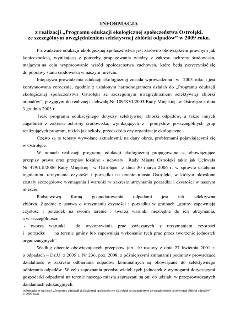 INFORMACJA z realizacji „Programu edukacji ekologicznej społeczeństwa Ostrołęki, ze szczególnym uwzględnieniem selektywnej zbiórki odpadów” w 2009 roku. Prowadzenie edukacji ekologicznej społeczeństwa jest zarówno obowiązkiem prawnym jak koniecznością, wynikającą z potrzeby propagowania wiedzy z zakresu ochrony środowiska, mającym na celu wypracowanie wśród społeczeństwa zachowań, które będą przyczyniać się do poprawy stanu środowiska w naszym mieście. Inicjatywa prowadzenia edukacji ekologicznej została wprowadzona w 2003 roku i jest kontynuowana corocznie, zgodnie z ustalonym harmonogramem działań do „Programu edukacji ekologicznej społeczeństwa Ostrołęki ze szczególnym uwzględnieniem selektywnej zbiórki odpadów”, przyjętym do realizacji Uchwałą Nr 109/XVI/2003 Rady Miejskiej w Ostrołęce z dnia 3 grudnia 2003 r. Treść programu edukacyjnego dotyczy selektywnej zbiórki odpadów, a takŜe innych zagadnień z zakresu ochrony środowiska, wynikających z pomysłów poszczególnych grup realizujących program, takich jak szkoły, przedszkola czy organizacje ekologiczne. Często są to tematy wywołane aktualnymi, na dany okres, problemami pojawiającymi się w Ostrołęce. W ramach realizacji programu edukacji ekologicznej propagowane są obowiązujące przepisy prawa oraz przepisy lokalne - uchwały Rady Miasta Ostrołęki takie jak Uchwała Nr 479/LII/2006 Rady Miejskiej w Ostrołęce z dnia 30 marca 2006 r. w sprawie ustalenia regulaminu utrzymania czystości i porządku na terenie miasta Ostrołęki, w którym określone zostały szczegółowe wymagania i warunki w zakresie utrzymania porządku i czystości w naszym mieście. Podstawową formą gospodarowania odpadami jest ich selektywna zbiórka. Zgodnie z ustawą o utrzymaniu czystości i porządku w gminach „gminy zapewniają czystość i porządek na swoim terenie i tworzą warunki niezbędne do ich utrzymania, a w szczególności: - tworzą i porządku warunki do wykonywania prac związanych z utrzymaniem czystości na terenie gminy lub zapewniają wykonanie tych prac przez tworzenie jednostek organizacyjnych”. Według obecnie obowiązujących przepisów (art. 10 ustawy z dnia 27 kwietnia 2001 r. o odpadach – Dz.U. z 2005 r. Nr 236, poz. 2008, z późniejszymi zmianami) podmioty prowadzące działalność w zakresie odbierania odpadów komunalnych są obowiązane do selektywnego odbierania odpadów. W celu zapoznania przedstawicieli tych jednostek z wymogami dotyczącymi gospodarki odpadami na terenie naszego miasta zapraszani są oni do udziału w przeprowadzanych działaniach edukacyjnych. Informacja o realizacji „Programu edukacji ekologicznej społeczeństwa Ostrołęki ze szczególnym uwzględnieniem selektywnej zbiórki odpadów” w 2009 roku Podjęto działania w zakresie informowania społeczeństwa odnośnie prawidłowego sposobu prowadzenia gospodarki odpadami oraz wykonywania selektywnej zbiórki „u źródła” czyli w gospodarstwach domowych. Doświadczenia z lat ubiegłych pozwoliły wysnuć wnioski, iŜ działania te powinny być kontynuowane, poniewaŜ większa świadomość społeczeństwa będzie owocować lepszymi efektami w zakresie ochrony naszego środowiska, co z kolei ułatwi osiągnięcie wymogów wynikających z obowiązujących przepisów prawa. W celu zapoznania z propozycjami zadań i zachęcenia do włączenia się w realizację programu, harmonogram działań (będący załącznikiem do ww. programu) pismem znak: GKOŚ.7614-3-1/09 z dnia 25.02.2009 r., przesłano do: 1) „Rozmaitości Ostrołęckich, 2) „Tygodnika Ostrołęckiego 3) przedszkoli, 4) szkół podstawowych, gimnazjów szkół i ponadgimnazjalnych, 5) Przewodniczących Zarządów wszystkich ostrołęckich osiedli mieszkaniowych. Zaapelowano o zaangaŜowanie się w realizację programu i włączenie się w akcję edukacyjną. Otrzymaliśmy propozycję od szkół, przedszkoli, Ostrołęckiego Hufca Harcerek „Naturae”, Stowarzyszenia „EKOMENA”, Klubu Sportowego Unia Basket, Agencji Informedia oraz niektórych samorządów osiedlowych. Realizacja tych działań będzie szczegółowo opisana w dalszej części informacji. Ponadto naleŜy stwierdzić, iŜ program edukacji ekologicznej był realizowany w kaŜdej szkole i wynika to z programów szkolnych. Elementem mobilizującym do większego zaangaŜowania się nauczycieli i przedstawicieli samorządów osiedlowych, jest proponowana moŜliwość dofinansowania zaproponowanych działań. W terminie od 25 maja 2009 roku do 17 czerwca 2009 roku. ogłoszono konkurs na zbiórkę baterii. Poinformowano szkoły o zamiarze przeprowadzenia konkursu na zbiórkę baterii w szkołach i poproszono o przygotowanie uczniów do ewentualnego udziału w konkursie. W bieŜącym roku Organizacja Odzysku „REBA” nawiązała współpracę z Przedsiębiorstwem Veolia Usługi dla Środowiska S.A. i w związku z tym zebrane baterie były w dniu 17 czerwca dostarczone do siedziby Veolii, ul. Kurpiowska 12. Wszystkie szkoły, które zadeklarowały chęć wzięcia udziału w konkursie otrzymały pojemniki do zbiórki baterii. W konkursie wzięło udział 11 szkół. W 2009 roku zebrano aŜ 1873,38 kg baterii, które zostały odebrane przez Organizację Odzysku Baterii „REBA”. MoŜna sądzić, Ŝe tak duŜa ilość zebranych baterii świadczy o zaangaŜowaniu w te działania takŜe członków rodziny. Informacja o realizacji „Programu edukacji ekologicznej społeczeństwa Ostrołęki ze szczególnym uwzględnieniem selektywnej zbiórki odpadów” w 2009 roku Strona 2 z 7 Na podstawie sporządzonego wykazu zebranych baterii, które waŜone były w obecności przedstawiciela szkoły w chwili dostarczenia baterii do Przedsiębiorstwa Veolia, komisja konkursowa wyłoniła zwycięzców konkursu zgodnie z kryteriami ustalonymi w Regulaminie Konkursu, którymi zostały następujące szkoły: 1. Zespół Szkół Nr 4 – 238,6 kg, w przeliczeniu
