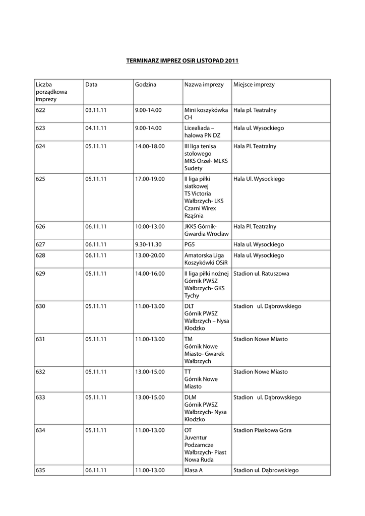 TERMINARZ IMPREZ OSiR LISTOPAD 2011 Liczba porządkowa imprezy Data Godzina Nazwa imprezy Miejsce imprezy 622 03.11.11 9.00-14.00 Mini koszykówka Hala pl. Teatralny CH 623 04.11.11 9.00-14.00 Licealiada – halowa PN DZ 624 05.11.11 14.00-18.00 III liga tenisa Hala Pl. Teatralny stołowego MKS Orzeł- MLKS Sudety 625 05.11.11 17.00-19.00 II liga piłki siatkowej TS Victoria Wałbrzych- LKS Czarni Wirex Rząśnia 626 06.11.11 10.00-13.00 JKKS GórnikHala Pl. Teatralny Gwardia Wrocław 627 06.11.11 9.30-11.30 PG5 628 06.11.11 13.00-20.00 Amatorska Liga Hala ul. Wysockiego Koszykówki OSiR 629 05.11.11 14.00-16.00 II liga piłki nożnej Stadion ul. Ratuszowa Górnik PWSZ Wałbrzych- GKS Tychy 630 05.11.11 11.00-13.00 DLT Stadion ul. Dąbrowskiego Górnik PWSZ Wałbrzych – Nysa Kłodzko 631 05.11.11 11.00-13.00 TM Górnik Nowe Miasto- Gwarek Wałbrzych Stadion Nowe Miasto 632 05.11.11 13.00-15.00 TT Górnik Nowe Miasto Stadion Nowe Miasto 633 05.11.11 13.00-15.00 DLM Górnik PWSZ Wałbrzych- Nysa Kłodzko Stadion ul. Dąbrowskiego 634 05.11.11 11.00-13.00 OT Juventur Podzamcze Wałbrzych- Piast Nowa Ruda Stadion Piaskowa Góra 635 06.11.11 11.00-13.00 Klasa A Stadion ul. Dąbrowskiego Hala ul. Wysockiego Hala Ul. Wysockiego Hala ul. Wysockiego Zagłębie WałbrzychBystrzyca Dolna 636 08.11.11 9.00-14.00 Mini koszykówka Hala pl. Teatralny CH 637 08.11.11 12.30-15.30 Szkolna liga koszykówki Hala Pl. Teatralny 638 09.11.11 9.00-14.00 Licealiada – halowa PN DZ i CH finał Hala ul. Wysockiego 639 10.11.11 9.00-14.00 Mini koszykówka Hala Pl. Teatralny DZ 640 11.11.11 11.00-13.00 Klasa A Górnik PWSZ Wałbrzych- Unia Jaroszów Boisko ul. Ratuszowa 641 11.11.11 11.00-13.00 Klasa B Górnik Nowe Miasto- Zdrój Jedlina Zdrój Stadion Nowe Miasto 642 11.11.11 11.00-13.00 DLT Górnik PWSZ WałbrzychParasol Wrocław Stadion ul. Dąbrowskiego 643 11.11.11 13.00-15.00 DLM Górnik PWSZ WałbrzychParasol Wrocław Stadion ul. Dabrowskiego 644 12.11.11 13.00-15.00 II Liga Górnik PWSZCzarni Żagań Stadion ul. Ratuszowa 645 12.11.11 17.00-19.00 II Liga piłki siatkowej TS Victoria Wałbrzych- AZS Politechnika Opolska Cementownia Odra Hala ul. Wysockiego 646 12.11.11 11.00-13.00 DLJ Górnik PWSZ WałbrzychKarkonosze Jelenia Góra Boisko ul. Ratuszowa 647 13.11.11. 9.00-11.00 JKKS GórnikNysa Kłodzko Hala p. Teatralny 648 13.11.11 11.30-14.30 TS Victoria Hala PL. Teatralny Wałbrzych- ULKS Młodzik Bystrzyca Oławska 649 12.11.11 13.00-15.00 DLJM Górnik PWSZ Wałbrzych- Boisko ul. Ratuszowa Karkonosze Jelenia Góra 650 13.11.11 13.00-20.00 Amatorska Liga Koszykówki Hala ul. Wysockiego 651 13.11.11 11.00-13.00 Klasa A Zagłębie WałbrzychWłókniarz Głuszyca Stadion ul. Dąbrowskiego 652 15.11.11 12.30-15.30 Szkolna Liga Koszykówki Hala pl. Teatralny 653 15.11.11 9.00-14.00 Mini koszykówka Hala Pl. Teatralny DZ 654 16.11.11 9.00-14.00 Licealiada – koszykówka CH 655 17.11.11 9.00-14.00 Mini koszykówka Hala PL. Teatralny CH- finał 656 17.11.11 1.11.2000 Czwartki Lekkoatletyczne Hala Lekkoatletyczna przy ul. Chopina 657 18.11.11 9.00-14.00 Licealadakoszykówka DZ Hala ul Wysockiego 658 18.11.2011 18.00-20.00 Dolnośląska Gala Aula PWSZ ul. Kolarska Zamkowa 659 19.11.11 14.00-18.00 III liga tenis stołowy MKS Orzeł- ULKS Żok Hala Pl. Teatralny 660 19.11.11 18.00-20.00 III Liga koszykówki KK WałbrzychZastal Zielona Góra Hala Pl. Teatralny 661 19.11.11 9.00-19.00 Puchar Polski w stylu klasycznym – w zapasach juniorów. Memoriał Bogusława Dąbrowskiego Hala ul. Wysockiego 662 19.11.11 11.00-13.00 DLT Górnik PWSZ Wałbrzych – FC Wrocław Academy Boisko ul. Ratuszowa 663 19.11.2011 12.30 - ____ JKKS Górnik - WKS Śląsk Wrocław Hala pl. Teatralny 664 19.11.11 13.00-15.00 DLM Górnik PWSZ Wałbrzych- FC Wrocław Academy Boisko ul. Ratuszowa Hala ul. Wysockiego 665 19.11.2011 11.00 – 13.00 MKS Szczawno Zdrój - Piast Nowa Ruda klasa okręgowa seniorów Obiekt Ratuszowa - boisko boczne sztuczna trawa 666 19.11.2011 14.00-16.00 Klasa A Zagłębie WałbrzychCzarni Wamag Wałbrzych Stadion ul. Dąbrowskiego 667 20.11.11 10.00-12.00 JKKS GórnikGimbasket Wrocław Hala pl. Teatralny 668 20.11.11 8.00-17.00 Turniej Urbanowicza Hala ul. Wysockiego 669 22.11.11 9.00-14.00 Licealiada – koszykówka DZ Hala Pl. Teatralny 670 22.11.11 12.30-15.30 Szkolna liga koszykówki Hala pl. Teatralny 671 23.11.11 9.00-14.00 Licealiada koszykówka CH Hala ul. Wysockiego 672 24.11.11 9.00-14.00 Mini Koszykówka Hala pl. Teatralny CH- finał 673 25.11.11 9.00-14.00 Licealiada Hala ul. Wysockiego koszykówka CH finał 674 25.11.2011 18.00 – 2.00 Mistrzostwa Wałbrzycha Zakładów Pracy w halowa piłkę nozną Hala ul. Wysockiego 675 26.11.11 9.30-11.00 JKKS GórnikGórnik Nowe Miasto Hala Pl. Teatralny 676 26.11.11 11.00-15.00 Turniej Mini Kosz Hala pl. Teatralny 677 26.11.11 17.00-19.-- II Liga piłki Hala ul. Wysockiego siatkowej TS Victoria PWSZKlub siatkarski AZS Rafako Racibórz 678 27.11.11 10.00-13.00 JKKS Górnik Wałbrzych- WKK II Wrocław Hala Pl. Teatralny. 679 27.11.2011 11.00 – 13.00 MKS Szczawno - Obiekt Ratuszowa - boisko boczne Zdrój - Unia Złoty sztuczna trawa Stok- klasa okręgowa seniorów 680 27.11.11 9.00-14.00 Turniej siatkówki dziewcząt – Chełmiec Wałbrzych Hala ul Wysockiego 681 27.11.11 14.00-21.00 Amatorska liga koszykówki OSiR Hala ul. Wysockiego 682 27.11.11 13.00-15.00 Klasa A Górnik PWSZ WałbrzychGwarek Wałbrzych Boisko ul. Ratuszowa 683 27.11.11 13.00-15.00 Klasa A Zagłębie Wałbrzych – Skalnik Czarny Bór Stadion ul. Dąbrowskiego 684 29.11.11 9.00-14.00 Licealiada – koszykówka DZfinał Hala pl. Teatralny 685 29.11.11 12.30-15.30 Szkolna liga koszykówki Hala pl Teatralny 686 30.11.11 9.00-14.00 Gimnazjada -półfinały Hala ul. Wysockiego Sporządził: Jan Szymczak