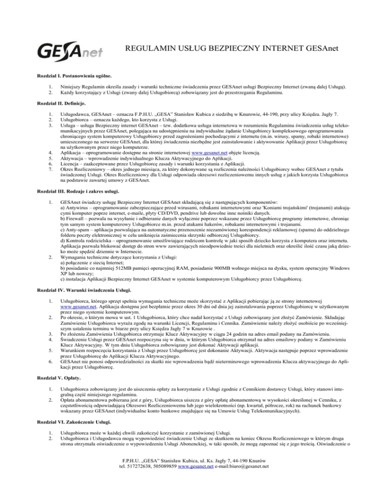 REGULAMIN USŁUG BEZPIECZNY INTERNET GESAnet Rozdział I. Postanowienia ogólne. 1. 2. Niniejszy Regulamin określa zasady i warunki techniczne świadczenia przez GESAnet usługi Bezpieczny Internet (zwaną dalej Usługą). Każdy korzystający z Usługi (zwany dalej Usługobiorcą) zobowiązany jest do przestrzegania Regulaminu. Rozdział II. Definicje. 1. 2. 3. 4. 5. 6. 7. Usługodawca, GESAnet – oznacza F.P.H.U. „GESA” Stanisław Kubica z siedzibą w Knurowie, 44-190, przy ulicy Księdza. Jagły 7. Usługobiorca – oznacza każdego, kto korzysta z Usługi. Usługa – usługa Bezpieczny internet GESAnet – tzw. dodatkowa usługa internetowa w rozumieniu Regulaminu świadczenia usług telekomunikacyjnych przez GESAnet, polegająca na udostępnieniu na indywidualne żądanie Usługobiorcy kompleksowego oprogramowania chroniącego system komputerowy Usługobiorcy przed zagrożeniami pochodzącymi z internetu (m.in. wirusy, spamy, robaki internetowe) umieszczonego na serwerze GESAnet, dla której świadczenia niezbędne jest zainstalowanie i aktywowanie Aplikacji przez Usługobiorcę na użytkowanym przez niego komputerze. Aplikacja – oprogramowanie dostępne na stronie internetowej www.gesanet.net objęte licencją. Aktywacja – wprowadzenie indywidualnego Klucza Aktywacyjnego do Aplikacji. Licencja – zaakceptowane przez Usługobiorcę zasady i warunki korzystania z Aplikacji. Okres Rozliczeniowy – okres jednego miesiąca, za który dokonywane są rozliczenia należności Usługobiorcy wobec GESAnet z tytułu świadczonej Usługi. Okres Rozliczeniowy dla Usługi odpowiada okresowi rozliczeniowemu innych usług z jakich korzysta Usługobiorca na podstawie zawartej umowy z GESAnet. Rozdział III. Rodzaje i zakres usługi. 1. 2. GESAnet świadczy usługę Bezpieczny Internet GESAnet składającą się z następujących komponentów: a) Antywirus – oprogramowanie zabezpieczające przed wirusami, robakami internetowymi oraz 'Koniami trojańskimi' (trojanami) atakującymi komputer poprze internet, e-maile, płyty CD/DVD, pendrive lub dowolne inne nośniki danych. b) Firewall – pozwala na wysyłanie i odbieranie danych wyłącznie poprzez wskazane przez Usługobiorcę programy internetowe, chroniąc tym samym system komputerowy Usługobiorce m.in. przed atakami hakerów, robakami internetowymi i trojanami. c) Anty-spam – aplikacja pozwalająca na automatyczne przenoszenie niezamówionej korespondencji reklamowej (spamu) do oddzielnego folderu poczty elektronicznej w celu uniknięcia zaśmiecenia skrzynki odbiorczej Usługobiorcy. d) Kontrola rodzicielska – oprogramowanie umożliwiające rodzicom kontrolę w jaki sposób dziecko korzysta z komputera oraz internetu. Aplikacja pozwala blokować dostęp do stron www zawierających nieodpowiednie treści dla nieletnich oraz określić ilość czasu jaką dziecko może spędzić dziennie w Internecie. Wymagania techniczne dotyczące korzystania z Usługi: a) połączenie z siecią Internet; b) posiadanie co najmniej 512MB pamięci operacyjnej RAM, posiadanie 900MB wolnego miejsca na dysku, system operacyjny Windows XP lub nowszy; c) instalacja Aplikacji Bezpieczny Internet GESAnet w systemie komputerowym Usługobiorcy przez Usługobiorcę. Rozdział IV. Warunki świadczenia Usługi. 1. 2. 3. 4. 5. 6. Usługobiorca, którego sprzęt spełnia wymagania techniczne może skorzystać z Aplikacji pobierając ją ze strony internetowej www.gesanet.net. Aplikacja dostępna jest bezpłatnie przez okres 30 dni od dnia jej zainstalowania poprzez Usługobiorcę w użytkowanym przez niego systemie komputerowym. Po okresie, o którym mowa w ust. 1 Usługobiorca, który chce nadal korzystać z Usługi zobowiązany jest złożyć Zamówienie. Składając Zamówienie Usługobiorca wyraża zgodę na warunki Licencji, Regulaminu i Cennika. Zamówienie należy złożyć osobiście po wcześniejszym ustaleniu terminu w biurze przy ulicy Księdza Jagły 7 w Knurowie . Po złożeniu Zamówienia Usługobiorca otrzymuje Klucz Aktywacyjny w ciągu 24 godzin na adres email podany na Zamówieniu. Świadczenie Usługi przez GESAnet rozpoczyna się w dniu, w którym Usługobiorca otrzymał na adres emailowy podany w Zamówieniu Klucz Aktywacyjny. W tym dniu Usługobiorca zobowiązany jest dokonać Aktywacji aplikacji. Warunkiem rozpoczęcia korzystania z Usługi przez Usługobiorcę jest dokonanie Aktywacji. Aktywacja następuje poprzez wprowadzenie przez Usługobiorcę do Aplikacji Klucza Aktywacyjnego. GESAnet nie ponosi odpowiedzialności za skutki nie wprowadzenia bądź nieterminowego wprowadzenia Klucza aktywacyjnego do Aplikacji przez Usługobiorcę. Rozdział V. Opłaty. 1. 2. Usługobiorca zobowiązany jest do uiszczenia opłaty za korzystanie z Usługi zgodnie z Cennikiem dostawcy Usługi, który stanowi integralną część niniejszego regulaminu. Opłata abonamentowa pobierana jest z góry, Usługobiorca uiszcza z góry opłatę abonamentową w wysokości określonej w Cenniku, z częstotliwością odpowiadającą Okresowi Rozliczeniowemu lub jego wielokrotności (np. kwartał, półrocze, rok) na rachunek bankowy wskazany przez GESAnet (indywidualne konto bankowe znajdujące się na Umowie Usług Telekomunikacyjnych). Rozdział VI. Zakończenie Usługi. 1. 2. Usługobiorca może w każdej chwili zakończyć korzystanie z zamówionej Usługi. Usługobiorca i Usługodawca mogą wypowiedzieć świadczenie Usługi ze skutkiem na koniec Okresu Rozliczeniowego w którym druga strona otrzymała oświadczenie o wypowiedzeniu Usługi Abonenckiej, w taki sposób, że mogą zapoznać się z jego treścią. Oświadczenie o F.P.H.U. „GESA” Stanisław Kubica, ul. Ks. Jagły 7, 44-190 Knurów tel. 517272638, 505089859 www.gesanet.net e-mail:[email protected] wypowiedzeniu powinno być złożone na piśmie, za pośrednictwem poczty elektronicznej, o ile nie stoją temu na przeszkodzie techniczne możliwości, bądź w inny sposób przewidziany przez GESAne