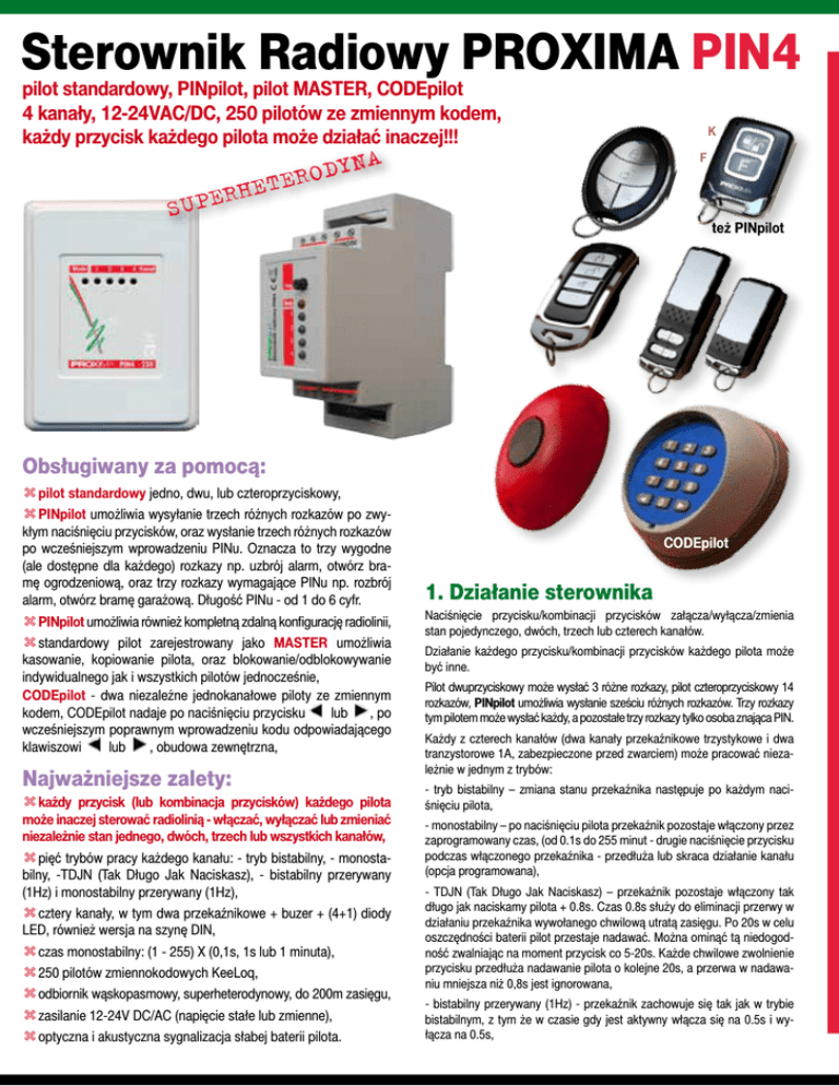 Sterownik Radiowy PROXIMA PIN4 pilot standardowy, PINpilot, pilot MASTER, CODEpilot 4 kanały, 12-24VAC/DC, 250 pilotów ze zmiennym kodem, każdy przycisk każdego pilota może działać inaczej!!! F ROD HETE R SUPE YNA K też PINpilot Obsługiwany za pomocą: tpilot standardowy jedno, dwu, lub czteroprzyciskowy, tPINpilot umożliwia wysyłanie trzech różnych rozkazów po zwy- kłym naciśnięciu przycisków, oraz wysłanie trzech różnych rozkazów po wcześniejszym wprowadzeniu PINu. Oznacza to trzy wygodne (ale dostępne dla każdego) rozkazy np. uzbrój alarm, otwórz bramę ogrodzeniową, oraz trzy rozkazy wymagające PINu np. rozbrój alarm, otwórz bramę garażową. Długość PINu - od 1 do 6 cyfr. tPINpilot umożliwia również kompletną zdalną konfigurację radiolinii, tstandardowy pilot zarejestrowany jako MASTER umożliwia kasowanie, kopiowanie pilota, oraz blokowanie/odblokowywanie indywidualnego jak i wszystkich pilotów jednocześnie, CODEpilot - dwa niezależne jednokanałowe piloty ze zmiennym kodem, CODEpilot nadaje po naciśnięciu przycisku lub , po wcześniejszym poprawnym wprowadzeniu kodu odpowiadającego klawiszowi lub , obudowa zewnętrzna, Najważniejsze zalety: tkażdy przycisk (lub kombinacja przycisków) każdego pilota może inaczej sterować radiolinią - włączać, wyłączać lub zmieniać niezależnie stan jednego, dwóch, trzech lub wszystkich kanałów, tpięć trybów pracy każdego kanału: - tryb bistabilny, - monostabilny, -TDJN (Tak Długo Jak Naciskasz), - bistabilny przerywany (1Hz) i monostabilny przerywany (1Hz), tcztery kanały, w tym dwa przekaźnikowe + buzer + (4+1) diody LED, również wersja na szynę DIN, tczas monostabilny: (1 - 255) X (0,1s, 1s lub 1 minuta), t250 pilotów zmiennokodowych KeeLoq, todbiornik wąskopasmowy, superheterodynowy, do 200m zasięgu, tzasilanie 12-24V DC/AC (napięcie stałe lub zmienne), toptyczna i akustyczna sygnalizacja słabej baterii pilota. CODEpilot 1. Działanie sterownika Naciśnięcie przycisku/kombinacji przycisków załącza/wyłącza/zmienia stan pojedynczego, dwóch, trzech lub czterech kanałów. Działanie każdego przycisku/kombinacji przycisków każdego pilota może być inne. Pilot dwuprzyciskowy może wysłać 3 różne rozkazy, pilot czteroprzyciskowy 14 rozkazów, PINpilot umożliwia wysłanie sześciu różnych rozkazów. Trzy rozkazy tym pilotem może wysłać każdy, a pozostałe trzy rozkazy tylko osoba znająca PIN. Każdy z czterech kanałów (dwa kanały przekaźnikowe trzystykowe i dwa tranzystorowe 1A, zabezpieczone przed zwarciem) może pracować niezależnie w jednym z trybów: - tryb bistabilny – zmiana stanu przekaźnika następuje po każdym naciśnięciu pilota, - monostabilny – po naciśnięciu pilota przekaźnik pozostaje włączony przez zaprogramowany czas, (od 0.1s do 255 minut - drugie naciśnięcie przycisku podczas włączonego przekaźnika - przedłuża lub skraca działanie kanału (opcja programowana), - TDJN (Tak Długo Jak Naciskasz) – przekaźnik pozostaje włączony tak długo jak naciskamy pilota + 0.8s. Czas 0.8s służy do eliminacji przerwy w działaniu przekaźnika wywołanego chwilową utratą zasięgu. Po 20s w celu oszczędności baterii pilot przestaje nadawać. Można ominąć tą niedogodność zwalniając na moment przycisk co 5-20s. Każde chwilowe zwolnienie przycisku przedłuża nadawanie pilota o kolejne 20s, a przerwa w nadawaniu mniejsza niż 0,8s jest ignorowana, - bistabilny przerywany (1Hz) - przekaźnik zachowuje się tak jak w trybie bistabilnym, z tym że w czasie gdy jest aktywny włącza się na 0.5s i wyłącza na 0.5s, - i monostabilny przerywany (1Hz) - przekaźnik zachowuje się tak jak w trybie monostabilnym z tym że w czasie gdy jest aktywny włącza się na 0.5s i wyłącza na 0.5s. Stan kanału sygnalizowany jest zieloną diodą - kanał aktywny - dioda zielona świeci. Działanie kanałów może być potwierdzane lub nie, buzerem w sterowniku. Buzer jest aktywny zawsze podczas programowania. Użycie pilota ze słabą słabą bateria sygnalizowane jest długim sygnałem buzera, nawet jeżeli wyłączone jest potwierdzane buzerem działanie pilotów. 2. Przykłady zastosowań. Sterownik PIN4 daje ogromne możliwości aplikacyjne często niedostępne w innych rozwiązaniach. Oto przykładowe zastosowania. 1. Czterech użytkowników ma cztery różne piloty do obsługi swoich kanałów. 2. Kanał nr1 steruje np. bramą, alarmem. Każdy z trzech grup użytkowników otwierając bramę, również tylko włącza kanały nr 2, 3 lub 4. Administrator wie że ktoś i z której grupy otwierał bramę, wyłączał alarm - (pamięć zadziałania) Administrator tylko wyłącza kanały nr 2,3 i 4. 3. Dwa przyciski sterują np. roletą/wyciągarką GÓRA/DÓŁ w trybie TDJN. 4. Dwa przyciski załączają roletą GÓRA/DÓŁ (kanały bistabilne), a dwa przyciski razem STOP. Pilot czteroprzyciskwy obsługuje dwie rolety. 5. Trzy przyciski sterują roletą góra GÓRA /STOP/ DÓŁ, czwarty przycisk PANIK. 6. Dwa przyciski razem włączają, a dwa pozostałe razem wyłączają urządzenie zapobiegając przypadkowemu włączeniu/wyłączeniu. Dalej są dostępne cztery pojedyncze przyciski do innych zastosowań. 7. Alarm może włączyć każdy, a włączyć i wyłączyć tylko administrator. 8. Można tworzyć proste układy logiczne, np. żeby otworzyć bramę garażową należy najpierw otworzyć bramę ogrodzeniową, lub bramę garażową można otworzyć tylko wtedy, gdy zamknięta jest brama ogrodzeniowa. 3. PINpilot. Działanie i programowanie PINpilota jest opisane w oddzielnej instrukcji. 4. Pilot MASTER. Każdy pilot, a dokładnie dwa dowolne przyciski każdego pilota (również PINpilota) mogą zostać pilotem specjalnym, pilotem MASTER. Pilot MASTER może być tylko jeden i można zdalnie z jego pomocą (o ile funkcja MASTER nie jest programowo wyłączona) blokować/odblokowywać działanie pojedynczego pilota, bloko