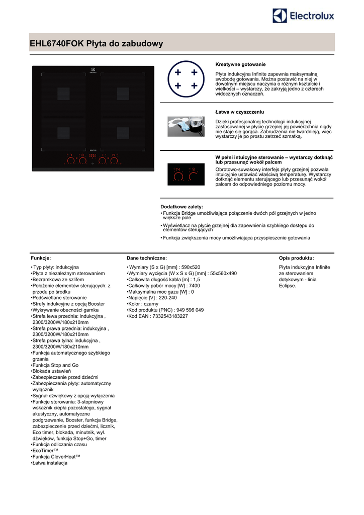 EHL6740FOK Płyta do zabudowy Kreatywne gotowanie Płyta indukcyjna Infinite zapewnia maksymalną swobodę gotowania. Można postawić na niej w dowolnym miejscu naczynia o różnym kształcie i wielkości – wystarczy, że zakryją jedno z czterech widocznych oznaczeń. Łatwa w czyszczeniu Dzięki profesjonalnej technologii indukcyjnej zastosowanej w płycie grzejnej jej powierzchnia nigdy nie staje się gorąca. Zabrudzenia nie twardnieją, więc wystarczy je po prostu zetrzeć szmatką. W pełni intuicyjne sterowanie – wystarczy dotknąć lub przesunąć wokół palcem Obrotowo-suwakowy interfejs płyty grzejnej pozwala intuicyjnie ustawiać właściwą temperaturę. Wystarczy dotknąć elementu sterującego lub przesunąć wokół palcem do odpowiedniego poziomu mocy. Dodatkowe zalety: • Funkcja Bridge umożliwiająca połączenie dwóch pól grzejnych w jedno większe pole • Wyświetlacz na płycie grzejnej dla zapewnienia szybkiego dostępu do elementów sterujących • Funkcja zwiększenia mocy umożliwiająca przyspieszenie gotowania Funkcje: Dane techniczne: Opis produktu: • Typ płyty: indukcyjna •Płyta z niezależnym sterowaniem •Bezramkowa ze szlifem •Położenie elementów sterujących: z przodu po środku •Podświetlane sterowanie •Strefy indukcyjne z opcją Booster •Wykrywanie obecności garnka •Strefa lewa przednia: indukcyjna , 2300/3200W/180x210mm •Strefa prawa przednia: indukcyjna , 2300/3200W/180x210mm •Strefa prawa tylna: indukcyjna , 2300/3200W/180x210mm •Funkcja automatycznego szybkiego grzania •Funkcja Stop and Go •Blokada ustawień •Zabezpieczenie przed dziećmi •Zabezpieczenia płyty: automatyczny wyłącznik •Sygnał dźwiękowy z opcją wyłączenia •Funkcje sterowania: 3-stopniowy wskaźnik ciepła pozostałego, sygnał akustyczny, automatyczne podgrzewanie, Booster, funkcja Bridge, zabezpieczenie przed dziećmi, licznik, Eco timer, blokada, minutnik, wył. dźwięków, funkcja Stop+Go, timer •Funkcja odliczania czasu •EcoTimer™ •Funkcja CleverHeat™ •Łatwa instalacja • Wymiary (S x G) [mm] : 590x520 •Wymiary wycięcia (W x S x G) [mm] : 55x560x490 •Całkowita długość kabla [m] : 1,5 •Całkowity pobór mocy [W] : 7400 •Maksymalna moc gazu [W] : 0 •Napięcie [V] : 220-240 •Kolor : czarny •Kod produktu (PNC) : 949 596 049 •Kod EAN : 7332543183227 Płyta indukcyjna Infinite ze sterowaniem dotykowym - linia Eclipse. EHL6740FOK Płyta do zabudowy
