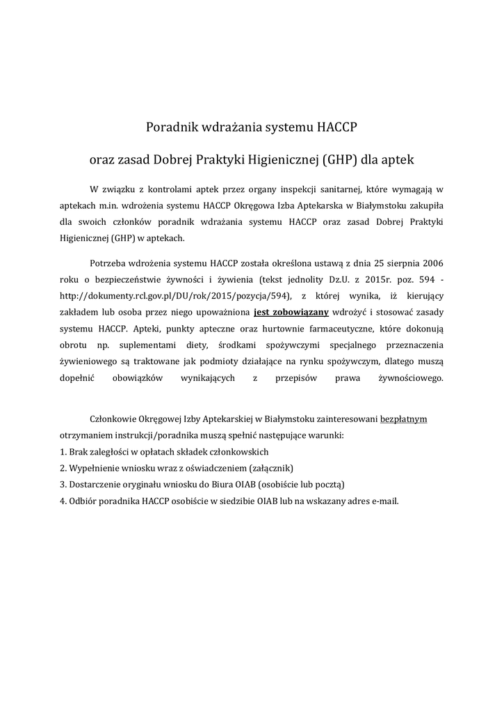 Poradnik wdrażania systemu HACCP oraz zasad Dobrej Praktyki Higienicznej (GHP) dla aptek W związku z kontrolami aptek przez organy inspekcji sanitarnej, które wymagają w aptekach m.in. wdrożenia systemu HACCP Okręgowa Izba Aptekarska w Białymstoku zakupiła dla swoich członków poradnik wdrażania systemu HACCP oraz zasad Dobrej Praktyki Higienicznej (GHP) w aptekach. Potrzeba wdrożenia systemu HACCP została określona ustawą z dnia 25 sierpnia 2006 roku o bezpieczeństwie żywności i żywienia (tekst jednolity Dz.U. z 2015r. poz. 594 http://dokumenty.rcl.gov.pl/DU/rok/2015/pozycja/594), z której wynika, iż kierujący zakładem lub osoba przez niego upoważniona jest zobowiązany wdrożyć i stosować zasady systemu HACCP. Apteki, punkty apteczne oraz hurtownie farmaceutyczne, które dokonują obrotu np. suplementami diety, środkami spożywczymi specjalnego przeznaczenia żywieniowego są traktowane jak podmioty działające na rynku spożywczym, dlatego muszą dopełnić obowiązków wynikających z przepisów prawa żywnościowego. Członkowie Okręgowej Izby Aptekarskiej w Białymstoku zainteresowani bezpłatnym otrzymaniem instrukcji/poradnika muszą spełnić następujące warunki: 1. Brak zaległości w opłatach składek członkowskich 2. Wypełnienie wniosku wraz z oświadczeniem (załącznik) 3. Dostarczenie oryginału wniosku do Biura OIAB (osobiście lub pocztą) 4. Odbiór poradnika HACCP osobiście w siedzibie OIAB lub na wskazany adres e-mail.