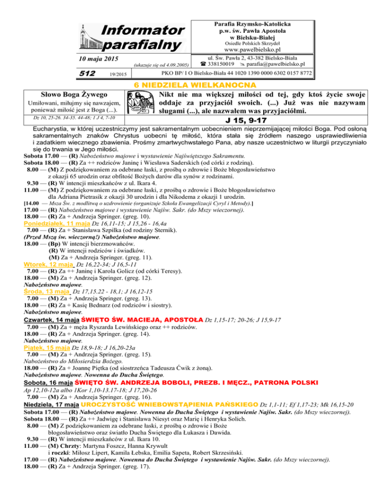 Parafia Rzymsko-Katolicka p.w. św. Pawła Apostoła w Bielsku-Białej Osiedle Polskich Skrzydeł www.pawelbielsko.pl 10 maja 2015 (ukazuje się od 4.09.2005) 512 19/2015 Słowo Boga Żywego Umiłowani, miłujmy się nawzajem, ponieważ miłość jest z Boga (...). Dz 10, 25-26. 34-35. 44-48; 1 J 4, 7-10 ul. Św. Pawła 2, 43-382 Bielsko-Biała 338150019 [email protected] PKO BP/ I O Bielsko-Biała 44 1020 1390 0000 6302 0157 8772 6 NIEDZIELA WIELKANOCNA Nikt nie ma większej miłości od tej, gdy ktoś życie swoje oddaje za przyjaciół swoich. (...) Już was nie nazywam sługami (...), ale nazwałem was przyjaciółmi. J 15, 9-17 Eucharystia, w której uczestniczymy jest sakramentalnym uobecnieniem nieprzemijającej miłości Boga. Pod osłoną sakramentalnych znaków Chrystus uobecni tę miłość, która stała się źródłem naszego usprawiedliwienia i zadatkiem wiecznego zbawienia. Prośmy zmartwychwstałego Pana, aby nasze uczestnictwo w liturgii przyczyniało się do trwania w Jego miłości. Sobota 17.00 — (R) Nabożeństwo majowe i wystawienie Najświętszego Sakramentu. Sobota 18.00 — (R) Za ++ rodziców Janinę i Wiesława Saderskich (od córki z rodziną). 8.00 — (M) Z podziękowaniem za odebrane łaski, z prośbą o zdrowie i Boże błogosławieństwo z okazji 65 urodzin oraz obfitość Bożych darów dla synów z rodzinami. 9.30 — (R) W intencji mieszkańców z ul. Ikara 4. 11.00 — (M) Z podziękowaniem za odebrane łaski, z prośbą o zdrowie i Boże błogosławieństwo dla Adriana Pietrasik z okazji 30 urodzin i dla Nikodema z okazji 1 urodzin. [14.00 — Msza Św. z modlitwą o uzdrowienie (organizuje Szkoła Ewangelizacji Cyryl i Metody).] 17.00 — (R) Nabożeństwo majowe i wystawienie Najśw. Sakr. (do Mszy wieczornej). 18.00 — (R) Za + Andrzeja Springer. (greg. 10). Poniedziałek, 11 maja Dz 16,11-15; J 15,26 - 16,4a 7.00 — (R) Za + Stanisława Szpilka (od rodziny Sternik). (Przed Mszą św. wieczorną!) Nabożeństwo majowe. 18.00 — (Bp) W intencji bierzmowańców. (R) W intencji rodziców i świadków. (M) Za + Andrzeja Springer. (greg. 11). Wtorek, 12 maja Dz 16,22-34; J 16,5-11 7.00 — (R) Za ++ Janinę i Karola Golicz (od córki Teresy). 18.00 — (M) Za + Andrzeja Springer. (greg. 12). Nabożeństwo majowe. Środa, 13 maja Dz 17,15.22 - 18,1; J 16,12-15 7.00 — (M) Za + Andrzeja Springer. (greg. 13). 18.00 — (R) Za + Kasię Bednarz (od rodziców i siostry). Nabożeństwo majowe. Czwartek, 14 maja ŚWIĘTO ŚW. MACIEJA, APOSTOŁA Dz 1,15-17; 20-26; J 15,9-17 7.00 — (M) Za + męża Ryszarda Lewińskiego oraz ++ rodziców. 18.00 — (R) Za + Andrzeja Springer. (greg. 14). Nabożeństwo majowe. Piątek, 15 maja Dz 18,9-18; J 16,20-23a 7.00 — (M) Za + Andrzeja Springer. (greg. 15). Nabożeństwo do Miłosierdzia Bożego. 18.00 — (R) Za + Joannę Piętka (od siostrzeńca Tadeusza Ćwik z żoną). Nabożeństwo majowe. Nowenna do Ducha Świętego. Sobota, 16 maja ŚWIĘTO ŚW. ANDRZEJA BOBOLI, PREZB. I MĘCZ., PATRONA POLSKI Ap 12,10-12a albo 1Kor 1,10-13.17-18; J 17,20-26 7.00 — (M) Za + Andrzeja Springer. (greg. 16). Niedziela, 17 maja UROCZYSTOŚĆ WNIEBOWSTĄPIENIA PAŃSKIEGO Dz 1,1-11; Ef 1,17-23; Mk 16,15-20 Sobota 17.00 — (R) Nabożeństwo majowe. Nowenna do Ducha Świętego i wystawienie Najśw. Sakr. (do Mszy wieczornej). Sobota 18.00 — (R) Za ++ Jadwigę i Stanisława Niesyt oraz Marię i Henryka Solich. 8.00 — (M) Z podziękowaniem za odebrane łaski, z prośbą o zdrowie i Boże błogosławieństwo oraz światło Ducha Świętego dla Łukasza i Dawida. 9.30 — (R) W intencji mieszkańców z ul. Ikara 10. 11.00 — (M) Chrzty: Martyna Foszcz, Hanna Krywult i roczki: Miłosz Lipert, Kamila Łebska, Emilia Sapeta, Robert Skrzesiński. 17.00 — (R) Nabożeństwo majowe. Nowenna do Ducha Świętego i wystawienie Najśw. Sakr. (do Mszy wieczornej). 18.00 — (R) Za + Andrzeja Springer. (greg. 17). DIAKONIA SPRZĄTANIA Dziękujemy mieszkańcom z ul. Tańskiego 9 oraz nielicznym przedstawicielom bierzmowańców i ich rodzin za posprzątanie kościoła, ofiarę na kościół i wystrój kwiatowy. Msza Św. w ich intencji będzie celebrowana 12 lipca o godz. 930.W najbliższym tygodniu o posługę czystości i wystrój kwiatowy prosimy mieszkańców z ul. Tańskiego 11. OGŁOSZENIA DUSZPASTERKIE 1. Dzisiaj, zgodnie z apelem Ks. Bpa Ordynariusza przy drzwiach kościoła zbiórka na poszkodowanych w trzęsieniu ziemi w Nepalu! 2. W poniedziałek w czasie Mszy św. wieczornej Ks. Bp Piotr Greger udzieli sakramentu bierzmowania naszej młodzieży. To ważne wydarzenie w życiu parafialnym, dlatego serdecznie zapraszamy do udziału w tej Mszy Św. 00 3. Nabożeństwa majowe, w naszym kościele są w sobotę i niedzielę o 17 a w pozostałe dni tygodnia po Mszy św. wieczornej (wyjątkiem będzie poniedziałek kiedy to z racji bierzmowania modlitwa z Maryją będzie przed Mszą św. wieczorną!). 4. W czwartek po Mszy Św. wieczornej spotkanie dla wspólnego czytania Pisma Św. 5. W piątek po Mszy Św. wieczornej i nabożeństwie majowym katecheza przedchrzcielna. 6. Od piątku rozpoczynamy nowennę przed uroczystością Zesłania Ducha Świętego. 7. W przyszłą niedzielę po każdej Mszy Św. przed rozpoczęciem sezonu letniego pobłogosławienie pojazdów mechanicznych. Również w przyszłą niedzielę przy drzwiach kościoła zbiórka ofiar przeznaczonych na cele charytatywne (tzw. jałmużna postna – jest to zadośćuczynienie za braki w praktykach pokutnych, postnych zwłaszcza w okresie Wielkiego Postu) oraz na Dom Matki i Dziecka w naszym mieście! 8. Przypominamy o zgłoszeniach na pielgrzymkę parafialną w czerwcu! 9. W zakrystii są do odebrania zdjęcia komunijne. W JEDNOŚCI Z MATURZYSTAMI Zgodnie z zarządzeniem Ks. Bpa Ordynariusza w czasie trwania egzaminów maturalnych w naszym kościele pali się specjalna świeca jako symbol modlitewnej pamięci o młodzieży maturalnej! ZAPOWIEDZI PRZEDŚLUBNE (3) BAJEROWSKI