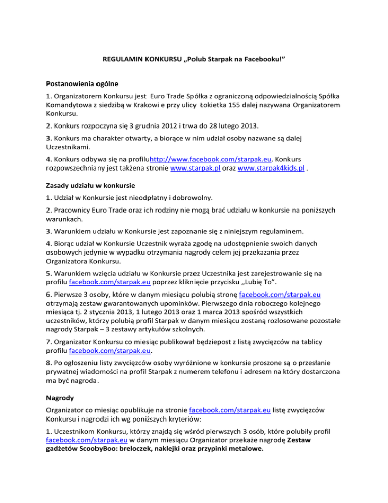 REGULAMIN KONKURSU „Polub Starpak na Facebooku!” Postanowienia ogólne 1. Organizatorem Konkursu jest Euro Trade Spółka z ograniczoną odpowiedzialnością Spółka Komandytowa z siedzibą w Krakowi e przy ulicy Łokietka 155 dalej nazywana Organizatorem Konkursu. 2. Konkurs rozpoczyna się 3 grudnia 2012 i trwa do 28 lutego 2013. 3. Konkurs ma charakter otwarty, a biorące w nim udział osoby nazwane są dalej Uczestnikami. 4. Konkurs odbywa się na profiluhttp://www.facebook.com/starpak.eu. Konkurs rozpowszechniany jest takżena stronie www.starpak.pl oraz www.starpak4kids.pl . Zasady udziału w konkursie 1. Udział w Konkursie jest nieodpłatny i dobrowolny. 2. Pracownicy Euro Trade oraz ich rodziny nie mogą brać udziału w konkursie na poniższych warunkach. 3. Warunkiem udziału w Konkursie jest zapoznanie się z niniejszym regulaminem. 4. Biorąc udział w Konkursie Uczestnik wyraża zgodę na udostępnienie swoich danych osobowych jedynie w wypadku otrzymania nagrody celem jej przekazania przez Organizatora Konkursu. 5. Warunkiem wzięcia udziału w Konkursie przez Uczestnika jest zarejestrowanie się na profilu facebook.com/starpak.eu poprzez kliknięcie przycisku „Lubię To”. 6. Pierwsze 3 osoby, które w danym miesiącu polubią stronę facebook.com/starpak.eu otrzymają zestaw gwarantowanych upominków. Pierwszego dnia roboczego kolejnego miesiąca tj. 2 stycznia 2013, 1 lutego 2013 oraz 1 marca 2013 spośród wszystkich uczestników, którzy polubią profil Starpak w danym miesiącu zostaną rozlosowane pozostałe nagrody Starpak – 3 zestawy artykułów szkolnych. 7. Organizator Konkursu co miesiąc publikował będziepost z listą zwycięzców na tablicy profilu facebook.com/starpak.eu. 8. Po ogłoszeniu listy zwycięzców osoby wyróżnione w konkursie proszone są o przesłanie prywatnej wiadomości na profil Starpak z numerem telefonu i adresem na który dostarczona ma być nagroda. Nagrody Organizator co miesiąc opublikuje na stronie facebook.com/starpak.eu listę zwycięzców Konkursu i nagrodzi ich wg poniższych kryteriów: 1. Uczestnikom Konkursu, którzy znajdą się wśród pierwszych 3 osób, które polubiły profil facebook.com/starpak.eu w danym miesiącu Organizator przekaże nagrodę Zestaw gadżetów ScoobyBoo: breloczek, naklejki oraz przypinki metalowe. 2. Uczestnicy Konkursu, którzy polubią profil facebook.com/starpak.eu w dniach od 3 grudnia 2012 do 28 lutego 2013 wezmą udział w jednym z 3 losowań. Wylosowanym uczestnikom Organizator przekaże Zestawy nagród z licencji Angelina Ballerina, Pucca i Little Big Planet. Postanowienia końcowe 1. Organizator zastrzega sobie prawo przerwania, zmiany lub przedłużenia Konkursu w razie wystąpienia przyczyn od niego niezależnych. 2. Przystąpienie Uczestnika do Konkursu jest równoznaczne z akceptacją treści niniejszego Regulaminu. 3. Reklamacje dotyczące spraw związanych z Konkursem należy przesyłać mailowo na adres [email protected] terminie do 14 dni od momentu powiadomienia zwycięzców każdej edycji Konkursu. Reklamacje przesłane po upływie powyższego 14-dniowego terminu nie będą rozpatrywane. Reklamacje rozpatrywane będą przez Organizatora w terminie do 14 dni od ich otrzymania. Decyzja Organizatora w sprawie reklamacji będzie ostateczna. ORGANIZATOR Euro Trade Spółka z ograniczoną odpowiedzialnością Spółka Komandytowa