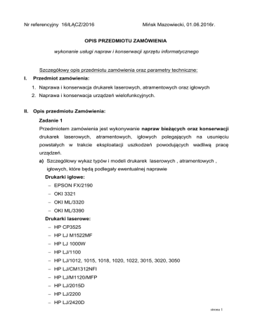 Mińsk Mazowiecki, 01.06.2016r. Nr referencyjny 16/ŁĄCZ/2016 OPIS PRZEDMIOTU ZAMÓWIENIA wykonanie usługi napraw i konserwacji sprzętu informatycznego Szczegółowy opis przedmiotu zamówienia oraz parametry techniczne: I. Przedmiot zamówienia: 1. Naprawa i konserwacja drukarek laserowych, atramentowych oraz igłowych 2. Naprawa i konserwacja urządzeń wielofunkcyjnych. II. Opis przedmiotu Zamówienia: Zadanie 1 Przedmiotem zamówienia jest wykonywanie napraw bieżących oraz konserwacji drukarek laserowych, atramentowych, igłowych polegających na usunięciu powstałych w trakcie eksploatacji uszkodzeń powodujących wadliwą pracę urządzeń. a) Szczegółowy wykaz typów i modeli drukarek laserowych , atramentowych , igłowych, które będą podlegały ewentualnej naprawie Drukarki igłowe: EPSON FX/2190 OKI 3321 OKI ML/3320 OKI ML/3390 Drukarki laserowe: HP CP3525 HP LJ M1522MF HP LJ 1000W HP LJ/1100 HP LJ/1012, 1015, 1018, 1020, 1022, 3015, 3020, 3050 HP LJ/CM1312NFI HP LJ/M1120/MFP HP LJ/2015D HP LJ/2200 HP LJ/2420D strona 1 HP LJ/2605 HP LJ CP4005DN HP LJ/4100N Konica-Minolta FS-1010 Konica-Minolta FS-1030D Konica-Minolta FS-1116MFP Konica-Minolta FS-1118/MFP Konica-Minolta PAGEPRO/1350W/1350EN Konica-Minolta FS-8100/DN Kyocera 1035MFP P/DP Kyocera FS-1028MFP Kyocera FS-2000D Kyocera FS-2020DN Kyocera FS-2100DN Kyocera FS-4020DN Kyocera FS-5300DN Lexmark E250D Lexmark E360D Lexmark E460DN Lexmark C500N Lexmark C543DN Drukarki atramentowe: HP DJ/450CBI , 840C, 845C, 940C, 990CXI HP BUSI/IJ/1100D HP DJ/1220C HP DJ/3650 HP DJ 3845 HP DJ F-4180 HP DJ/5940 HP DJ/9650 HP DJ/9800 LEXMARK Z 730 A4 K strona 2 Zadanie 2 Przedmiotem zamówienia jest wykonywanie napraw bieżących, konserwacji oraz przeglądów prewencyjnych urządzeń wielofunkcyjnych polegających na usunięciu powstałych w trakcie eksploatacji uszkodzeń powodujących wadliwą pracę urządzeń. a) Szczegółowy wykaz typów i modeli urządzeń wielofunkcyjnych, które będą podlegały ewentualnej naprawie: Konica-Minolta BIZHUB/C220 Konica-Minolta BIZHUB/C280 Konica-Minolta BIZHUB/C454 Konica-Minolta BIZHUB/C364 Kyocera TASKALFA/3050CI OCE VAR/2222C III. Zasady realizacji weryfikacji, napraw i konserwacji: 1. Przegląd, weryfikacja oraz naprawa i konserwacja wykonywane winny być w miejscu dyslokacji sprzętu, tj. w 23 Bazie Lotnictwa Taktycznego w Mińsku Mazowieckim w godzinach jego urzędowania Zamawiającego, tj. od 8:00 do 15:00 w dniach roboczych: poniedziałek – piątek. W przypadku braku możliwości naprawy na miejscu za zgodą Zamawiającego można ją wykonać u Wykonawcy – transport zapewnia Wykonawca na swój koszt. 2. Naprawa urządzeń u Wykonawcy realizowana będzie po odłączeniu dysków HDD (dyski pozostają u użytkownika). 3. Naprawa powinna być realizowana przez wymianę lub naprawę wadliwego elementu bez obniżania parametrów technicznych urządzeń i dokonywania zmian konstrukcyjnych. 4. Wykonawca winien posiadać własne części zamienne do napraw urządzeń. 5. Zakresem usługi objęte są wszystkie zespoły i podzespoły wchodzące w skład przedmiotowych urządzeń. 6. Przegląd i weryfikacja niesprawności urządzeń zostanie zrealizowana w terminie nie dłuższym niż 2 dni po otrzymaniu zawiadomienia złożonego faksem/pocztą elektroniczną lub telefonicznie przez n/wym. osoby upoważnione: chor. Tomasz KONIECZNY p. Edyta JURCZAK 7. Konserwacje, naprawy oraz naprawy poprzez wymianę niesprawnych elementów odbywać się będą sukcesywnie po zatwierdzonym (pisemnie) kosztorysie wykonania usług. Kosztorys musi zawierać ceny części zamiennych nie odbiegające od cen rynkowych oraz cenę 1 roboczogodziny (cena nie może się różnić od ceny przedstawionej w formularzu ofertowym), ilość godzin strona 3 przeznaczonych na przegląd / weryfikację, ilość godzin przewidzianych na naprawę i konserwację urządzeń. 8. Wykonanie usługi naprawy i konserwacji następuje wyłącznie po zatwierdzeniu kosztorysu. 9. Wykonawca udzieli co najmniej 3-ch miesięcy gwarancji na wykonaną usługę serwisową w zakresie naprawianych podzespołów liczoną od dnia odbioru urządzenia po naprawie 10. Naprawa i konserwacja urządzeń zostanie zrealizowana w terminie nie dłuższym niż 7 dni od daty otrzymania zatwierdzonego kosztorysu złożonego faksem/pocztą elektroniczną lub telefonicznie przez w/wym. osoby upoważnione. Ewentualne wydłużenie czasu naprawy może nastąpić na prośbę wykonawcy, po wskazaniu przyczyn niemożliwości dotrzymania terminu. IV. Okres świadczenia usługi: - od dnia podpisania umowy do dnia 30.10.2016r. - sukcesywnie, zgodnie ze składanymi zamówieniami V. Wymagany okres gwarancji: - co najmniej 3 miesiące od dnia zakończenia naprawy Starszy Podoficer Eksploatacji /-/ chor. Tomasz KONIECZNY strona 4