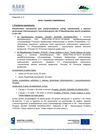 Załącznik nr 2 OPIS I ZAKRES ZAMÓWIENIA I. Przedmiot zamówienia: Przedmiotem zamówienia jest przeprowadzenie usługi szkoleniowej z zakresu technologii informacyjnych i komunikacyjnych dla 75 Beneficjentów dwóch projektów, w tym dla: 30 Beneficjentów Projektu „DAJMY SZANSĘ DOJRZAŁOŚCI” o numerze identyfikacyjnym KSI: WND-POKL.07.02.01-18-249/09 współfinansowanego z Europejskiego Funduszu Społecznego realizowanego w ramach Poddziałania 7.2.1 „Aktywizacja zawodowa i społeczna osób zagrożonych wykluczeniem społecznym”, Działanie 7.2 „Przeciwdziałanie wykluczeniu i wzmocnienie sektora ekonomii społecznej”, Priorytet VII „Promocja integracji społecznej”; 45 Beneficjentów Projektu „FOCUS –Twoje miejsce w życiu, Twoje miejsce na rynku pracy” o numerze identyfikacyjnym KSI: WND-POKL.07.02.01-18-248/09 współfinansowanego z Europejskiego Funduszu Społecznego realizowanego w ramach Poddziałania 7.2.1 „Aktywizacja zawodowa i społeczna osób zagrożonych wykluczeniem społecznym”, Działanie 7.2 „Przeciwdziałanie wykluczeniu i wzmocnienie sektora ekonomii społecznej”, Priorytet VII Promocja integracji społecznej. Uczestnikami projektu będą: osoby po 45 roku życia: 30 osób osoby długotrwale bezrobotne: 45 osób Liczba uczestników szkolenia z zakresu technologii informacyjnych i komunikacyjnych: 75 osób. Liczba grup: 5 grup 15 osobowych, w tym: 2 grupy x 15 osób = 30 osób w ramach Projektu „DAJMY SZANSĘ DOJRZAŁOŚCI” 3 grupy x 15 osób = 45 osób w ramach Projektu „FOCUS –Twoje miejsce w życiu, Twoje miejsce na rynku pracy” Liczba godzin przypadająca na jedną grupę: 60 godzin lekcyjnych (1 godzina = 45 minut) 5h dziennie, 3 razy w tygodniu (w dni powszednie od poniedziałku do piątku). Zgodnie z harmonogramem przedstawionym przez Zamawiającego (Załącznik nr 3A – Harmonogram Projektu „DAJMY SZANSĘ DOJRZAŁOŚCI”, Załącznik nr 3B – Harmonogram Projektu „FOCUS –Twoje miejsce w życiu, Twoje miejsce na rynku pracy”). 1 Projekt współfinansowany ze środków Unii Europejskiej w ramach Europejskiego Funduszu Społecznego Łączna liczba godzin: 300 godzin lekcyjnych (45 minutowych). II. Czas realizacji przedmiotu zamówienia: Przewidywany termin realizacji zamówienia: od 05 maja 2011 roku do 30 czerwca 2011 roku (5 grupy szkoleniowych tj. 75 BO w tym 3 grupy osób długotrwale bezrobotnych i 2 grupy osób po 45 roku życia). III. W ramach przedmiotu zamówienia Wykonawca ma zapewnić: 1. Catering dla każdego uczestnika szkolenia, we wszystkie dni szkolenia, obejmujący: przerwę kawową na rozpoczęcie szkolenia, w tym: herbatę (1 kubek/filiżanka na 1 osobę), kawę rozpuszczalną (2 kubki/filiżanki na 1 osobę), sok (1 kubek na 1 osobę), cytrynę do herbaty (dla każdej osoby), mleko do kawy (dla każdej osoby), cukier, serwetki; obiad w ciągu dnia szkoleniowego w tym: herbatę (1 kubek/filiżanka na 1 osobę), kawę rozpuszczalną (1 kubek/filiżanka na 1 osobę), cytrynę do herbaty (dla każdej osoby), mleko do kawy (dla każdej osoby), cukier, serwetki oraz gorący posiłek (1 drugie danie na 1 osobę), składający się z: ziemniaków (minimum 100 gram), mięsa lub ryby (minimum 150 gram) oraz surówki (minimum 100 gram) na 8 dni szkoleniowych dla każdej grupy; dania jarskiego na pozostałe 4 dni szkoleniowe dla każdej grupy. Herbata, kawa oraz drugie danie muszą być podane gorące w naczyniach lub pojemnikach termoizolacyjnych, odrębnie dla każdej grupy szkoleniowej. Czas na przerwy kawowe i obiadowe należy doliczyć do założonej liczby godzin dydaktycznych szkolenia. Dzienna liczba godzin szkolenia wynikająca z Harmonogramów (Załączniki 3A i 3B) obejmuje przerwy kawowe i obiadowe. 2. Komplet materiałów dla każdego uczestnika szkolenia, obejmujących: papierową (wydrukowaną i spiętą) wersję materiałów szkoleniowych, materiały papiernicze, przybory do pisania i inne środki dydaktyczne niezbędne do realizacji szkolenia. 3. Zestaw komputerowy dla każdego uczestnika w grupie szkoleniowej wyposażony w system operacyjny WINDOWS XP lub WINDOWS 7 oraz Pakiet Microsoft Office 2003 lub 2007 i inne oprogramowanie niezbędne do osiągnięcia celów szkolenia. 4. Sale komputerowe z oświetleniem dziennym i sztucznym oraz z zapleczem sanitarnym. 2 Projekt współfinansowany ze środków Unii Europejskiej w ramach Europejskiego Funduszu Społecznego IV. Szczegółowa tematyka i komunikacyjnych szkolenia z zakresu technologii obsługa systemu operacyjnego Windows XP lub Windows 7 obsługa pakietu Microsoft Office 2003 lub 2007, w tym: informacyjnych obsługa edytora tekstu WORD, obsługa arkusza kalkulacyjnego EXCEL, obsługa programu PowerPoint, obsługa Internetu, obsługa poczty elektronicznej. Tematyka szkolenia powinna być dopasowana do stopnia zaawansowania uczestników tworzących daną grupę szkoleniową (możliwe poziomy umiejętności uczestnika szkolenia to: podstawowy, średniozaawansowany, zaawansowany). V. Wykonawca zobowiązuje się do: 1. Opracowania, wydrukowania i rozdania wszystkim uczestnikom materiałów szkoleniowych dla każdego poziomu zaawansowania grup szkoleniowych, pozwalających na samodzielną edukację z zakresu tematyki szkoleń. 2. Przeprowadzenia usługi zgodnie z przedmiotem zamówienia i harmonogramem dołączonym do przedmiotu zamówienia (Załącznik nr 3A – Harmonogram Projektu „DAJMY SZANSĘ DOJRZAŁOŚCI”, Załącznik nr 3B – Harmonogram Projektu „FOCUS –Twoje miejsce w życiu, Twoje miejsce na rynku pracy”). 3. Prowadzenia ciągłego nadzoru i kontroli merytorycznej nad realizacją usługi w celu zapewnienia wysokiego poziomu prowadzonego szkolenia. 4. Przeprowadzania testów, ćwiczeń mierzących postęp w nauce Beneficjentów (wynik testów procentowy) w tym: testu na początku szkolenia, w trakcie i na zakończenie szkolenia oraz przygotowania na koniec szkolenia omówienia wszystkich testów i postępów w nauce