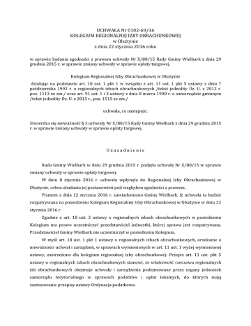 UCHWAŁA Nr 0102-69/16 KOLEGIUM REGIONALNEJ IZBY OBRACHUNKOWEJ w Olsztynie z dnia 22 stycznia 2016 roku w sprawie badania zgodności z prawem uchwały Nr X/80/15 Rady Gminy Wielbark z dnia 29 grudnia 2015 r. w sprawie zmiany uchwały w sprawie opłaty targowej. Kolegium Regionalnej Izby Obrachunkowej w Olsztynie działając na podstawie art. 18 ust. 1 pkt 1 w związku z art. 11 ust. 1 pkt 5 ustawy z dnia 7 października 1992 r. o regionalnych izbach obrachunkowych /tekst jednolity Dz. U. z 2012 r. poz. 1113 ze zm./ oraz art. 91 ust. 1 i 3 ustawy z dnia 8 marca 1990 r. o samorządzie gminnym /tekst jednolity Dz. U. z 2015 r., poz. 1515 ze zm./ uchwala, co następuje: Stwierdza się nieważność § 3 uchwały Nr X/80/15 Rady Gminy Wielbark z dnia 29 grudnia 2015 r. w sprawie zmiany uchwały w sprawie opłaty targowej. Uzasadnienie Rada Gminy Wielbark w dniu 29 grudnia 2015 r. podjęła uchwałę Nr X/80/15 w sprawie zmiany uchwały w sprawie opłaty targowej. W dniu 8 stycznia 2016 r. uchwała wpłynęła do Regionalnej Izby Obrachunkowej w Olsztynie, celem zbadania jej postanowień pod względem zgodności z prawem. Pismem z dnia 12 stycznia 2016 r. zawiadomiono Gminę Wielbark, iż uchwała ta będzie rozpatrywana na posiedzeniu Kolegium Regionalnej Izby Obrachunkowej w Olsztynie w dniu 22 stycznia 2016 r. Zgodnie z art. 18 ust. 3 ustawy o regionalnych izbach obrachunkowych w posiedzeniu Kolegium ma prawo uczestniczyć przedstawiciel jednostki, której sprawa jest rozpatrywana. Przedstawiciel Gminy Wielbark nie uczestniczył w posiedzeniu Kolegium. W myśl art. 18 ust. 1 pkt 1 ustawy o regionalnych izbach obrachunkowych, orzekanie o nieważności uchwał i zarządzeń, w sprawach wymienionych w art. 11 ust. 1 wyżej wymienionej ustawy, zastrzeżono dla kolegium regionalnej izby obrachunkowej. Przepis art. 11 ust. pkt 5 ustawy o regionalnych izbach obrachunkowych stanowi, że właściwość rzeczowa regionalnych izb obrachunkowych obejmuje uchwały i zarządzenia podejmowane przez organy jednostek samorządu terytorialnego w sprawach podatków i opłat lokalnych, do których mają zastosowanie przepisy ustawy Ordynacja podatkowa. 2 Kolegium Regionalnej Izby Obrachunkowej w Olsztynie badając przedmiotową uchwałę stwierdziło, co następuje: Stosownie do art. 15 ust. 1 ustawy z dnia 12 stycznia 1991 r. o podatkach i opłatach lokalnych (j. t. Dz. U. z 2014 r., poz. 849 ze zm.), rada gminy może wprowadzić opłatę targową. Opłatę targową pobiera się od osób fizycznych, osób prawnych oraz jednostek organizacyjnych nieposiadających osobowości prawnej, dokonujących sprzedaży na targowiskach. Art. 19 pkt 1 ustawy o podatkach i opłatach lokalnych stanowi, że rada gminy, w drodze uchwały, określa zasady ustalania i poboru oraz terminy płatności i wysokość stawek opłat określonych w ustawie. Zgodnie z art. 20 a ustawy o podatkach i opłatach lokalnych, w przypadku nieuchwalenia stawek podatków lub opłat lokalnych, stosuje się stawki obowiązujące w roku poprzedzającym rok podatkowy. Rada Gminy Wielbark w § 1 badanej uchwały dokonała zmian w uchwale Nr IX/71/15 Rady Gminy Wielbark z dnia 18 listopada 2015 r. w sprawie opłaty targowej poprzez dodanie, w § 2 uchwały zmienianej, punktu 4 i ustalenie stawki opłaty targowej „przy innych formach sprzedaży”. W § 3 badanej uchwały zawarto zapis, iż uchwała podlega opublikowaniu w Dzienniku Urzędowym Województwa Warmińsko-Mazurskiego i obowiązuje od 1 stycznia 2016 roku. W ocenie Kolegium Regionalnej Izby Obrachunkowej w Olsztynie, zgodnie z art. 20 a ust. 1 ustawy o podatkach i opłatach lokalnych w przypadku nieuchwalenia stawek podatków lub opłat lokalnych stosuje się stawki obowiązujące w roku poprzedzającym rok podatkowy, przy czym podjęcie uchwały oznacza także jej prawidłową publikację. W razie nie spełnienia tych wymogów obowiązywać będą stawki z roku poprzedzającego rok podatkowy. Pogląd taki znajduje odzwierciedlenie w orzecznictwie sądów administracyjnych, zgodnie, z którym podjęcie uchwały w sprawie określenia stawek podatku od nieruchomości obejmuje zarówno sam fakt jej głosowania przez radę, jak i jej należytą publikację. Dopiero spełnienie obu tych warunków stanowi, że dany akt normatywny wszedł do porządku i obrotu prawnego, zaś naruszenie zasad prawidłowej legislacji i zakazu niedziałania prawa wstecz stanowi istotne naruszenie prawa (wyrok NSA z dnia 13 czerwca 2014 r. II FSK 1677/12, wyrok WSA w Warszawie z dnia 22 kwietnia 2013 r. III SA/Wa 3310/12). Zgodnie z art. 4 ust. 1 ustawy z dnia 20 lipca 2000 r. o ogłaszaniu aktów normatywnych i niektórych innych aktów prawnych (t. j. Dz. U. z 2015, poz. 1484 ze zm.) akty normatywne, zawierające przepisy powszechnie obowiązujące, ogłaszane w dziennikach urzędowych wchodzą w życie po upływie czternastu dni od dnia ich ogłoszenia chyba, że dany akt normatywny określi termin dłuższy. Natomiast art. 5 ust. 1 i 2 tej ustawy stanowi, że akty normatywne, zawierające przepisy powszechnie obowiązujące, ogłaszane w dziennikach 3 urzędowych wchodzą w życie po upływie czternastu dni od dnia ich ogłoszenia chyba, że dany akt normatywny określi termin dłuższy. W uzasadnionych przypadkach akty normatywne, mogą wchodzić w życie w terminie krótszym niż czternaście dni, a jeżeli ważny interes państwa wymaga natychmiastowego wejścia w życie aktu normatywnego i zasady demokratycznego państwa prawnego nie stoją temu na przeszkodzie, dniem wejścia w życie może być dzień ogłoszenia tego aktu w dzienniku urzędowym. Kolegium Regionalnej Izby Obrachunkowej w Olsztynie stwierdza, że akt prawa miejscowego, jakim jest przedmiotowa uchwała (ma charakter generalny i abstrakcyjny) może wejść w życie po upływie czternastu dni od dnia ogłoszenia w Dzienniku Urzędowym Województwa Warmińsko-Mazurskiego lub w terminie dłuższym, jeżeli termin dłuższy byłby określony w tej u