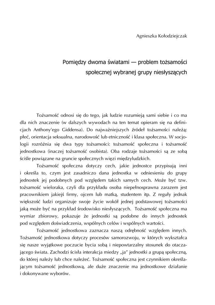 Agnieszka Kołodziejczak Pomiędzy dwoma światami — problem tożsamości społecznej wybranej grupy niesłyszących Tożsamość odnosi się do tego, jak ludzie rozumieją sami siebie i co ma dla nich znaczenie (w dalszych wywodach na ten temat opieram się na definicjach Anthony’ego Giddensa). Do najważniejszych źródeł tożsamości należą: płeć, orientacja seksualna, narodowość lub etniczność i klasa społeczna. W socjologii rozróżnia się dwa typy tożsamości: tożsamość społeczna i tożsamość jednostkowa (inaczej tożsamość osobista). Oba rodzaje tożsamości są ze sobą ściśle powiązane na gruncie społecznych więzi międzyludzkich. Tożsamość społeczna dotyczy cech, jakie jednostce przypisują inni i określa to, czym jest zasadniczo dana jednostka w odniesieniu do grupy jednostek jej podobnych pod względem takich samych cech. Może być tzw. tożsamość wieloraka, czyli dla przykładu osoba niepełnosprawna zarazem jest pracownikiem jakiejś firmy, ojcem lub matką, studentem itp. Z reguły jednak większość ludzi organizuje swoje życie wokół jednej podstawowej tożsamości jaką może być na przykład środowisko niesłyszących. Tożsamość społeczna ma wymiar zbiorowy, pokazuje że jednostki są podobne do innych jednostek pod względem doświadczenia, wspólnych celów i wspólnych wartości. Tożsamość jednostkowa zaznacza naszą odrębność względem innych. Tożsamość jednostkowa dotyczy procesów samorozwoju, w których wykształca się nasze wyjątkowe poczucie bycia sobą i niepowtarzalny stosunek do otaczającego świata. Zachodzi ścisła interakcja miedzy „ja” jednostki a grupą społeczną, do której należy lub chce należeć. Tożsamość społeczna jest czynnikiem określającym tożsamość jednostkową, ale duże znaczenie ma jednostkowe działanie i dokonywane wyborów. A. Kołodziejczak, Pomiędzy dwoma światami Obecnie pojęcie tożsamości zbiorowej jest szersze w stosunku do dawnego znaczenia, które opierało się w głównej mierze na przynależności klasowej lub narodowościowej. Współczesna socjologia definiuje tożsamość zbiorową jako wyznacznik przynależności do danej grupy społecznej typu: subkultury młodzieżowe, grupy społeczne oparte na przynależności zawodowej, typu prawnicy, lekarze itp. Grupa społeczna mająca cechę wspólną to grupa osób niepełnosprawnych. Wśród nich też pojawiają się kolejne podgrupy społeczne typu niewidomi, niepełnosprawni ruchowo, niesłyszący (w tym przypadku są kontrowersje, czy niesłyszących należy uznać za osoby niepełnosprawne ze względu na wadę słuchu [tzw. definicja medyczna] czy uznać za mniejszość narodową ze względu na język migowy, który jest językiem niesłyszących [przynależność kulturowa]). Wielu ludzi próbuje odpowiedzieć sobie na pytanie „Kim tak właściwie jestem?” poprzez ukierunkowanie światopoglądowe, cechy psychofizyczne i określenie własnej przynależności do określonej grupy społecznej, w ramach której członkowie grupy są związani ze sobą kulturowo i społecznie. Tożsamość nasza kształtuje się także poprzez porównywanie się z innymi ludźmi. Dostrzeżenie wspólnych właściwości z innymi osobami z grupy, w której żyjemy, np. rodziny, oraz odrębności tych grup stanowi podstawę tożsamości społecznej. Uwzględniając klasyfikację potrzeb stworzoną przez Abrahama Maslowa, należy zauważyć, iż człowiek ma: potrzebę przynależności i miłości — skłaniają one do nawiązywania bliskich, przyjaznych kontaktów z innymi ludźmi; rozbudzają przyjaźń i miłość; potrzebę uznania — człowiek pragnie uznania ze strony innych i pragnie mieć uznanie dla siebie. Człowiek, chcąc zaspokoić swoje potrzeby, musi funkcjonować w różnych zbiorowościach ludzkich i grupach społecznych. Więzi społeczne (formalne, oparte na normach i prawach lub nieformalne, określone przez samych ludzi łączących się w grupy, np. przyjaciół) powstają w różnych sytuacjach, w których znajduje się jednostka, np. urodzenie się w konkretnej rodzinie i miejscu stwarza więź naturalną. Więzi powstają również w wyniku przynależności do określonej grupy lub konieczności podporządkowania się władzy w grupie, do której się należy. Poczucie wspólnoty może wynikać z wykonywania 23 A. Kołodziejczak, Pomiędzy dwoma światami wspólnej pracy zawodowej, określonej służby społecznej, pobierania nauki. Jednostka, przynależąc do danej grupy, odgrywa wyznaczone jej przez tę grupę określone role społeczne. Im bardziej jednostka utożsamia się z grupą, tym lepiej te role wykonuje. Człowiek jest jedyną istotą w przyrodzie, której do prawidłowego rozwoju psychicznego jest niezbędne wychowanie w społeczeństwie. Każdy z nas, przebywając w różnych zbiorowościach i przynależąc do określonych grup społecznych, jest jednocześnie członkiem społeczeństwa. W ramach społeczeństwa funkcjonują instytucje organizujące nasze życie i powodujące powstawanie określonych zależności i związków między różnymi grupami społecznymi, wchodzącymi w skład społeczeństwa, co wpływa na jego integrowanie. Ciekawym zjawiskiem każdej społeczności jest sposób wzajemnego oddziaływania na siebie jej członków. Interakcje te badał R. P. Bales, psycholog społeczny. Wynikiem tych badań jest stworzenie następujących kategorii interakcji: 1. Solidaryzowanie się z inną osobą, podwyższanie pozycji innej osoby, udzielanie pomocy, nagradzanie. 2. Rozładowywanie napięcia emocjonalnego, żartowanie, śmianie się, okazywanie zadowolenia. 3. Wyrażanie zgody, bierne akceptowanie, rozumienie sugestii, uleganie. 4. Dawanie sugestii, wskazywanie kierunku, pozostawianie innym autonomii. 5. Wyrażanie opinii, dokonywanie oceny, wyrażanie uczuć, wyrażanie życzeń. 6. Orientowanie innych, udzielanie informacji, powtarzanie, wyjaśnianie. 7. Pytanie 