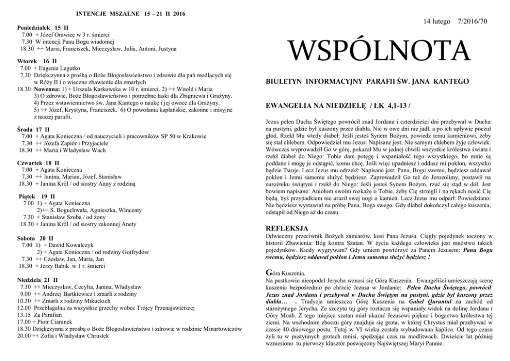 INTENCJE MSZALNE 15 – 21 II 2016 Poniedziałek 15 II 7.00 + Józef Orawiec w 3 r. śmierci 7.30 W intencji Panu Bogu wiadomej 18.30 ++ Maria, Franciszek, Mieczysław, Julia, Antoni, Justyna Wtorek 16 II 7.00 + Eugenia Legutko 7.30 Dziękczynna z prośbą o Boże Błogosławieństwo i zdrowie dla pań modlących się w Róży II i o wieczne zbawienie dla zmarłych 18.30 Nowenna: 1) + Urszula Karkowska w 10 r. śmierci. 2) ++ Witold i Maria 3) O zdrowie, Boże Błogosławieństwo i potrzebne łaski dla Zbigniewa i Grażyny. 4) Przez wstawiennictwo św. Jana Kantego o naukę i jej owoce dla Grażyny. 5) ++ Józef, Krystyna, Franciszek. 6) O powołania kapłańskie, zakonne i misyjne z naszej parafii. Środa 7.00 7.30 18.30 17 II + Agata Konieczna / od nauczycieli i pracowników SP 50 w Krakowie ++ Józefa Zapiór i Przyjaciele ++ Maria i Władysław Wach Czwartek 18 II 7.00 + Agata Konieczna 7.30 ++ Janina, Marian, Józef, Stanisław 18.30 + Janina Król / od siostry Anny z rodziną Piątek 19 II 7.00 1) + Agata Konieczna 2)++ S. Boguchwała, Agnieszka, Wincenty 7.30 + Stanisław Szuba / od żony 18.30 + Janina Król / od siostry zakonnej Anety Sobota 20 II 7.00 1) + Dawid Kowalczyk 2) + Agata Konieczna / od rodziny Gotfrydów 7.30 ++ Czesław, Jan, Maria, Jan 18.30 + Jerzy Babik w 1 r. śmierci 14 lutego 7/2016/70 WSPÓLNOTA BIULETYN INFORMACYJNY PARAFII ŚW. JANA KANTEGO EWANGELIA NA NIEDZIELĘ / ŁK 4,1-13 / Jezus pełen Ducha Świętego powrócił znad Jordanu i czterdzieści dni przebywał w Duchu na pustyni, gdzie był kuszony przez diabła. Nic w owe dni nie jadł, a po ich upływie poczuł głód. Rzekł Mu wtedy diabeł: Jeśli jesteś Synem Bożym, powiedz temu kamieniowi, żeby się stał chlebem. Odpowiedział mu Jezus: Napisane jest: Nie samym chlebem żyje człowiek. Wówczas wyprowadził Go w górę, pokazał Mu w jednej chwili wszystkie królestwa świata i rzekł diabeł do Niego: Tobie dam potęgę i wspaniałość tego wszystkiego, bo mnie są poddane i mogę je odstąpić, komu chcę. Jeśli więc upadniesz i oddasz mi pokłon, wszystko będzie Twoje. Lecz Jezus mu odrzekł: Napisane jest: Panu, Bogu swemu, będziesz oddawał pokłon i Jemu samemu służyć będziesz. Zaprowadził Go też do Jerozolimy, postawił na narożniku świątyni i rzekł do Niego: Jeśli jesteś Synem Bożym, rzuć się stąd w dół. Jest bowiem napisane: Aniołom swoim rozkaże o Tobie, żeby Cię strzegli i na rękach nosić Cię będą, byś przypadkiem nie uraził swej nogi o kamień. Lecz Jezus mu odparł: Powiedziano: Nie będziesz wystawiał na próbę Pana, Boga swego. Gdy diabeł dokończył całego kuszenia, odstąpił od Niego aż do czasu. REFLEKSJA Odwieczny przeciwnik Bożych zamiarów, kusi Pana Jezusa. Ciągły pojedynek toczony w historii Zbawienia: Bóg kontra Szatan. W życiu każdego człowieka jest mnóstwo takich pojedynków. Kiedy wygrywam? Gdy umiem powtórzyć za Panem Jezusem: Panu Bogu swemu, będziesz oddawał pokłon i Jemu samemu służyć będziesz ! Góra Kuszenia. Niedziela 21 II 7.30 ++ Mieczysław, Cecylia, Janina, Władysław 9.00 ++ Andrzej Bartkiewicz i zmarli z rodziny 10.30 ++ Zmarli z rodziny Mikuckich 12.00 Przebłagalna za wszystkie grzechy wobec Trójcy Przenajswietszej 13.15 Za Parafian 17.00 + Piotr Ciaranek 18.30 Dziękczynna z prośbą o Boże Błogosławieństwo i zdrowie w rodzinie Minartowiczów 20.00 ++ Zofia i Władysław Chrustek Na pustkowiu nieopodal Jerycha wznosi się Góra Kuszenia . Ewangeliści umieszczają scenę kuszenia bezpośrednio po chrzcie Jezusa w Jordanie: Pełen Ducha Świętego, powrócił Jezus znad Jordanu i przebywał w Duchu Świętym na pustyni, gdzie był kuszony przez diabła… . Tradycja umieszcza Górę Kuszenia na Gabel Quruntul na zachód od starożytnego Jerycha. Ze szczytu tej góry roztacza się wspaniały widok na dolinę Jordanu i Góry Moab. Z tego miejsca szatan miał ukazać Jezusowi piękno i bogactwo królestwa tej ziemi. Na wschodnim zboczu góry znajduje się grota, w której Chrystus miał przebywać w czasie 40-dniowego postu. Tutaj w VI wieku została wybudowana kaplica. Od tego czasu żyli tu w pustynnych grotach mnisi, spędzając czas na modlitwach. Dwieście lat później wzniesiono tu pierwszy klasztor poświęcony Najświętszej Maryi Pannie. Jak czytać Pismo Święte – symbole, zwyczaje. / w oparciu o: ,, Jezus z Nazaretu ” – Benedykt XVI / …a gdy Jezus przepościł czterdzieści dni i czterdzieści nocy, poczuł w końcu głód… . W czasach Jezusa liczba 40 była już dla Izraela pełna symbolicznych treści. Najpierw przypominała o czterdziestu latach wędrówki Izraela przez pustynię, które były zarówno czasem kuszenia go, jak i też czasem szczególnej bliskości Boga. Przywodzi też na myśl czterdzieści dni , które Mojżesz spędził na Górze Synaj, zanim otrzymał Słowo Boga – Święte Tablice Przymierza. Nawiązuje również do biblijnego potopu, gdy przez czterdzieści dni i nocy padały deszcze. Jeżeli chodzi o znaczenie czasu, to liczba czterdzieści oznacza przemianę, która się w tym czasie dokonuje. Post wydaje się być praktyką doskonale znaną współczesnym Jezusowi mieszkańcom Palestyny. Liturgia żydowska wyszczególniała cały szereg dni, w których obowiązywał post. Najważniejszym z nich był post obchodzony dziesiątego dnia siódmego miesiąca, w Dniu Przebłagania. Wówczas Izraelici stawali przed Panem, by naprawić swoje zepsute przez grzech relacje: z Bogiem i z ludźmi. Post miał przygotować serce człowieka do pojednania z Bogiem i z bliźnim. Księga Kapłańska mówi, iż każdy, kto nie zachowałby tego postu, powinien być wyłączony spośród Narodu Wybranego. Praktyka ta nie ograniczała się jednak jedynie do tego jednego dnia w roku. Towarzyszyła ona Izraelitom w wielu momentach ich życia. Również pustynia jako miejsce Jezusowego postu nie jest czymś niezwykłym. Pustynia, samotność, surowość i prostota życ