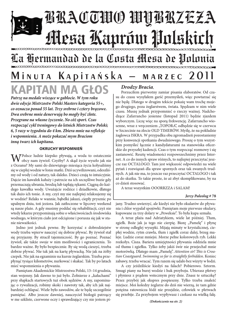 BRACTWO WYBRZEŻA Mesa Kaprów Polskich La Hermandad de la Costa Mesa de Polonia Minuta Kapitańska – marzec 2011 KAPITAN MA GŁOS Patrzę na medale wiszące w gablocie. W tym roku dwie edycje Mistrzostw Polski Masters kategoria 55+, co oznacza ponad 55 lat. Trzy srebrne i cztery brązowe. Dwa srebrne mnie denerwują bo mogły być złote. Przegrane na własne życzenie. No cóż sport. Czas rozpocząć cykl treningowy do letnich Mistrzostw Polski; 6, 5 razy w tygodniu do 4 km. Zbiera mnie na refleksje i wspomnienia. A może pokazać mym Braciom inną twarz ich kapitana. W OKRUCHY WSPOMNIEŃ Polsce ludzie kiepsko pływają, a woda to ostatecznie obcy nam żywioł. Czyżby? A skąd życie wyszło jak nie z Oceanu? My sami do dziewiątego miesiąca życia kołysaliśmy się w ciepłej wodzie w łonie matki. Dziś ucywilizowani, odeszliś my od wody i od natury, tak daleko. Dzieci czują to intuicyjnie. Dajcie im kawałek kałuży i patrzcie na ich szczęśliwe buzie gdy przemaczają ubrania, brodzą lub taplają rękami. Ciągną do każ dego kawałka wody. Uważajcie rodzice i dziadkowie, dlatego tak dużo ich tonie. A my, czyż my nie najlepiej relaksujemy się w wodzie? Relaks w wannie, bąbelki jakuzi, ciepły prysznic po upalnym dniu, toń jeziora. Jak zatłoczone w lipcowy weekend są nasze plaże. A gdy musimy poddać się rehabilitacji, czyż nie wtedy lekarze przypominają sobie o właściwościach środowiska wodnego, w którym ciało jest odciążone i porusza się jak w sta nie nieważkości. Jedno jest jednak pewne. By korzystać z dobrodziejstw wody trzeba wpierw nauczyć się dobrze pływać. By żywioł stał się przyjazny. By stracił tajemniczość. By go poznać. Poznać żywioł, ale także swoje w nim możliwości i ograniczenia. To bardzo ważne. By było bezpiecznie. By się wodą cieszyć, trzeba dobrze pływać. Nie tak jak na kartę pływacką. Nie jak na żółty czepek. Nie jak na egzaminie na kursie żeglarskim. Trzeba prze płynąć tysiące kilometrów, nurkować i skakać. Tak by po latach mieć wspomnienia o pływaniu. Pamiętam Akademickie Mistrzostwa Polski, 13–14 grudnia, stan wojenny. Jak dawno to już było. Żołnierze z „kałachami” przy słupkach startowych tuż obok sędziów. A my, zapomina jąc o rywalizacji, robimy skoki i nawroty tak, aby ich jak naj bardziej ochlapać. Wiele było zawodów, ale te będę szczególnie pamiętać. Albo jeszcze dawniej, nauczyciel biologii patrzący w me szkliste, czerwone oczy i sprawdzający czy nie jestem pi Drodzy Bracia, Porzuciłem pierwotny zamiar pisania elaboratów. Od cza su do czasu wysyłałem garść przemyśleń, więc powtarzać się nie będę. Dlatego w drugim tekście pokażę wam trochę moje go drugiego, poza żeglarstwem, świata. Spędzam w nim wiele czasu. Muszę jednak przypomnieć o rzeczy ważnej. Nadcho dzące Zafarrancho jesienne (listopad 2011) będzie zjazdem wyborczym. Liczę więc na sporą frekwencję. Zafarrancho wio senne, wraz z wręczeniem „TOPORA”, odbędzie się w czerwcu w Szczecinie na zlocie OLD TIMERÓW. Myślę, że na pokładzie żaglowca ISKRA. W przypadku obu zgromadzeń pozostaniemy przy konwencji spotkania dwudniowego. Proszę o tym wszyst kim pomyśleć łącznie z kandydaturami na stanowiska oficer skie do przyszłej kadencji. Czas o tym rozpocząć rozmowy i się zastanowić. Resztę wiadomości rozpowszechnimy przez Inter net. A co do innych spraw różnych, to najlepiej przeczytać jesz cze raz OCTALOGO. Tam jest większość odpowiedzi na wiele pytań i rozwiązań dla spraw spornych oraz tak zwanych trud nych. A jak nie ma, to jeszcze raz przeczytać OCTALOGO i tak aż do skutku. To takie proste, że aż zbyt skomplikowane, by na co dzień stosować. A teraz wszystkim OOORRZZA i SALAM! Jerzy Paleolog # 78 jany. Trudno uwierzyć, ale kiedyś nie było okularów do pływa nia i chlor wypalał spojówki. Pamiętam moje pierwsze okulary, kupowane za trzy dolary w „Peweksie”. To była kupa szmalu. A teraz plaża nad Adriatykiem, wiele lat później. Tłum, zgiełk. Boże jak ja tego nie cierpię. Biorę „Pamelę” i płynę w stronę odległej wysepki. Mijają minuty w krystalicznej, cie płej wodzie, rytm crawla, tłum i zgiełk coraz dalej, brzeg ma leje. Ludzie coraz mniejsi. Morze pełne kolorowych ryb. Lekki rozkołys. Cisza. Bariera umiejętności pływania oddziela mnie od tłumu i zgiełku. Tylko żeby jakiś świr nie przejechał mnie motorówką. Dlatego mam „Pamelę”. Attention sir! This is Croatian Coastguard. Swimming so far is straightly forbidden. Koniec zabawy, trzeba wracać. Tym razem się udało bez wizyty w łodzi. A czy jeździliście kiedyś na falach? Pobierowo. Sztorm. Smugi piany na burej wodzie i huk przyboju. Ubierasz płetwy i płyniesz z prądem wstecznym przy dnie. Znasz te sztuczkę? Przez przybój jak ekspres pospieszny. Tylko trzeba znaleźć miejsce. Moi koledzy żeglarze do dziś nie wierzą, że tam gdzie potężna ratownicza łódź nie przejdzie, człowiek w płetwach się przebije. Za przybojem wypływasz i czekasz na wielką falę. (Dokończenie na str. 2) Minuta Kapitańska – marzec 2011 2 KAPITAN MA GŁOS OKRUCHY WSPOMNIEŃ C.D. (Dokończenie ze str. 1) Przypomina mi się wspaniały ob raz Ajwazowskiego Dziewiąta fala. Wreszcie wzbiera. To ta! Gaz do dechy, w stronę brzegu. Fala unosi twe nogi wysoko, a do połowy wy nurzone ciało staje się deską surfin gową. Ale jazda! Warto umieć wy skoczyć z takiej fali. Inne wspomnienie. Koniec lata. Bajecznie kolorowe drzewa. Gdzieś nad norweskim fiordem próbujemy wejść do lodowatej wody. Przegię cie, nie da rady. Hi! Kto to woła? Dwie panie około 60-tki wskakują do morza. Hi! Fajna woda. Cholera ci Skandynawowie. Nie mamy od wrotu. Skoro one, to my też. Woda parzy. A potem...nawet nie jest tak źle, a potem ...super. Albo Islandia. Kraina diabła. Dym wali z ziemi. Fukają gejzery. Siarka. Tu Amerykanie testowali swe księżycowe pojazdy do