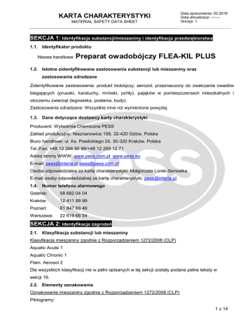 KARTA CHARAKTERYSTYKI MATERIAL SAFETY DATA SHEET Data opracowania: 02.2016 Data aktualizacji: ------Wersja: 1 SEKCJA 1: Identyfikacja substancji/mieszaniny i identyfikacja przedsiębiorstwa 1.1. Identyfikator produktu Nazwa handlowa: Preparat owadobójczy FLEA-KIL PLUS 1.2. Istotne zidentyfikowane zastosowania substancji lub mieszaniny oraz zastosowania odradzane Zidentyfikowane zastosowania: produkt biobójczy; aerozol; przeznaczony do zwalczania owadów biegających (prusaki, karaluchy, mrówki, pchły), pająków w pomieszczeniach mieszkalnych i otoczeniu zwierząt (legowiska, posłania, budy). Zastosowania odradzane: Wszystkie inne niż wymienione powyżej. 1.3. Dane dotyczące dostawcy karty charakterystyki Producent: Wytwórnia Chemiczna PESS Zakład produkcyjny: Nieznanowice 158, 32-420 Gdów, Polska Biuro handlowe: ul. Ks. Pawlickiego 24, 30-320 Kraków, Polska Tel./Fax: +48 12 266 90 98/+48 12 269 12 71 Adres strony WWW: www.pess.com.pl www.pess.eu E-mail: [email protected] [email protected] Osoba odpowiedzialna za kartę charakterystyki: Małgorzata Lorek-Serwatka E-mail osoby odpowiedzialnej za kartę charakterystyki: [email protected] 1.4. Numer telefonu alarmowego Gdańsk: 58 682 04 04 Kraków: 12 411 99 99 Poznań: 61 847 69 46 Warszawa: 22 619 66 54 SEKCJA 2: Identyfikacja zagrożeń 2.1. Klasyfikacja substancji lub mieszaniny Klasyfikacja mieszaniny zgodnie z Rozporządzeniem 1272/2008 (CLP) Aquatic Acute 1 Aquatic Chronic 1 Flam. Aerosol 2 Dla wszystkich klasyfikacji nie w pełni opisanych w tej sekcji zostały podane pełne teksty w sekcji 16. 2.2. Elementy oznakowania Oznakowanie mieszaniny zgodnie z Rozporządzeniem 1272/2008 (CLP) Piktogramy: 1 z 14 KARTA CHARAKTERYSTYKI MATERIAL SAFETY DATA SHEET Data opracowania: 02.2016 Data aktualizacji: ------Wersja: 1 Hasło ostrzegawcze: Niebezpieczeństwo Zwroty informujące o zagrożeniu: H222 Skrajnie łatwopalny aerozol H229 Pojemnik pod ciśnieniem: ogrzanie grozi wybuchem H317 Może powodować reakcję alergiczną skóry H410 Działa bardzo toksycznie na organizmy wodne, powodując długotrwałe skutki Zwroty wskazujące środki ostrożności (zapobieganie): Przechowywać z dala od źródeł ciepła, gorących powierzchni, źródeł iskrzenia, P210 otwartego ognia i innych źródeł zapłonu. Nie palić. P211 Nie rozpylać nad otwartym ogniem lub innym źródłem zapłonu. P251 Nie przekłuwać ani nie spalać, nawet po zużyciu. P273 Unikać uwolnienia do środowiska Zwroty wskazujące środki ostrożności (przechowywanie): P410+P412 Chronić przed światłem słonecznym. Nie wystawiać na działanie temperatury przekraczającej 50°C/122°F Informacje uzupełniające: ŚRODKI OSTROŻNOŚCI: Stosować w dobrze wentylowanym pomieszczeniu. Przed zastosowaniem zabezpieczyć akwaria z rybkami i terraria, powierzchnie stykające się z żywnością i paszami, naczynia, zabawki i inne przedmioty mogące stanowić źródło niezamierzonego spożycia preparatu. Nie wdychać rozpylonej cieczy. Nie jeść, nie pić i nie palić podczas używania produktu. Unikać zanieczyszczenia skóry i oczu. Dokładnie umyć ręce po użyciu. Chronić przed dziećmi. BEZPOŚREDNIE I POŚREDNIE UBOCZNE SKUTKI STOSOWANIA: W przypadku wdychania może wystąpić podrażnienie dróg oddechowych. PIERWSZA POMOC: W przypadku: *połknięcia: wypłukać usta; *kontaktu ze skórą: przemyć wodą z mydłem; *kontaktu z oczami: płukać dużą ilością wody przez co najmniej 15 minut; *wdychania: wyjść na świeże powietrze. Zasięgnąć porady/zgłosić się pod opiekę lekarza: jeżeli pojawią się dodatkowe niepokojące objawy, pokazać opakowanie. SPOSOBY I ŚRODKI USUWANIA SKAŻENIA PRODUKTEM: Obszar wyizolować – odciąć źródło skażenia środowiska. Chronić źródła wody. Stosować suche sorbenty naturalne – roślinne. Odpad zebrać do oznakowanych pojemników i unieszkodliwić zgodnie z obowiązującymi przepisami. 2 z 14 Data opracowania: 02.2016 Data aktualizacji: ------Wersja: 1 KARTA CHARAKTERYSTYKI MATERIAL SAFETY DATA SHEET POSTĘPOWANIE Z ODPADAMI: Zużyty produkt oraz opakowanie można usuwać wraz z odpadami komunalnymi. Pozostałości niezużytego produktu przekazać podmiotom wyspecjalizowanym w odzysku i unieszkodliwianiu odpadów. Kod odpadów: produktu: 07 04 99, opakowania: 15 01 04 - metal, 15 01 02 - tworzywo sztuczne. Produkt przechowywać w oryginalnym opakowaniu. Nie zamrażać. Przechowywać z dala od artykułów żywnościowych. 2.3. Inne zagrożenia Nie są znane żadne szczególne zagrożenia, o ile przestrzegane są przepisy/zalecenia dotyczące przechowywania i postępowania z produktem. SEKCJA 3: Skład /informacja o składnikach 3.1. Substancje Nie dotyczy. 3.2. Mieszaniny Charakterystyka chemiczna: Preparat złożony. Produkt w postaci płynnej (alkohol etylowy, substancja czynna – PBO, tetrametryna, permetryna) w opakowaniu aerozolowym (propelent - propan, butan). NAZWA CHEMICZNA STĘŻENIE W PRODUKCIE [ [%] wag. NR CAS / EC NR INDEKSOWY Eter 2-(2-butoksyetoksy)etylo-6propylpiperonylowy; Butotlenek Piperonylu; Piperonyl Butoxide; PBO 0,60 51-03-6 / 200076-7 Reg. no: 012119537431-460000 Tetrametryna; Tetramethrin 0,30 7696-12-0 / 231-711-6 ------------ Permetryna; 3-fenoksybenzylo (1RS,3RS;1RS,3SR)-3-(2,2dichlorowinylo)-2,2-dimetylocyklopropanokarboksylan; Permethrin (ISO) m-phenoxybenzyl 3-(2,2dichlorovinyl)-2,2dimethylcyclopropanecarboxylate (Cis:trans 25:75) 0,10 52645-53-1 / 258-067-9 Alkohol etylowy (etanol) 55,6 64-17-5 / 200-578-6 603-002-00-5 74-98-6 / 200-827-9 601-003-00-5 106-97-8/ 203-448-7 601-004-00-0 Propan 613-058-00-2 propelent Butan KLASYFIKACJA (ROZPORZĄDZENIE 1272/2008 CLP) Aquatic Acute 1; H400, M=1 Aquatic Chronic 1; H410 Aquatic Acute 1; H400, M=1 Aquatic Chronic 1; H410 Acute Tox. 4*; H332, Acute Tox. 4*; H302, Skin Sens. 1; H317, Aquatic Acute 1; H400, M=1000 Aquatic Chronic 1; H410 Flam. Liq. 2; H225 Flam. Gas 1; H220 Press. Gas Flam. Gas 1; H220 Press. Gas Dla wszystkich kl