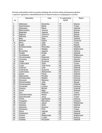 Komisja wojewódzka konkursu języka polskiego dla uczniów szkoły podstawowej zgodnie z zapisami regulaminu zakwalifikowała do III stopnia konkursu następujących uczniów: Nazwisko Imię Lp. 1 2 3 4 5 6 7 8 9 10 11 12 13 14 15 16 17 18 19 20 21 22 23 24 25 26 27 28 29 30 31 32 33 34 35 36 37 38 39 40 41 42 43 44 45 46 47 Afeltowicz Alechniewicz Aleksejew Baborowska Baginska Bagniuk Balińska Beta Bieliński Birna Bugiel Burdzanowska Bury Burzyńska Chabik Chmielecka Chrzanowska Cichocka Cisiak CYBULSKA Czaja Czapran Czarnecka Czatrowska Dacka Dąbrowska Dembkowska Denysiuk Dobranowska Domanowska Domański Drabina Drozd Dus Dzierżanowska Dzwonkowski Fierka Fingajska Florczyk Garbacz Gieracha Gliniewicz Glock Gotkiewicz Górska Graban Grabias Dominika Marta Maria Joanna Jagoda Joannna Joanna Olga Dawid Julia Zofia Weronika Natalia Jagoda Emilia Julia Dagmara Zuzanna Zuzanna Zofia Julia Anna Julia Zuzanna Aleksandra Paula Rozalia Natalia Mateusz Julia Maja Łukasz Michał Maja Wiktoria Nadia Jerzy Agnieszka Marcelina Jakub Zofia Szymon Piotr Jagoda Julia Małgorzata Lucjan Krzysztof % wykonania zadań 77 70 75 70 73 70 78 70 70 70 80 70 70 82 72 85 70 72 80 70 80 75 80 80 75 80 85 72 78 80 70 82 80 70 75 73 80 70 78 85 70 70 85 82 70 70 77 Rejon Gdynia Tczew Gdańsk Gdynia Słupsk Słupsk Słupsk Gdańsk Chojnice Tczew Słupsk Gdańsk Wejherowo Kartuzy Gdańsk Wejherowo Kwidzyn Gdynia Gdańsk Tczew Gdańsk Gdańsk Gdańsk Gdynia Gdańsk Kartuzy Kartuzy Gdańsk Słupsk Gdańsk Kwidzyn Gdańsk Gdańsk Tczew Gdynia Tczew Kartuzy Kwidzyn Wejherowo Gdańsk Gdynia Tczew Gdańsk Gdańsk Wejherowo Kartuzy Gdańsk 48 49 50 51 52 53 54 55 56 57 58 59 60 61 62 63 64 65 66 67 68 69 70 71 72 73 74 75 76 77 78 79 80 81 82 83 84 85 86 87 Grabowska Grossi Grot Gruba Grzenkowicz Grzywińska Hałaczkiewicz Hennig Hinc Hołomiej Hyży Jackiewicz Jaczyńska Jaksina Jakubowski Jarkiewicz Jaroszuk Jeka Jewiarz Juźwiak Kaczerzewska Kaczmarek Kalenik Karwik Kempa Kentner Kędzior Kierska Klain Klimkowska Kokosińska Kołakowska Konieczna Kosecka Kostrzewa Kotłowski Kozikowska Kozłowska Krupka Kurowska Nikola 75 Tullia 77 Wiktoria 75 Bartosz Sławomir 70 Alicja 70 Zuzanna 70 Izabela 82 Zofia Urszula 77 Klara 82 Maria 77 Emilia 73 Oliwia 91 Aleksandra 70 Zuzanna 87 Kamil Jakub 78 Marcel Tymoteusz 78 Igor 87 Jowita Anna 73 Klaudia 77 Zofia 80 Iga 75 Bianka 80 Emily 72 Maciej 70 Maksymilian 87 Maja 70 Alicja 70 Julia Karolina 70 Michalina 80 Antonina 78 Michalina 77 Laura 70 Julia 78 Oliwia 75 Julia 85 Oliwier 78 Karolina 77 Nadia 70 Katarzyna 70 Michalina 80 Gdańsk Gdynia Kartuzy Wejherowo Gdańsk Gdańsk Gdynia Gdańsk Gdańsk Gdynia Wejherowo Słupsk Tczew Gdynia Wejherowo Wejherowo Gdynia Wejherowo Kartuzy Gdańsk Gdynia Gdynia Gdańsk Gdynia Gdynia Gdynia Kwidzyn Chojnice Kwidzyn Kwidzyn Gdańsk Kościerzyna Słupsk Tczew Wejherowo Wejherowo Gdynia Gdańsk Gdańsk Słupsk 88 89 90 91 92 93 94 95 96 97 Kwapisz Kwaśniewska Ledóchowska Leik Lewandowska Lipiński Littwin Loeppcke Łącki Maria Julia Aniela Weronika Magdalena Adela Igor Martyna Julia Szymon Piotr Olga 80 70 75 77 75 70 70 70 70 75 Słupsk Kościerzyna Gdynia Kartuzy Gdańsk Gdańsk Chojnice Gdańsk Kościerzyna Gdańsk 98 Łukaszewski Jakub 75 Gdynia Łucka 99 100 101 102 103 104 105 106 107 108 109 110 111 112 113 114 115 116 117 118 119 120 121 122 123 124 125 126 127 128 129 130 131 132 133 134 135 136 137 138 139 140 141 142 143 144 145 146 147 148 149 150 151 Makaruk Markiewicz Markowska Marszk Matejewska Matla Mądrzejewska Mechlińska Miąskowska Mikołajczuk Milewski Mindykowski Momprivé Mroczko Mstowska Nalewajko Narloch Niedziela Nowak Oberda Obiegły Okliński Ostrowska Ośka Pajkowski Pawłowski Pełka Peplińska Perfikowska Pichlak Piotrowicz Piotrowska Pirch Podlewska Poroszewska Posańska Pozorska Prena Prochera Raikowska Rąpała Rolbiecki Romejko Romejko Rychter Rymarzak Ryńska Sadkowski Samuś Sapieżyńska Siewert Sikorska Sitarska Olimpia Natalia Aniela Agnieszka Natalia Dominika Emilia Marta Marta Igor Maksymilian Ernest Nina Iga Zuzanna Oliwia Paulina Ewa Agata Marta Olaf Kacper Mateusz Paulina Maja Maciej Kacper Renata Zofia Hanna Maja Agata Joanna Marta Julia Zofia Ewa Karolina Nela Eliza Maria Wiktoria Julia Julia Katarzyna Marcin Adam Hanna Aleksandra Amelia Monika Julia Michał Nicola Natalia Barbara Aleksandra Teresa Aleksandra 72 70 70 70 73 70 72 82 80 73 70 70 70 77 72 72 70 70 80 75 72 73 73 75 78 77 72 70 83 70 73 70 70 72 77 73 70 80 73 72 70 77 77 77 72 82 70 73 70 87 70 80 70 Gdańsk Słupsk Słupsk Kartuzy Wejherowo Kwidzyn Chojnice Gdańsk Gdynia Słupsk Kartuzy Tczew Gdynia Gdynia Gdynia Gdynia Kościerzyna Tczew Słupsk Gdańsk Gdynia Kwidzyn Słupsk Gdynia Tczew Gdynia Gdańsk Tczew Kwidzyn Gdynia Wejherowo Kwidzyn Kościerzyna Gdynia Gdańsk Wejherowo Gdańsk Wejherowo Wejherowo Gdynia Wejherowo Kościerzyna Gdańsk Gdańsk Kościerzyna Gdynia Wejherowo Słupsk Tczew Gdańsk Gdynia Kościerzyna Słupsk 152 153 154 155 156 157 158 159 160 161 162 163 164 165 166 167 168 169 170 171 172 173 174 175 176 177 178 179 180 181 182 183 184 185 186 187 188 189 190 191 192 193 194 195 196 197 Skołysz Słomiński Smater Socha Sowińska Stencel Strelau Stromska Strzeszewska Stybor Styrkowski Sulewska Suliga Surawska Suszko Szafarewicz Szczypińska Szewczyk Szpejna Szura Szwedun Szymańska Szymkowiak Templin Toczyński Tracz Ulrych Werra Węsierska Wieliczko Witusińska Własów Wodowska Wojtkowska Wołoszyn Zachara Zalewska Załęska Zamojski Zawal Zawicka Zboińska Zielińska Zielke Żarnowska Żyra Alicja Dominik Dominik Amelia Dominika Nadia Aleksandra Adam Martyna Paulina Anna Dominik Dominika Szymon Agnieszka Agnieszka Aleksandra Anna Agata Daniela Zuzanna Wiktoria Urszula Weronika Aleksandra Krzysztof Maria Elżbieta Małgorzata Zofia Amelia Weronika Martyna Iga Agata Karolina Emilia Kamila Izabela Weronika Weronika Mikołaj Natalia Maria Magda Martyna Małgorzata Izabella Zofia Zuzanna 73 87 75 70 72