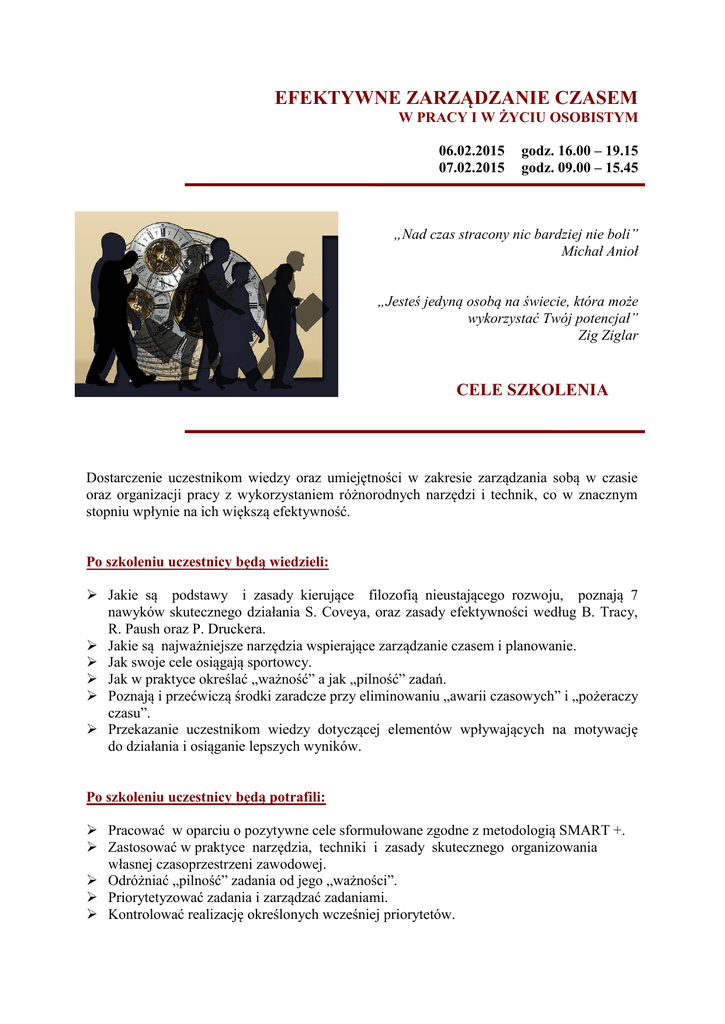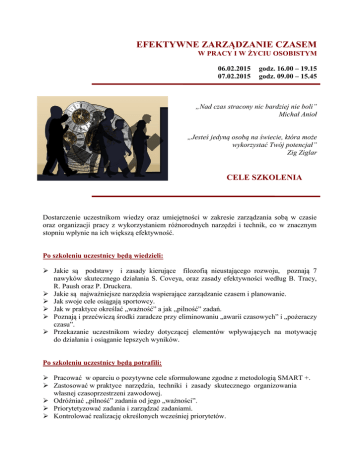EFEKTYWNE ZARZĄDZANIE CZASEM W PRACY I W ŻYCIU OSOBISTYM 06.02.2015 07.02.2015 godz. 16.00 – 19.15 godz. 09.00 – 15.45 „Nad czas stracony nic bardziej nie boli” Michał Anioł „Jesteś jedyną osobą na świecie, która może wykorzystać Twój potencjał” Zig Ziglar CELE SZKOLENIA Dostarczenie uczestnikom wiedzy oraz umiejętności w zakresie zarządzania sobą w czasie oraz organizacji pracy z wykorzystaniem różnorodnych narzędzi i technik, co w znacznym stopniu wpłynie na ich większą efektywność. Po szkoleniu uczestnicy będą wiedzieli: Jakie są podstawy i zasady kierujące filozofią nieustającego rozwoju, poznają 7 nawyków skutecznego działania S. Coveya, oraz zasady efektywności według B. Tracy, R. Paush oraz P. Druckera. Jakie są najważniejsze narzędzia wspierające zarządzanie czasem i planowanie. Jak swoje cele osiągają sportowcy. Jak w praktyce określać „ważność” a jak „pilność” zadań. Poznają i przećwiczą środki zaradcze przy eliminowaniu „awarii czasowych” i „pożeraczy czasu”. Przekazanie uczestnikom wiedzy dotyczącej elementów wpływających na motywację do działania i osiąganie lepszych wyników. Po szkoleniu uczestnicy będą potrafili: Pracować w oparciu o pozytywne cele sformułowane zgodne z metodologią SMART +. Zastosować w praktyce narzędzia, techniki i zasady skutecznego organizowania własnej czasoprzestrzeni zawodowej. Odróżniać „pilność” zadania od jego „ważności”. Priorytetyzować zadania i zarządzać zadaniami. Kontrolować realizację określonych wcześniej priorytetów. Planować swój dzień i tydzień pracy Planować i prowadzić projekty w oparciu o skuteczne techniki (Wykres Gantta, Planowanie Wstecz) Stosować Diagram Ishikawy oraz technikę 5 WHY w celu szybszego rozwiązywania problemów i podejmowania decyzji. Po szkoleniu uczestnicy będą przekonani: Że dzięki stosowaniu zasad zarządzania sobą w czasie można uzyskać zarówno wysoką efektywność jak i Work-life balance. Że zarządzamy sobą a nie czasem. Że warto planować i warto priorytetyzować. O swoich mocnych stronach i dobrych praktykach w zakresie zarządzania sobą w czasie. O znaczeniu pozytywnych nawyków automotywacyjnych. PROPONOWANY PROGRAM SZKOLENIA PROGRAM SZKOLENIA (2 DNI – 12 GODZIN EDUKACYJNYCH) MODUŁ 1. EFEKTYWNOŚĆ OSOBISTA OPIS Efektywność osobista – definicja Jak to się robi w Japonii, czyli KAIZEN - filozofia ciągłego rozwoju Koncepcje efektywności wg S.Coveya, B. Tracy, R. Paush i innych Doświadczenie, jako podstawowy element uczenia się i zmiany postępowania Prezentacja + ćwiczenia + dyskusja 2. NAWYKI SKUTECZNEGO DZIAŁANIA - BUDOWANIE PRYWATNEGO ZWYCIĘSTWA Zwycięstwo, czyli czego możemy nauczyć się od sportowców? Rola przekonań w psychologii sukcesu – dialogi wewnętrzne i wewnętrzne przekonania o Przekonania mobilizujące i motywujące do podnoszenia profesjonalizmu Proaktywnosć vs reaktywność – pętla przekonań wzmacniających o Odpowiedzialność za własne życie, pracę i realizację celów Bariery wynikowe Jak przełamać psychiczne ograniczenia Czy Twoje przekonania są zdrowe? – wstęp do RTZ Zasady wizji i wyobrażenia w kształtowaniu efektywności i zwycięstwa. Case study + ćwiczenia + mini wykład + dyskusja + ćwiczenie indywidualne 3. WYZNACZANIE CELÓW – SPOSÓB NA SUKCES Cele firmy w przełożeniu na obowiązki zespołowe i jednostkowe Zasady konstruowania celów Zasady wzmacniania celów Case study + ćwiczenia + mini wykład + dyskusja 4. CZAS JAKO WARTOŚĆ Ile warta jest godzina? Czas w moim życiu ZARZĄDZANIE i w mojej pracy BUDŻETEM CZASU AUDYT konsumpcji czasu - Komasowanie czasu I MULTITASKING i znajdowanie rezerw Multitasking Czas w moim codziennym funkcjonowaniu - Twoja krzywa REFA Sprawy pilne i ważne – ustalanie priorytetów metodą Eisenhowera Hierarchia zadań (Zasada Pareto, Zasada ABC) Organizowanie dnia pracy – Złote Godziny i zasada 60/20/20 Poszukiwanie rezerw czasowych – prawo Parkinsona Dyskusja moderowana + ćwiczenia + wnioski 5. HARMONOGRAMY, NARZĘDZIA PROJEKTOWE I PLANISTYCZNE Planowanie dnia i harmonogram List ToDo Plany średniego zasięgu Model skutecznego planu Uwzględnienie problemów i awarii Metodologia Davida Allena - Getting Things Done Wykres Gantta Planowanie WSTECZ Case study + ćwiczenia + omówienie 6. MONITORING DZIAŁAŃ Przeszkody w zarządzaniu sobą w czasie Kontrola i wpływ, jako czynniki niwelujące powstawanie barier czasowych Sposoby walki z prokrastynacją Wpływ przestrzeni i dystraktorów na efektywność pracy – 5S Prezentacja trenera + ćwiczenia wdrożeniowe + dyskusja 7. PODEJMOWANIE DECYZJI Wahanie i niezdecydowanie jako potencjalne czasopożeracze i stresory Analiza konsekwencji – technika 5 WHY Diagram Ishikawy - Analiza typowych problemów związanych z zarządzaniem czasem Case study + ćwiczenia Cena: 210 zł