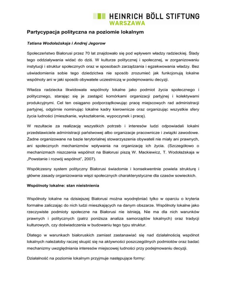 Partycypacja polityczna na poziomie lokalnym Tatiana WodołaŜskaja i Andrej Jegorow Społeczeństwo Białorusi przez 70 lat znajdowało się pod wpływem władzy radzieckiej. Ślady tego oddziaływania widać do dziś. W kulturze politycznej i społecznej, w zorganizowaniu instytucji i struktur społecznych oraz w sposobach zarządzania i egzekwowania władzy. Bez uświadomienia sobie tego dziedzictwa nie sposób zrozumieć jak funkcjonują lokalne wspólnoty ani w jaki sposób obywatele uczestniczą w podejmowaniu decyzji. Władza radziecka likwidowała wspólnoty lokalne jako podmiot Ŝycia społecznego i politycznego, starając się je zastąpić komórkami organizacji partyjnej i kolektywami produkcyjnymi. Cel ten osiągano podporządkowując pracę miejscowych rad administracji partyjnej, odgórnie nominując lokalne kadry kierownicze oraz organizując wszystkie sfery Ŝycia ludności (mieszkanie, wykształcenie, wypoczynek i pracę). W rezultacie za realizację wszystkich potrzeb i interesów ludzi odpowiadali lokalni przedstawiciele administracji państwowej albo organizacje pracownicze i związki zawodowe. śadne organizowane na bazie terytorialnej stowarzyszenia obywateli nie miały ani prawnych, ani społecznych mechanizmów wpływania na organizację ich Ŝycia. (Szczegółowo o mechanizmach niszczenia wspólnot na Białorusi piszą W. Mackiewicz, T. WodołaŜskaja w „Powstanie i rozwój wspólnot”, 2007). Współczesny system polityczny Białorusi świadomie i konsekwentnie powiela strukturę i główne zasady organizowania więzi społecznych charakterystyczne dla czasów sowieckich. Wspólnoty lokalne: stan nieistnienia Wspólnoty lokalne na dzisiejszej Białorusi moŜna wyodrębniać tylko w oparciu o kryteria formalne zaliczając do nich ludzi mieszkających na danym obszarze. Wspólnoty lokalne jako rzeczywiste podmioty społeczne na Białorusi nie istnieją. Nie ma dla nich warunków prawnych i politycznych (patrz poniŜsza analiza samorządów lokalnych) oraz tradycji kulturowych, czy doświadczenia w budowaniu tego typu struktur. Dlatego w warunkach białoruskich zamiast zastanawiać się nad działalnością wspólnot lokalnych naleŜałoby raczej skupić się na aktywności poszczególnych podmiotów oraz badać mechanizmy uwzględniania interesów miejscowej ludności przy podejmowaniu decyzji. Działalność na poziomie lokalnym przyjmuje następujące formy: - Aktywność indywidualna i małych grup (najczęściej nieformalnych). Są to grupy ludzi zafascynowane jakimiś konkretnymi dziedzinami (kulturą, sportem, historią). Ich zainteresowania i aktywność ograniczają się do wąskiego kręgu tematów i na ogół nie dochodzą do szczebla miasta czy gminy. Tego rodzaju ludzie czy grupy świadomie nie starają się nawiązać kontaktów z organami państwowymi ani z organizacjami społecznymi, czy teŜ politycznymi. - Działalność regionalnych przedstawicielstw partii i stowarzyszeń o ogólnokrajowym zasięgu oraz organizacji lokalnych. Grupy te zrzeszają praktycznie wszystkich aktywnych politycznie i społecznie ludzi w danym regionie. Często ci sami ludzie reprezentują w swoim regionie kilka stowarzyszeń i partii jednocześnie. Aktywność takich stowarzyszeń bardzo osłabła w ostatnich latach i ogranicza się głównie do walki o przetrwanie. Nie mają one Ŝadnego istotnego wpływu na podejmowanie waŜnych lokalnie decyzji. - Działalność państwowych organizacji pozarządowych (tzw. GoNGO), takich jak Białoruski Republikański Związek MłodzieŜy, rady społeczne, związki kombatantów, Biała Ruś, związki zawodowe itd. Ich aktywność jest bezpośrednio związana z działalnością lokalnych organów władzy wykonawczej. Występują jako współinicjatorzy albo wykonawcy ich najróŜniejszych akcji i projektów. Nie mają samodzielnej polityki ani odrębnych interesów. Członkostwo w tych strukturach, choć obowiązkowe dla większości pracowników bądź studentów państwowych instytucji, jest czysto formalne. Część z wyŜej wymienionych podmiotów twierdzi, iŜ reprezentuje interesy miejscowej ludności, jednak w praktyce nie mają one Ŝadnych moŜliwości wpływania na podejmowanie decyzji. Wszystkie decyzje dotyczące Ŝycia ludzi zapadają w ramach pionowej struktury władzy. Mogą one uwzględniać interesy lokalnej ludności na trzy sposoby. 1. Zakłada się, Ŝe interesy i potrzeby miejscowej ludności wpisują się w wizję rozwoju kraju tworzoną przez centralne organy władzy. Te rzekome interesy uwzględniane są w regionalnych programach rozwoju opracowywanych w hierarchicznym systemie: państwowojewództwo - powiat - gmina. 2. Czasem szefowie lokalnych organów władzy osobiście zabiegają w wyŜszych instancjach władzy, by potrzeby miejscowej ludności były uwzględniane w poszczególnych decyzjach administracyjnych. Taki mechanizm funkcjonuje dopóty, dopóki władzę sprawuje konkretny „dobry” urzędnik. 3. Lobbowanie na rzecz interesów poszczególnych grup odbywa się poprzez system klanowy. Są miasta i regiony, gdzie funkcjonują nieformalne wspólnoty szefów najwaŜniejszych miejscowych instytucji i przedsiębiorstw powiązanych ze sobą koligacjami rodzinnymi. Takie wspólnoty wykorzystują często rozmaite nieformalne sposoby oddziaływania. Promując swoje osobiste interesy, przy okazji zapewniają waŜne dla rozwoju danego regionu inwestycje. W poszczególnych przypadkach skonsolidowane grupy miejscowej ludności są w stanie wpłynąć na podejmowane decyzje. W największej wsi Białorusi (Olszanach) około połowa mieszkańców to protestanci zajmujący się głównie działalnością rolniczą (hodowla i sprzedaŜ ogórków). Udaje im się zawierać kompromisy z lokalną władzą, która podejmuje korzystne dla nich decyzje. (Np. na ich Ŝyczenie wybudowano we wsi stację benzynową). Jednak są to odosobnione, jeśli w ogóle nie unikalne, przypadki i mało jest gmin, gdzie moŜna zaobserwo