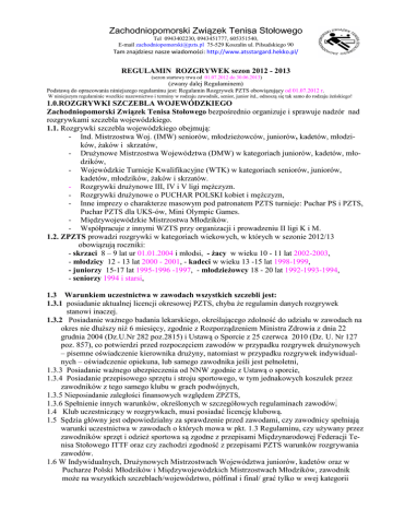 Zachodniopomorski Związek Tenisa Stołowego Tel 0943402230, 0943451777, 605351540, E-mail [email protected] 75-529 Koszalin ul. Piłsudskiego 90 Tam znajdziesz nasze wiadomości: http://www.atsstargard.hekko.pl/ REGULAMIN ROZGRYWEK sezon 2012 - 2013 (sezon startowy trwa od 01.07.2012 do 30.06.2013) (zwany dalej Regulaminem) Podstawą do opracowania niniejszego regulaminu jest: Regulamin Rozgrywek PZTS obowiązujący od 01.07.2012 r. W niniejszym regulaminie wszelkie nazewnictwo i terminy w rodzaju zawodnik, senior, junior itd., odnoszą się tak samo do rodzaju żeńskiego! 1.0.ROZGRYWKI SZCZEBLA WOJEWÓDZKIEGO Zachodniopomorski Związek Tenisa Stołowego bezpośrednio organizuje i sprawuje nadzór nad rozgrywkami szczebla wojewódzkiego. 1.1. Rozgrywki szczebla wojewódzkiego obejmują: - Ind. Mistrzostwa Woj. (IMW) seniorów, młodzieżowców, juniorów, kadetów, młodzików, żaków i skrzatów, - Drużynowe Mistrzostwa Województwa (DMW) w kategoriach juniorów, kadetów, młodzików, - Wojewódzkie Turnieje Kwalifikacyjne (WTK) w kategoriach seniorów, juniorów, kadetów, młodzików, żaków i skrzatów. - Rozgrywki drużynowe III, IV i V ligi mężczyzn. - Rozgrywki drużynowe o PUCHAR POLSKI kobiet i mężczyzn, - Inne imprezy o charakterze masowym pod patronatem PZTS turnieje: Puchar PS i PZTS, Puchar PZTS dla UKS-ów, Mini Olympic Games. - Międzywojewódzkie Mistrzostwa Młodzików. - Współpracuje z innymi WZTS przy organizacji i prowadzeniu II ligi K i M. 1.2. ZPZTS prowadzi rozgrywki w kategoriach wiekowych, w których w sezonie 2012/13 obowiązują roczniki: - skrzaci 8 – 9 lat ur 01.01.2004 i młodsi, - żacy w wieku 10 - 11 lat 2002-2003, - młodzicy 12 - 13 lat 2000 - 2001, - kadeci w wieku 13 -15 lat 1998-1999, - juniorzy 15-17 lat 1995-1996 -1997, - młodzieżowcy 18 - 20 lat 1992-1993-1994, - seniorzy 1994 i starsi, 1.3 Warunkiem uczestnictwa w zawodach wszystkich szczebli jest: 1.3.1 posiadanie aktualnej licencji okresowej PZTS, chyba że regulamin danych rozgrywek stanowi inaczej. 1.3.2 Posiadanie ważnego badania lekarskiego, określającego zdolność do udziału w zawodach na okres nie dłuższy niż 6 miesięcy, zgodnie z Rozporządzeniem Ministra Zdrowia z dnia 22 grudnia 2004 (Dz.U.Nr 282 poz.2815) i Ustawą o Sporcie z 25 czerwca 2010 (Dz. U. Nr 127 poz. 857), co potwierdzi przed rozpoczęciem zawodów w przypadku rozgrywek drużynowych – pisemne oświadczenie kierownika drużyny, natomiast w przypadku rozgrywek indywidualnych – oświadczenie opiekuna, lub samego zawodnika jeśli jest pełnoletni, 1.3.3 Posiadanie ważnego ubezpieczenia od NNW zgodnie z Ustawą o sporcie, 1.3.4 Posiadanie przepisowego sprzętu i stroju sportowego, w tym jednakowych koszulek przez zawodników z tego samego klubu w grach podwójnych, 1.3.5 Nieposiadanie zaległości finansowych względem ZPZTS, 1.3.6 Spełnienie innych warunków, określonych w szczegółowych regulaminach zawodów. 1.4 Klub uczestniczący w rozgrywkach, musi posiadać licencję klubową. 1.5 Sędzia główny jest odpowiedzialny za sprawdzenie przed zawodami, czy zawodnicy spełniają warunki uczestnictwa w zawodach o których mowa w pkt. 1.3 Regulaminu, czy używany przez zawodników sprzęt i odzież sportowa są zgodne z przepisami Międzynarodowej Federacji Tenisa Stołowego ITTF oraz czy zachodzi zgodność z przepisami PZTS warunków rozgrywania zawodów. 1.6 W Indywidualnych, Drużynowych Mistrzostwach Województwa juniorów, kadetów oraz w Pucharze Polski Młodzików i Międzywojewódzkich Mistrzostwach Młodzików, zawodnik może na wszystkich szczeblach/województwo, półfinał i finał/ grać tylko w swej kategorii wiekowej, tzn. w tej w której ze względu na rok urodzenia powinien w danym roku startować. 1.7 W zawodach indywidualnych i drużynowych obowiązują przepisy ITTF, PZTS oraz regulamin ZPZTS 1.8 Obowiązkiem organizatorów imprezy szczebla wojewódzkiego jest przestrzeganie programu zawodów uzgodnionego z ZPZTS, 1.9 Wszystkie rodzaje rozgrywek na szczeblu wojewódzkim winny być przeprowadzone z przestrzeganiem przepisów ITTF oraz regulaminów PZTS i ZPZTS. Odpowiedzialnością za przestrzeganie przepisów i regulaminów spoczywa na organie prowadzącym rozgrywki. 2.2 ROZGRYWKI INDYWIDUALNE 2.1.1 Ustalenie kolejności uczestników rozgrywek 2.1.1.1 W zawodach indywidualnych rozgrywanych systemem "każdy z każdym" („round robin”) o kolejności miejsc decyduje suma uzyskanych punktów. Za zwycięstwo w każdym przypadku otrzymuje się 2 punkty, za porażkę w rozegranym meczu - 1 punkt, a w przypadku oddania meczu walkowerem – 0 punktów. W zawodach drużynowych, w których istnieje możliwość uzyskania remisu, za zwycięstwo przyznaje się 2 punkty, za remis - 1 punkt, a za porażkę - 0 punktów. W Superlidze męskiej za zwycięstwo 3:0 i 3:1 przyznaje się 3 punkty, a pokonany otrzymuje 0 punktów, zaś za zwycięstwo 3:2 przyznaje się 2 punkty dla zwycięskiej drużyny i 1 punkt dla pokonanego zespołu. 2.1.1.2 Jeżeli dwóch lub więcej zawodników lub drużyn uzyska tą samą liczbę punktów, to w każdym przypadku o kolejności decydują wyniki bezpośrednich spotkań pomiędzy zawodnikami lub drużynami, które uzyskały równą ilość punktów. W takim przypadku sporządza się tabelę pomocniczą, w której uwzględnia się tylko wyniki uzyskane pomiędzy zainteresowanymi zawodnikami lub drużynami. 2.1.1.2.1 O kolejności miejsc w tabeli decyduje kolejno: - ilość punktów, - stosunek gier, - stosunek setów, - stosunek piłek. W przypadku równości powyższych kryteriów o kolejności miejsc decyduje losowanie, które przeprowadza delegat PZTS lub sędzia główny zawodów. 2.1.1.2.2 W trakcie oceny wyników - o ile jest możliwość wyłączenia lepszego lub gorszego miejsca (z większą i mniejszą ilością punktów) - należy to uczynić i rozpatrywać bilans zainteresowanych zawodników (z taką samą ilością punktów) aż do ustalenia ostate