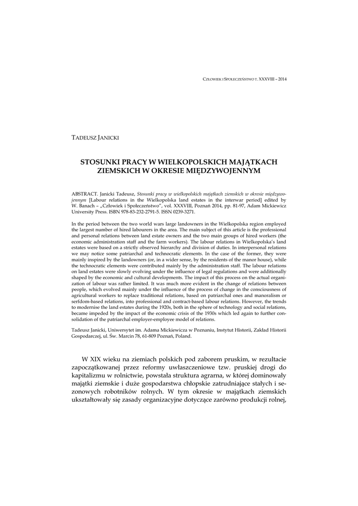 CZâOWIEK I SPOâECZEĘSTWO T. XXXVIII – 2014 TADEUSZ JANICKI STOSUNKI PRACY W WIELKOPOLSKICH MAJćTKACH ZIEMSKICH W OKRESIE MIČDZYWOJENNYM ABSTRACT. Janicki Tadeusz, Stosunki pracy w wielkopolskich majĈtkach ziemskich w okresie mičdzywojennym [Labour relations in the Wielkopolska land estates in the interwar period] edited by W. Banach – „Czãowiek i Spoãeczeęstwo”, vol. XXXVIII, Poznaę 2014, pp. 81-97, Adam Mickiewicz University Press. ISBN 978-83-232-2791-5. ISSN 0239-3271. In the period between the two world wars large landowners in the Wielkopolska region employed the largest number of hired labourers in the area. The main subject of this article is the professional and personal relations between land estate owners and the two main groups of hired workers (the economic administration staff and the farm workers). The labour relations in Wielkopolska’s land estates were based on a strictly observed hierarchy and division of duties. In interpersonal relations we may notice some patriarchal and technocratic elements. In the case of the former, they were mainly inspired by the landowners (or, in a wider sense, by the residents of the manor house), while the technocratic elements were contributed mainly by the administration staff. The labour relations on land estates were slowly evolving under the influence of legal regulations and were additionally shaped by the economic and cultural developments. The impact of this process on the actual organization of labour was rather limited. It was much more evident in the change of relations between people, which evolved mainly under the influence of the process of change in the consciousness of agricultural workers to replace traditional relations, based on patriarchal ones and manoralism or serfdom-based relations, into professional and contract-based labour relations. However, the trends to modernise the land estates during the 1920s, both in the sphere of technology and social relations, became impeded by the impact of the economic crisis of the 1930s which led again to further consolidation of the patriarchal employer-employee model of relations. Tadeusz Janicki, Uniwersytet im. Adama Mickiewicza w Poznaniu, Instytut Historii, Zakãad Historii Gospodarczej, ul. ģw. Marcin 78, 61-809 Poznaę, Poland. W XIX wieku na ziemiach polskich pod zaborem pruskim, w rezultacie zapoczĈtkowanej przez reformy uwãaszczeniowe tzw. pruskiej drogi do kapitalizmu w rolnictwie, powstaãa struktura agrarna, w której dominowaãy majĈtki ziemskie i duİe gospodarstwa chãopskie zatrudniajĈce staãych i sezonowych robotników rolnych. W tym okresie w majĈtkach ziemskich uksztaãtowaãy sič zasady organizacyjne dotyczĈce zarówno produkcji rolnej, 82 Tadeusz Janicki jak i liczby, struktury oraz hierarchii zatrudnianych w nich pracowników, które przetrwaãy upadek Rzeszy Niemieckiej i funkcjonowaãy dalej po odzyskaniu przez Polskč niepodlegãoĤci. Przedmiotem niniejszych rozwaİaę sĈ pracodawcy i pracobiorcy oraz zachodzĈce pomičdzy nimi stosunki o charakterze zawodowym, przedstawione z uwzglčdnieniem organizacji pracy w wielkopolskich majĈtkach ziemskich w okresie mičdzywojennym. W krótkim opracowaniu trudno o szczegóãowĈ charakterystykč tak zãoİonego zjawiska, dlatego naleİy je traktowaþ jako ogólny szkic, sygnalizujĈcy jedynie najwaİniejsze problemy z dziedziny stosunków pracy w wymienionych wyİej przedsičbiorstwach rolnych. Pod wzglčdem rzeczowym obejmuje ono stosunki pracy zachodzĈce w ramach wĈsko rozumianej produkcji rolnej (uprawa roĤlin i hodowla zwierzĈt), zaĤ pomija te zwiĈzane z gospodarkĈ leĤnĈ, ogrodnictwem i pracĈ w naleİĈcych do majĈtków zakãadach przemysãowych, takich jak gorzelnie, cegielnie itp. Ramy terytorialne, do jakich odnosi sič opracowanie, to teren województwa poznaęskiego w granicach administracyjnych ustalonych po I wojnie Ĥwiatowej1. W okresie mičdzywojennym w rolnictwie Wielkopolski wielka wãasnoĤþ ziemska zajmowaãa pozycjč dominujĈcĈ. W jej posiadaniu w 1921 roku znajdowaão sič 51%, w 1931 roku – 49,3%, a w 1938 roku – 47,3% gruntów rolnych2. Byãy to majĈtki Ĥredniej wielkoĤci (od 200 ha do 500 ha) prowadzĈce gospodarkč kapitalistycznĈ, z reguãy dobrze zorganizowane, zmechanizowane i uprzemysãowione oraz zatrudniajĈce duİĈ liczbč staãych robotników rolnych, a osiĈgane przez nie wyniki produkcyjne byãy wyİsze niİ w innych regionach Polski. W okoão 30% majĈtków znajdowaãy sič zakãady przemysãu rolno-spoİywczego, tartaki lub cegielnie3. WĤród wãaĤcicieli majĈtków ziemskich pod wzglčdem narodowoĤciowym dominowali Polacy, ale licznĈ grupč stanowili równieİ Niemcy. ________________ 1 Obszar województwa zmieniã sič od 1 kwietnia 1938 roku, kiedy to odãĈczono od niego powiaty: bydgoski miejski, inowrocãawski, inowrocãawski miejski, szubięski i wyrzyski, oraz trzy gminy z powiatu mogileęskiego (przyãĈczone do województwa pomorskiego), i przyãĈczono powiaty: kaliski, kolski, konięski i turecki. Jednak zasadnicze dla niniejszych rozwaİaę umowy zbiorowe dla wielkopolskiego rolnictwa na lata 1919-1939 nie objčãy nowych czčĤci województwa. Por. A. Czubięski, Wielkopolska w latach 1918-1939, Wydawnictwo Poznaęskie, Poznaę 2000, s. 167-168; S. Warkoczewski, Poãoİenie robotników rolnych w Wielkopolsce w latach 1929-1939, KsiĈİka i Wiedza, Warszawa 1965, s. 6. 2 Por. S. Nowakowski, Geografia gospodarcza Polski zachodniej, t. 1, Pomorska Drukarnia Rolnicza Sp. Akc., Poznaę 1929, s. 162; W. Roszkowski, Gospodarcza rola wičkszej prywatnej wãasnoĤci ziemskiej w Polsce 1918-1939, Szkoãa Gãówna Planowania i Statystyki, Warszawa 1986, s. 126. 3 W statystykach mičdzywojennych i powojennej literaturze przedmiotu za wielkĈ wãasnoĤþ ziemskĈ przyjčão sič uwaİaþ gospodarstwa powyİej 50 ha, gospodarstwa od 50 ha do 100 ha okreĤlano jako przejĤciowe, a dopiero powyİej tej granicy jako wielkie. 