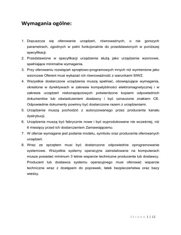 Wymagania ogólne: 1. Dopuszcza się oferowanie urządzeń, równoważnych, o nie gorszych parametrach, zgodnych w pełni funkcjonalnie do przedstawionych w poniższej specyfikacji. 2. Przedstawione w specyfikacji urządzenia służą jako urządzenia wzorcowe, spełniające minimalne wymagania. 3. Przy oferowaniu rozwiązań sprzętowo-programowych innych niż wymienione jako wzorcowe Oferent musi wykazać ich równoważność z warunkami SIWZ. 4. Wszystkie dostarczone urządzenia muszą spełniać, obowiązujące wymagania, określone w dyrektywach w zakresie kompatybilności elektromagnetycznej i w zakresie urządzeń niskonapięciowych potwierdzone kopiami odpowiednich dokumentów lub oświadczeniem dostawcy i być oznaczone znakiem CE. Odpowiednie dokumenty powinny być dostarczone razem z urządzeniami. 5. Urządzenia muszą pochodzić z autoryzowanego przez producenta kanału dystrybucji. 6. Urządzenia muszą być fabrycznie nowe i być wyprodukowane nie wcześniej, niż 6 miesięcy przed ich dostarczeniem Zamawiającemu. 7. W ofercie wymagane jest podanie modelu, symbolu oraz producenta oferowanych urządzeń. 8. Wraz ze sprzętem musi być dostarczone odpowiednie oprogramowanie systemowe. Wszystkie systemy operacyjne zainstalowane na komputerach musza posiadać minimum 3 letnie wsparcie techniczne producenta lub dostawcy. Producent lub dostawca systemu operacyjnego musi oferować wsparcie techniczne wraz z dostępem do poprawek, łatek bezpieczeństwa oraz bazy wiedzy. S t r o n a 1 | 12 Komputer przenośny TYP 1 szt. 26 Opis parametru lub wartość Lp. Nazwa Wymagane minimalne parametry liczbowa lub komponentu techniczne komputerów spełnione Do wypełnienia przez wykonawcę 1. Typ Komputer przenośny typu notebook z ekranem 14" o rozdzielczości: FHD (1920x1080) w technologii LED IPS przeciwodblaskowy, jasność min. 300 nitów, kontrast min 600:1, kąt widzenia min. pion/poziom/lewo/prawo: 85/85/85/85 stopni. 2. Zastosowanie Komputer będzie wykorzystywany dla potrzeb aplikacji biurowych, aplikacji obliczeniowych, aplikacji edukacyjnych, lokalna baza danych, dostępu do sieci Internet oraz poczty elektronicznej 3. Procesor Procesor klasy x86, 2 rdzeniowy, niskonapięciowy o TDP max 15 W, zaprojektowany do pracy w komputerach przenośnych, taktowany zegarem co najmniej 2,40 GHz, z pamięcią last level cache CPU co najmniej 4 MB lub równoważny 2 rdzeniowy procesor klasy x86 Zaoferowany procesor musi uzyskiwać jednocześnie w teście Passmark CPU Mark wynik min.: 3880 punkty (wynik zaproponowanego procesora musi S t r o n a 2 | 12 znajdować się na stronie http://www.cpubenchmark.net ) – wydruk ze strony należy dołączyć do oferty. W przypadku użycia przez oferenta testów wydajności Zamawiający zastrzega sobie, iż w celu sprawdzenia poprawności przeprowadzenia testów oferent musi dostarczyć zamawiającemu oprogramowanie testujące, oba równoważne porównywalne zestawy oraz dokładny opis użytych testów wraz z wynikami w celu ich sprawdzenia w terminie nie dłuższym niż 3 dni od otrzymania zawiadomienia od zamawiającego 4. Pamięć Min. 8 GB, jedno gniazdo pamięci wolne, operacyjna możliwość rozbudowy do min 16GB RAM 5. Parametry min. 256 GB SATA, w technologii SSD pamięci TLC masowej 6. Karta graficzna Zintegrowana w procesorze z możliwością dynamicznego przydzielenia pamięci systemowej, ze sprzętowym wsparciem dla DirectX 11, Shader 5.0, osiągająca w teście Average G3D Mark wynik na poziomie min.: 550 punktów (wynik zaproponowanej grafiki musi znajdować się na stronie http://www.videocardbenchmark.net) – wydruk ze strony należy dołączyć do oferty. S t r o n a 3 | 12 7. Wyposażenie Karta dźwiękowa zgodna z DTS, multimedialne wbudowane 2W głośniki stereo Wbudowana w obudowę matrycy kamera HD 720p wraz z dwoma mikrofonami 8. Wymagania Max 3-cell, 50WHr, Li-Ion z ogniwami dotyczące polimerowymi. Czas pracy na baterii wg baterii i dokumentacji producenta min 12 godzin. zasilania Gwarancja min 36 miesięcy. Zasilacz o mocy max 45W Możliwość podłączenia dodatkowej baterii 6-cell (60WHr) pod dedykowane złącze baterii dodatkowej – czas pracy wg dokumentacji producenta na dwóch bateriach min 30 godzin. Gwarancja na baterię dodatkową min 36 miesięcy. 9. 10. Zgodność z Zgodność z 64-bitową wersją systemu systemami operacyjnego Microsoft Windows 8 operacyjnymi i Professional PL oraz Windows 7 standardami Professional PL Certyfikaty i Certyfikat ISO 9001:2000 dla standardy producenta sprzętu (należy załączyć do oferty) Certyfikat ISO 14001 dla producenta sprzętu (należy załączyć do oferty) Deklaracja zgodności CE (załączyć do oferty) Zgodność z dyrektywą RoHS Unii Europejskiej o eliminacji substancji niebezpiecznych (załączyć oświadczenie Wykonawcy) Wydruk ze strony WHCL Microsoft potwierdzający zgodność oferowanego komputera z S t r o n a 4 | 12 oferowanym system operacyjnym Certyfikat EnergyStar 5.0 – komputer musi znajdowac się na liście zgodności dostępnej na stronie www.energystar.gov 11. Ergonomia Głośność jednostki centralnej mierzona zgodnie z normą ISO 7779 oraz wykazana zgodnie z normą ISO 9296 w pozycji operatora w trybie (IDLE) wynosząca maksymalnie 21dB (wartość do zweryfikowania w dokumentacji technicznej komputera, załączyć oświadczenie Wykonawcy). 12. Waga i wymiary Waga max. 1,60 kg z baterią 3-cell Szerokość: max. 340 mm Głębokość: max. 240 mm Wysokość przód: max. 22 mm 13 Bezpieczeństw 1. o cechy: - BIOS musi posiadać następujące możliwość autoryzacji przy starcie komputera każdego użytkownika jego hasłem indywidualnym lub hasłem administratora - kontrola sekwencji startowej (boot- ącej); - możliwość startu systemu z urządzenia USB - funkcja blokowania startu (BOOT- owania) stacji roboczej z zewnętrznych urządzeń - BIOS musi zawierać nieulotną informację z nazwą produktu, jego numerem seryjnym, wersją BIOS, S t r o n a 5 | 
