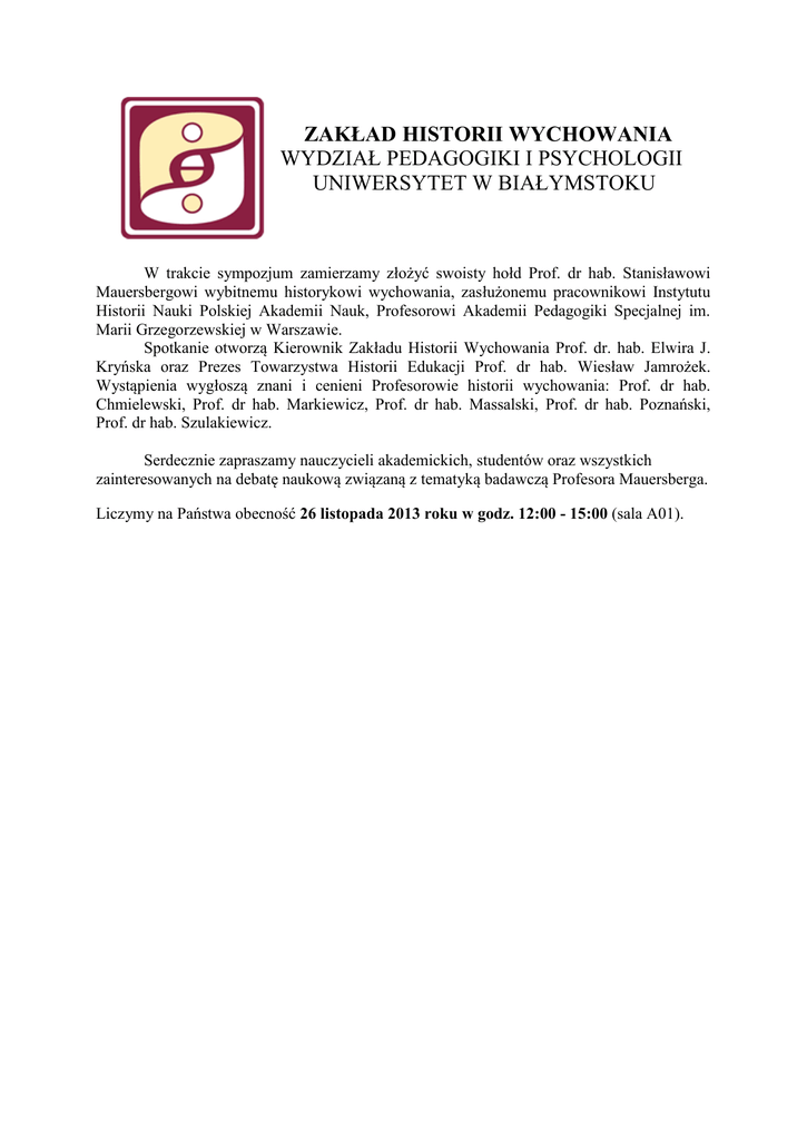 ZAKŁAD HISTORII WYCHOWANIA WYDZIAŁ PEDAGOGIKI I PSYCHOLOGII UNIWERSYTET W BIAŁYMSTOKU W trakcie sympozjum zamierzamy złożyć swoisty hołd Prof. dr hab. Stanisławowi Mauersbergowi wybitnemu historykowi wychowania, zasłużonemu pracownikowi Instytutu Historii Nauki Polskiej Akademii Nauk, Profesorowi Akademii Pedagogiki Specjalnej im. Marii Grzegorzewskiej w Warszawie. Spotkanie otworzą Kierownik Zakładu Historii Wychowania Prof. dr. hab. Elwira J. Kryńska oraz Prezes Towarzystwa Historii Edukacji Prof. dr hab. Wiesław Jamrożek. Wystąpienia wygłoszą znani i cenieni Profesorowie historii wychowania: Prof. dr hab. Chmielewski, Prof. dr hab. Markiewicz, Prof. dr hab. Massalski, Prof. dr hab. Poznański, Prof. dr hab. Szulakiewicz. Serdecznie zapraszamy nauczycieli akademickich, studentów oraz wszystkich zainteresowanych na debatę naukową związaną z tematyką badawczą Profesora Mauersberga. Liczymy na Państwa obecność 26 listopada 2013 roku w godz. 12:00 - 15:00 (sala A01).