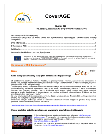 CoverAGE Numer 108 od połowy października do połowy listopada 2010 Co nowego w Unii Europejskiej ................................................................................................................... 1 Informacja specjalnia: Co można zrobić aby zagwarantować wystarczające i zrównoważone systemy emerytalne?........................................................................... ........................………............…….......4 Inne informacje .............................................................................................................................................. 6 Informacje o AGE........................................................................................................................................... 7 Publikacje ........................................................................................................................................................ 9 Wezwanie do składania propozycji projektów ......................................................................................... 10 Publikacja ta jest wspierana przez Program Działania Unii Europejskiej dotyczący zatrudnienia i solidarności społecznej PROGRESS (2007-2013). Informacje zawarte w tej publikacji nie zawsze są zgodne z opiniami lub stanowiskiem Komisji Europejskiej. Co nowego w Unii Europejskiej? Rada Rada Europejska tworzy stały plan zarządzania kryzysowego 28 października, szefowie Państw i Rządów, na prośbę Francji i Niemiec, zgodzili się na stworzenie, w strefie euro, stałego mechanizmu zarządzania kryzysowego. Mechanizm ten, to narzędzie międzyrządowe, przygotowane przez Radę i Komisję. “Proponujemy mocny i odpowiedzialny mechanizm stałego zarządzania kryzysowego, który ma na celu zabezpieczenie finansowej stabilności całej strefy euro”, skomentował prezydent Rady Europejskiej, Herman Van Rompuy, dodając: “jest to konieczne gdyż nawet, jeżeli zostaną zachowane wszelkie poprawne środki budżetowe i ekonomiczne, nie można wykluczyć niespodzianek. Polityka nie jest przedsięwzięciem o zerowym ryzyku” W celu zatwierdzenia tych mechanizmów trzeba będzie wprowadzić do Traktatu Lizbońskiego niewielkie zmiany, nie będą one wymagały referendum. Ostateczna decyzja dotycząca zmian w Traktacie Lizbońskim będzie podjęta w grudniu. Cały proces powinien zostać zakończony w lecie 2013 roku. http://www.euractiv.com/en/euro-finance/leaders-start-work-crisis-resolution-fund-news-499195 Usługi socjalne pożytku publicznego wymagają specjalnego traktowania *Informacja dostępna w języku angielskim pod adresem: http://www.ageplatform.eu/en W przypadku nie zrozumienia tekstu można skorzystać z tłumaczenia automatycznego Google pod adresem: http://translate.google.pl/# lub zwrócić się z prośbą o przetłumaczenie określonego fragment tekstu do Forum 50+: [email protected] 1 , Zatwierdzenie nowych Zasad Zatrudnienia *Informacja dostępna w języku angielskim pod adresem: http://www.age-platform.eu/en W przypadku nie zrozumienia tekstu można skorzystać z tłumaczenia automatycznego Google pod adresem: http://translate.google.pl/# lub zwrócić się z prośbą o przetłumaczenie określonego fragment tekstu do Forum 50+: [email protected] 4ty Szczyt Równości na temat Dyrektywy Zatrudnienia zorganizowany przez Prezydencję Belgijską *Informacja dostępna w języku angielskim pod adresem: http://www.age-platform.eu/en W przypadku nie zrozumienia tekstu można skorzystać z tłumaczenia automatycznego Google pod adresem: http://translate.google.pl/# lub zwrócić się z prośbą o przetłumaczenie określonego fragment tekstu do Forum 50+ : [email protected] Ministerialna Konferencja na temat chorób przewlekłych *Informacja dostępna w języku angielskim pod adresem: http://www.age-platform.eu/en W przypadku nie zrozumienia tekstu można skorzystać z tłumaczenia automatycznego Google pod adresem: http://translate.google.pl/# lub zwrócić się z prośbą o przetłumaczenie określonego fragment tekstu do Forum 50+: [email protected] Parlament Europejski Dyskusje w Komitecie EMPL na temat Europejskiego Roku 2012, roku aktywnego starzenia się *Informacja dostępna w języku angielskim pod adresem: http://www.age-platform.eu/en W przypadku nie zrozumienia tekstu można skorzystać z tłumaczenia automatycznego Google pod adresem: http://translate.google.pl/# lub zwrócić się z prośbą o przetłumaczenie określonego fragment tekstu do Forum 50+ : [email protected] AGE zadowolone z zaaprobowania raportu Thomas’a Mann’a ” Wyzwanie demograficzne i solidarność miedzy pokoleniami’ *Informacja dostępna w języku angielskim pod adresem: http://www.ageplatform.eu/en W przypadku nie zrozumienia tekstu można skorzystać z tłumaczenia automatycznego Google pod adresem: http://translate.google.pl/# lub zwrócić się z prośbą o przetłumaczenie określonego fragment tekstu do Forum 50+ : [email protected] Parlament w walce z ubóstwem mówi tak minimalnemu dochodowi *Informacja dostępna w języku angielskim pod adresem: http://www.age-platform.eu/en W przypadku nie zrozumienia tekstu można skorzystać z tłumaczenia automatycznego Google pod adresem: http://translate.google.pl/# lub zwrócić się z prośbą o przetłumaczenie określonego fragment tekstu do Forum 50+ : [email protected] 2 Przyjęcie raportu Françoise Grossetête dotyczącego ponad granicznej opieki zdrowotnej 27 października w Komitecie ENVI znaczną większością przegłosowano raport Pani Grossetête na temat dostępu i prawa do ponad granicznej opieki zdrowotnej. Zapewnione są prawa pacjentów do ponad granicznej opieki zdrowotnej oraz właściwa polityka na poziomie krajowym. Pacjenci mają prawo do zabiegów dokonywanych w szpitalach za granicami państwa i koszty zostaną im zwrócone tak jak gdyby otrzymali świadczenie w kraju, jednakże nie może to odbywać się ze szkodą dla zrównoważonych system