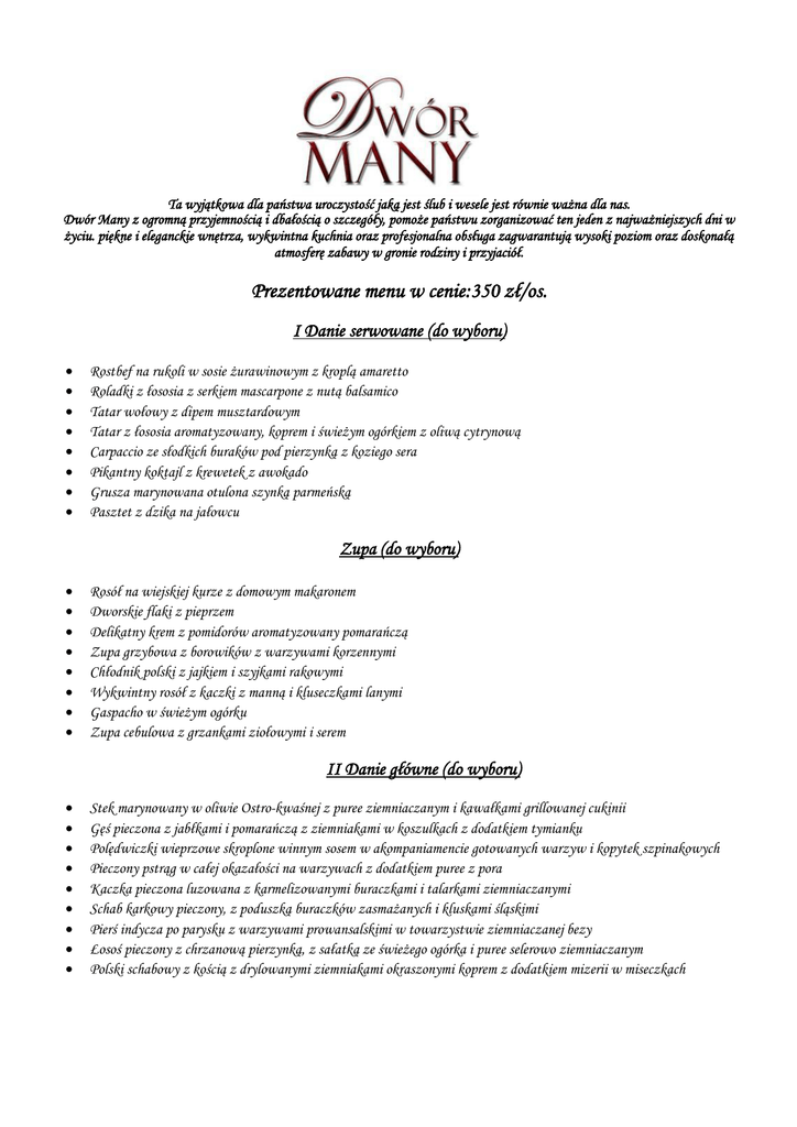 Ta wyjątkowa dla państwa uroczystość jaką jest ślub i wesele jest równie ważna dla nas. Dwór Many z ogromną przyjemnością i dbałością o szczegóły, pomoże państwu zorganizować ten jeden z najważniejszych dni w życiu. piękne i eleganckie wnętrza, wykwintna kuchnia oraz profesjonalna obsługa zagwarantują wysoki poziom oraz doskonałą atmosferę zabawy w gronie rodziny i przyjaciół. Prezentowane menu w cenie:350 zł/os. I Danie serwowane (do wyboru) Rostbef na rukoli w sosie żurawinowym z kroplą amaretto Roladki z łososia z serkiem mascarpone z nutą balsamico Tatar wołowy z dipem musztardowym Tatar z łososia aromatyzowany, koprem i świeżym ogórkiem z oliwą cytrynową Carpaccio ze słodkich buraków pod pierzynką z koziego sera Pikantny koktajl z krewetek z awokado Grusza marynowana otulona szynką parmeńską Pasztet z dzika na jałowcu Zupa (do wyboru) Rosół na wiejskiej kurze z domowym makaronem Dworskie flaki z pieprzem Delikatny krem z pomidorów aromatyzowany pomarańczą Zupa grzybowa z borowików z warzywami korzennymi Chłodnik polski z jajkiem i szyjkami rakowymi Wykwintny rosół z kaczki z manną i kluseczkami lanymi Gaspacho w świeżym ogórku Zupa cebulowa z grzankami ziołowymi i serem II Danie główne (do wyboru) Stek marynowany w oliwie Ostro-kwaśnej z puree ziemniaczanym i kawałkami grillowanej cukinii Gęś pieczona z jabłkami i pomarańczą z ziemniakami w koszulkach z dodatkiem tymianku Polędwiczki wieprzowe skroplone winnym sosem w akompaniamencie gotowanych warzyw i kopytek szpinakowych Pieczony pstrąg w całej okazałości na warzywach z dodatkiem puree z pora Kaczka pieczona luzowana z karmelizowanymi buraczkami i talarkami ziemniaczanymi Schab karkowy pieczony, z poduszką buraczków zasmażanych i kluskami śląskimi Pierś indycza po parysku z warzywami prowansalskimi w towarzystwie ziemniaczanej bezy Łosoś pieczony z chrzanową pierzynką, z sałatką ze świeżego ogórka i puree selerowo ziemniaczanym Polski schabowy z kością z drylowanymi ziemniakami okraszonymi koprem z dodatkiem mizerii w miseczkach Deser serwowany (do wyboru ) Beza z sosem z owoców leśnych Szarlotka z kruszonką w cukrze pudrze Brownie w trójkąt cięte Pianka czekoladowa z sosem pomarańczowym z chili Sałatka owocowa z ajerkoniakiem Kolorowe tartaletki z owocami Danie serwowane podczas wesela (do wyboru) Łosoś w chrupiącej skórce na kołderce warzyw w wybornym sosem miodowo cytrynowym Zapiekana cukinia z duetem warzywnym i serem feta Filet z soli w sosie cytrynowym na szpinaku z gorgonzolą ułożony Boeuf strogonoff Schab pieczony z szalotkami a do tego szpinakowe kopytka i marchewka z sezamem. Gulasz z dzika na winie z kaszą jaglaną i ogórkiem do smaku Gulasz z bażanta z surówkami z białej i czerwonej kapusty Pierogi z nadzieniem szpinakowym w sosie serowym z szyjkami rakowymi Kurze udko z pikantnym nadzieniem, ryż jaśminowy z zielonym groszkiem Roladki z kurczaka z delikatnym szpinakiem i mozzarellą z kolorowym ryżem i suszonym pomidorem Królewskie zrazy wołowe z sosem grzybowym, kluskami śląskimi i buraczkami Juki ułańskie nadziane pieczarkami w otoczeniu pieczonych ziemniaków z ziołami Żur staropolski z jajkiem i białą kiełbasą Węgierska zupa gulaszowa Barszcz czerwony pasztecikiem Pierogowe trio (z kapustą i grzybami, ruskie, z mięsem) Przystawki zimne serwowane w bufecie (7 do wyboru) Podwędzany filet z gęsi na sosie żurawinowo gruszkowym aromatyzowanym szkocką whisky Schab z dzika pieczony na zimno polany sosem śliwkowym Wątróbkowa pasta na chrupiących grzankach Śledzie korzenne z whisky Soczysty schab z pastą jajeczną otulony galaretą Pasztet domowy z żurawiną Galantyna z kaczki Terina warzywna z łososiem Pieczone mięsa z sosami Tymbaliki drobiowe Roladki z łososia na sałatce krabowej Ryba po grecku Deska ryb wędzonych Dorsz z marchwią w galarecie Lekkie roladki z twarożkiem szpinakowo łososiowym otulone naleśnikiem Rolada rybna Deska serów z owocami Jajka faszerowane pastą krewetkową i kaparami Jajka po Galicyjsku Wędliny wędzone domowe Roladka z indyka Sałatki serwowane w bufecie (3 do wyboru) Brokułowe różyczki z serem feta pod sosem czosnkowym Klasyczna sałatka jarzynowa Sałatka z kaczki i jabłek z rukolą w winegrecie Sałatka z podsmażaną mozzarellą w towarzystwie pomidorków koktajlowych i listów bazyli Sałatka z marynowaną gruszką i aromatycznym wędzonym pstrągiem Rukola z łososiem wędzonym i pomidorkami cherry w sosie balsamico z granatem Świeży szpinak z serkiem pleśniowym i prażonymi pestkami dyni Sałatka z kurczaka z warzywami Julien i dresingiem musztardowym Sałatka grecka z fetą i winogronami Warzywne makarony Ciasta w bufecie słodkim (5 do wyboru ) Puszysty sernik; Tarta z owocami sezonowymi; Ciasto marchewkowe; Ciasto domowe drożdżowe Szarlotka domowa; Torciki czekoladowe; Babeczki w trzech smakach: orzechowym, owocowym i czekoladowym. Brownie, Miodowiec Napoje bez limitu Kawa, herbata czarna , woda niegazowana, woda gazowana, Napoje 1l (Coca-cola, Fanta , Sprite) soki owocowe (dwa do wyboru), Woda nie. Gaz. Dodatki (uzupełniane bez limitu w cenie) Pieczywo Sosy, marynaty, owoce sezonowe nie filetowane. Prezentowane menu zawiera: APARTAMENT DLA PAŃSTWA MŁODYCH W PREZENCIE. Okrągłe stoły 180cm średnicy wraz z obrusami, krzesła bankietowe z białymi pokrowcami oraz białe serwetki w prezencie. Powitanie Pary Młodej chlebem i solą w prezencie. Toast powitalny dla gości winem musującym w prezencie. Gotowość agregatu zapewniająca moc na cały obiekt w momencie awarii lub wstrzymania energii elektrycznej przez dostawcę. Profesjonalny serwis kelnerski w cenie (1 kelner na 20 osób) Parking na terenie Dworu bezpłatny. Dzieci do lat 4 bezpłatnie. Dzieci od lat 5 do 12 lat Obsługa 50% ceny (dj, fotograf, operator kamery) Przyjęcia do 150 osób w sali balowej lub oranżerii, powyżej 150 osób w obu salach połączon
