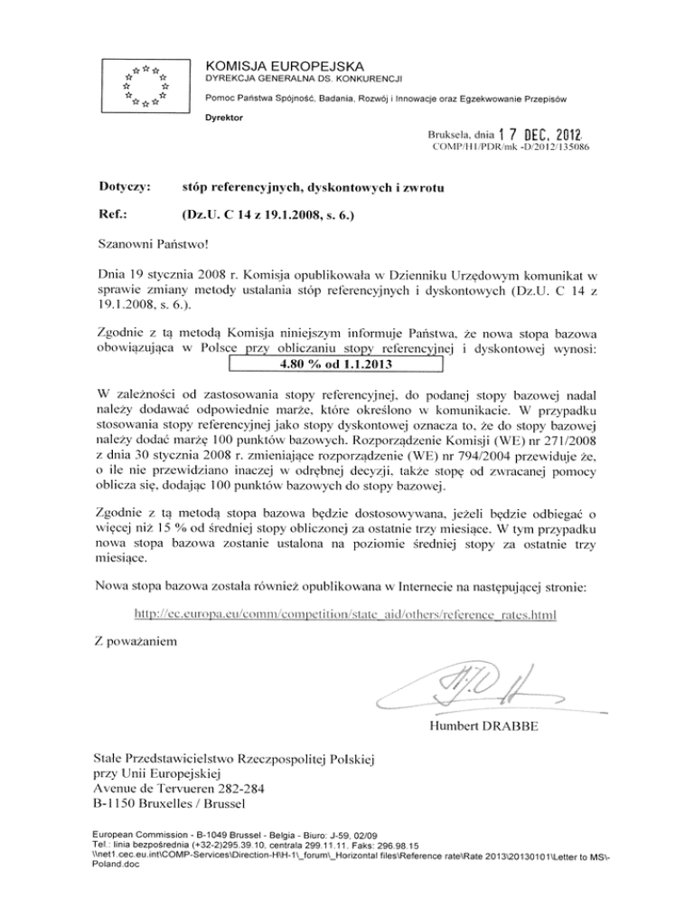 KOMISJA EUROPEJSKA * * * * DYREKCJA GENERALNA DS. KONKURENCJI Pomoc Pañstwa Spójnoá, Badania, Rozwój i Innowacje oraz Egzekwowanie Przepisów Dyrektor Bruksela, dnia 17 DEC. 2012. C()MP/ll I /PDR/mL -0/2012/135086 Dotvczv: stop referencyjnych, dvskontowvch i zwrotu Ref.: (Dz.U. C 14 z 19.1.2008, s. 6.) Szanowni Pañstwo! Dnia 19 stycznia 2008 r. Komisja opublikowala w Dzienniku Urzcdowyrn komunikat w sprawie zmiany metody ustalania stop referencvjnych i dyskontowych (Dz.U. C 14 z 19.1.2008. s. 6.’). Zgodnic z t rnetodq Komisja niniejszvm infbrmuje Pañstwa. ze nowa stopa bazowa obowkzujaca w Poisce przy obliczaniu stopv referencjnej i dyskontowej wnosi: 4.80% od 1.1.2013 I W za1eznoci od zastosowania stopy referencyjnej, do podanej stopy bazowej nadal nalezy dodawaé odpowiednie mare, które okre1ono w kornunikacie. W przypadku stosowania stopy referencyjnej jako stopy dyskontowej oznacza to, ze do stopy bazowej na1ey dodaé rnarç 100 punktOw bazowvch. Rozporzadzenie Komisji (WE) nr 271/2008 z dnia 30 stycznia 2008 r. zmieniajce rozporzdzenie (WE) nr 794/2004 przewiduje e. o ile nic przewidziano inaczej w odrçbnej decvzji. take stopç od zwracanej pomocy oblicza sic. dodajqc 100 punktOw bazowvch do stopv bazo\vej. Zgodnie z tr metod stopa bazowa bçdzie dostosowywana, jee1i bçdzie odbiegaé o wiçcej niz 15 % od redniej stopy obliczonej za ostatnie trzy miesiqce. W tym przypadku iiowa stopa bazowa zostanie ustalona na poziomie redniej stopy za ostatnie trzy miesice. Nov-a stopa bazowa zostala równie opublikowana w Internecie na nastçpujcej stronie: fjj/ec.em pa...’u comm comp’tmon state aid’ohcrs. reierencemtcs.html Z powazaniem Humbert DRABBE Stale Przedstawicielstwo Rzeczpospolitej Po1skie przy Unii Europejskiej Avenue de Tervueren 282-284 B- 1150 Bruxelles / Brussel European Commission B-1049 Brussel Belgia Biuro: J-59, 02/09 Tel.: linia bezporednia (÷32-2)295.39.10. centrala 299.11.11. Faks: 296.98.15 \\netl .cec.eu int\COMP-Services\Direction-H\H-1 \jorum\_Horizontal files\Reference rate\Rate 201320130101 \Letter to MS\ Poland.doc - - - -