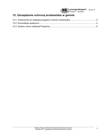 EE energoekspert sp. z o. o. energia i ekologia 12. Zarządzanie ochroną środowiska w gminie 12.1. Instrumenty do realizacji programu ochrony środowiska............................................. 2 12.2. Konsultacje społeczne................................................................................................. 4 12.3. System oceny realizacji Programu.............................................................................. 5 Gminny Program Ochrony Środowiska dla Gminy Koronowo Rozdział 12 – Zarządzanie ochroną środowiska w gminie 1 EE energoekspert sp. z o. o. energia i ekologia 12.1. Instrumenty do realizacji programu ochrony środowiska Instrumenty realizacji programu: ¨ prawno-administracyjne, ¨ ekonomiczne i rynkowe, ¨ finansowe, ¨ informacyjno-edukacyjne, Instrumenty prawno-administracyjne są narzędziami regulacji bezpośredniej, które poprzez akty prawne wprowadzają: ü normy o charakterze ogólnym; zalicza się do nich przepisy dotyczące użytkowania i ochrony środowiska, w tym odnoszące się do: ü systemu zarządzania środowiskiem, ü systemu monitoringu ekologicznego, ü sprawozdawczości z zakresu ochrony środowiska; ü normy szczegółowe dotyczące ochrony poszczególnych komponentów środowiska: kopalin, powierzchni ziemi, powietrza atmosferycznego, wód, lasów, roślin i zwierząt, krajobrazu i przestrzeni; ü normy jakości środowiska (normy imisji), charakteryzujące pożądany stan środowiska, ü normy emisji, określające maksymalne dozwolone do wprowadzenia do środowiska ilości zanieczyszczeń, ü normy techniczno-technologiczne, określające parametry procesu produkcji w celu zmniejszenia jego uciążliwości dla środowiska, ü normy produktowe, określające parametry produktów zanieczyszczających środowisko. Instrumenty ekonomiczne to: opłaty: ü za gospodarcze korzystanie ze środowiska i wprowadzanie w nim zmian (za zanieczyszczanie powietrza atmosferycznego, za składowanie odpadów, za usuwanie drzew i krzewów), ü za szczególne korzystanie z wód i urządzeń wodnych ( za pobór wód powierzchniowych i podziemnych, za odprowadzanie ścieków do wód powierzchniowych i do gleby, za korzystanie z wód i urządzeń wodnych do celów żeglugi i spławu), ü eksploatacyjne za wydobywanie kopalin (od podmiotu gospodarczego wydobywającego kopalinę), ü z tytułu przeznaczenia gruntów na cele nierolnicze i nieleśne (od jednostek organizacyjnych lub osób fizycznych, które uzyskały zezwolenie na wyłączenie gruntów z produkcji), ü za świadczone usługi komunalne (dostawę wody, odprowadzanie ścieków, wywóz odpadów), ü miejscowe (klimatyczne); subwencje: ➢ dotacje ( w tym z funduszy ekologicznych, budżetu państwa, budżetów gmin itp.), ➢ dotacje „ukryte": pożyczki i kredyty preferencyjne (funduszy ekologicznych i banków), ➢ ulgi podatkowe (np. zmniejszenie podatku dochodowego o kwoty darowizn na cele ochrony środowiska, zwolnienia od podatku VAT gospodarki ściekami, wywozu i zagospodarowania śmieci itp), Gminny Program Ochrony Środowiska dla Gminy Koronowo Rozdział 12 – Zarządzanie ochroną środowiska w gminie 2 EE ➢ energoekspert sp. z o. o. energia i ekologia subwencje właściwe, tzn. stałe - w określonym czasie wspomaganie finansowe określonej działalności na rzecz ekorozwoju (np. subwencjonowanie czasopism o profilu ekologicznym); bodźce finansowe dla egzekucji prawa, czyli tzw. kary ekologiczne za: ➢ przekroczenie warunków odprowadzania ścieków, ➢ pobór wody w ilości większej niż ustalona w pozwoleniu wodnoprawnym, ➢ naruszenie wymogów środowiska w zakresie ochrony powietrza, ➢ składowanie odpadów w niewyznaczonych na ten cel miejscach lub niezgodnie z wymogami określonymi w decyzji właściwego organu,, ➢ naruszenie wymogów środowiska w zakresie ochrony przed hałasem, ➢ usuwanie drzew i krzewów. Instrumenty finansowe Wybór i stosowanie określonej formy finansowania programu ochrony środowiska, zależy w praktyce od trzech najważniejszych czynników: ➢ rodzaju przedsięwzięcia (działalność inwestycyjna, edukacja itp.), ➢ statusu wnioskodawcy w przypadku pozyskiwania środków ze źródeł zewnętrznych (samorząd, przedsiębiorstwo, organizacje pozarządowe, osoby fizyczne itp.) ➢ rodzaju instytucji finansującej (bank, budżet, fundacje itp.). System finansowania przewiduje wykorzystanie następujących podstawowych form: ➢ pożyczek i kredytów, ➢ dotacji (tzw. grantów) i subwencji właściwych, ➢ środki własne, ➢ obligacje, w tym obligacje komunalne, ➢ leasing finansowy i operacyjny, ➢ zapisy i darowizny. Źródła finansowania: ➢ fundusze ekologiczne, ➢ podmioty gospodarcze, ➢ budżet gminy, ➢ własne ludności i środki społeczne, ➢ budżet państwa, ➢ sektor bankowy ➢ pomoc zagraniczna (środki funduszów pomocowych). Posiadanie odpowiednich środków na realizację programu jest niezbędnym warunkiem wdrożenia polityki środowiskowej gminy. Wiele działań będzie realizowanych poprzez znaczne środki pochodzące z Gminnego Funduszu Ochrony Środowiska i Gospodarki Wodnej, do której wpływa: ✔ 50 % opłat i kar za składowanie odpadów, ✔ 100 % opłat i kar za usuwanie drzew i krzewów, ✔ 20 % opłat i kar za pozostałe rodzaje gospodarczego korzystania ze środowiska; Gminny Program Ochrony Środowiska dla Gminy Koronowo Rozdział 12 – Zarządzanie ochroną środowiska w gminie 3 EE energoekspert sp. z o. o. energia i ekologia Instrumenty informacyjno-edukacyjne Mają kluczowe znaczenie w kształtowaniu się świadomości prośrodowiskowej. Ważne jest tu rzetelne i przystępne przekazywanie wiedzy o stanie środowiska. Posiadanie takiej wiedzy wśród społeczeństwa zaczyna mieć coraz większe znaczenie. 12.2. Konsultacje społeczne Doświadczenia międzynarodowe wskazują, że przeprowadzenie konsultacji wstępnych zwiększa szanse wypracowania decyzji akceptowalnych i prz