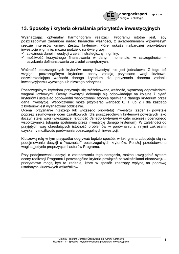 EE energoekspert sp. z o. o. energia i ekologia 13. Sposoby i kryteria określania priorytetów inwestycyjnych Wyznaczając optymalny harmonogram realizacji Programu istotne jest, aby poszczególnym zadaniom nadać hierarchię ważności, z uwzględnieniem w pierwszym rzędzie interesów gminy. Zestaw kryteriów, które wskażą najbardziej priorytetowe inwestycje w gminie, można podzielić na dwie grupy: ü zbieżność danej inwestycji z celami strategicznymi gminy; ü możliwość korzystnego finansowania w danym momencie, w szczególności – uzyskania dofinansowania ze źródeł zewnętrznych. Ważność poszczególnych kryteriów oceny inwestycji nie jest jednakowa. Z tego też względu poszczególnym kryteriom oceny zostają przypisane wagi liczbowe, odzwierciedlające ważność danego kryterium dla przyznania danemu zadaniu inwestycyjnemu wyższego lub niższego priorytetu. Poszczególnym kryteriom przyznaje się zróżnicowaną ważność, wyrażoną odpowiednimi wagami liczbowymi. Oceny inwestycji dokonuje się odpowiadając na kolejne 7 pytań kryteriów i ustalając odpowiedni współczynnik stopnia spełnienia danego kryterium przez daną inwestycję. Współczynnik może przybierać wartości: 0, 1 lub 2 i dla każdego z kryteriów jest wyznaczony oddzielnie. Ocena (przyznanie niższego lub wyższego priorytetu) inwestycji (zadania) powstaje poprzez zsumowanie ocen cząstkowych (dla poszczególnych kryteriów) powstałych jako iloczyn stałej wagi (wyrażającej istotność danego kryterium w całej ocenie) i ocenionego współczynnika (stopnia spełnienia przez inwestycję danego kryterium). W zależności od przyjętych wag określających istotność problemów w porównaniu z innymi zakresami uzyskamy możliwość porównania poszczególnych inwestycji. Kluczową rolę w tym przypadku odgrywać będzie sposób, w jaki gmina zdecyduje się na podejmowanie decyzji o "ważności" poszczególnych kryteriów. Poniżej przedstawione wagi są jedynie propozycjami autorów Programu. Przy podejmowaniu decyzji o zastosowaniu tego narzędzia, można uwzględnić system oceny realizacji Programu i poszczególne kryteria powiązać ze wskaźnikami ekorozwoju – priorytetowe mogą być te zadania, które w sposób znaczący wpłyną na poprawę ustalonych kluczowych wskaźników. Gminny Program Ochrony Środowiska dla Gminy Koronowo Rozdział 13 – Sposoby i kryteria określania priorytetów inwestycyjnych 1 EE energoekspert sp. z o. o. energia i ekologia Tabela 13-1. Wagi przeliczeniowe i opis znaczenia poszczególnych wartości współczynnika oceny dla kolejnych kryteriów oceny inwestycji Znaczenie poszczególnych wartości współczynnika Kryterium Waga 0 1 2 Zgodność z celami strategii 1. Czy inwestycja jest związana z roz3 nie pośrednio bezpośrednio wojem gospodarczym gminy? 2. Czy inwestycja jest związana z roz3 nie pośrednio bezpośrednio wojem turystyki lub rekreacji? 3. Czy inwestycja podniesie walory miejsca zamieszkania poprzez rozbudowę 2 nie pośrednio bezpośrednio infrastruktury technicznej 4. Czy inwestycja dotyczy poprawy sta4 nie pośrednio bezpośrednio nu środowiska? 5. Czy inwestycja wpłynie korzystnie na 2 nie pośrednio bezpośrednio wizerunek i promocję gminy? Kryteria finansowe 6. Czy inwestycja może być dofinan3 nie do 25% powyżej 25% sowywana ze środków pomocowych? 7. Czy inwestycja po zakończeniu będzie będzie generować dochody pokryją będzie generować dochody dla 2 generować więcej dochodu niż koszty gminy? koszty kosztów Łącznie wartość uzyskanej oceny mieści się w granicach od 0 do 38. W załączniku do niniejszego rozdziału znajduje się proponowany rejestr celów i zadań środowiskowych dla wszystkich elementów środowiska określonych w poszczególnych rozdziałach Programu wraz z oceną zadania wyznaczoną według opisanego powyżej sposobu. Gminny Program Ochrony Środowiska dla Gminy Koronowo Rozdział 13 – Sposoby i kryteria określania priorytetów inwestycyjnych 2 EE energoekspert sp. z o. o. energia i ekologia ZAŁĄCZNIK REJEST CELÓW I ZADAŃ ŚRODOWISKOWYCH Gminny Program Ochrony Środowiska dla Gminy Koronowo Rozdział 13 – Sposoby i kryteria określania priorytetów inwestycyjnych 3