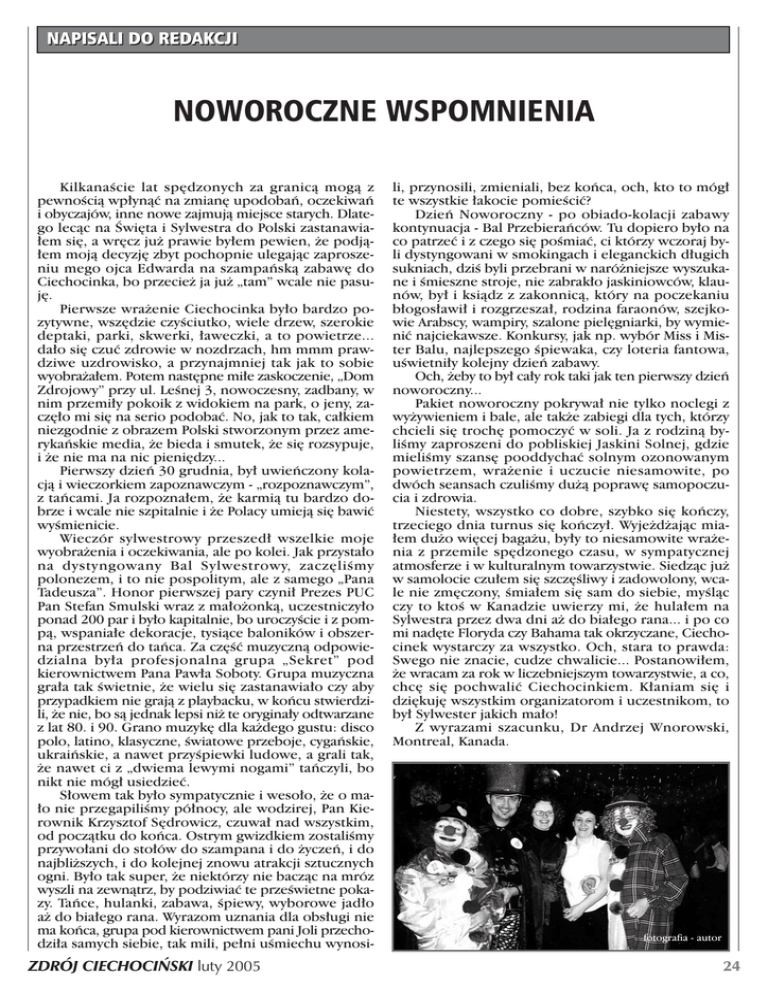 NAPISALI DO REDAKCJI NOWOROCZNE WSPOMNIENIA KilkanaÊcie lat sp´dzonych za granicà mogà z pewnoÊcià wp∏ynàç na zmian´ upodobaƒ, oczekiwaƒ i obyczajów, inne nowe zajmujà miejsce starych. Dlatego lecàc na Âwi´ta i Sylwestra do Polski zastanawia∏em si´, a wr´cz ju˝ prawie by∏em pewien, ˝e podjà∏em mojà decyzj´ zbyt pochopnie ulegajàc zaproszeniu mego ojca Edwarda na szampaƒskà zabaw´ do Ciechocinka, bo przecie˝ ja ju˝ „tam” wcale nie pasuj´. Pierwsze wra˝enie Ciechocinka by∏o bardzo pozytywne, wsz´dzie czyÊciutko, wiele drzew, szerokie deptaki, parki, skwerki, ∏aweczki, a to powietrze... da∏o si´ czuç zdrowie w nozdrzach, hm mmm prawdziwe uzdrowisko, a przynajmniej tak jak to sobie wyobra˝a∏em. Potem nast´pne mi∏e zaskoczenie, „Dom Zdrojowy” przy ul. LeÊnej 3, nowoczesny, zadbany, w nim przemi∏y pokoik z widokiem na park, o jeny, zacz´∏o mi si´ na serio podobaç. No, jak to tak, ca∏kiem niezgodnie z obrazem Polski stworzonym przez amerykaƒskie media, ˝e bieda i smutek, ˝e si´ rozsypuje, i ˝e nie ma na nic pieni´dzy... Pierwszy dzieƒ 30 grudnia, by∏ uwieƒczony kolacjà i wieczorkiem zapoznawczym - „rozpoznawczym”, z taƒcami. Ja rozpozna∏em, ˝e karmià tu bardzo dobrze i wcale nie szpitalnie i ˝e Polacy umiejà si´ bawiç wyÊmienicie. Wieczór sylwestrowy przeszed∏ wszelkie moje wyobra˝enia i oczekiwania, ale po kolei. Jak przysta∏o na dystyngowany Bal Sylwestrowy, zacz´liÊmy polonezem, i to nie pospolitym, ale z samego „Pana Tadeusza”. Honor pierwszej pary czyni∏ Prezes PUC Pan Stefan Smulski wraz z ma∏o˝onkà, uczestniczy∏o ponad 200 par i by∏o kapitalnie, bo uroczyÊcie i z pompà, wspania∏e dekoracje, tysiàce baloników i obszerna przestrzeƒ do taƒca. Za cz´Êç muzycznà odpowiedzialna by∏a profesjonalna grupa „Sekret” pod kierownictwem Pana Paw∏a Soboty. Grupa muzyczna gra∏a tak Êwietnie, ˝e wielu si´ zastanawia∏o czy aby przypadkiem nie grajà z playbacku, w koƒcu stwierdzili, ˝e nie, bo sà jednak lepsi ni˝ te orygina∏y odtwarzane z lat 80. i 90. Grano muzyk´ dla ka˝dego gustu: disco polo, latino, klasyczne, Êwiatowe przeboje, cygaƒskie, ukraiƒskie, a nawet przyÊpiewki ludowe, a grali tak, ˝e nawet ci z „dwiema lewymi nogami” taƒczyli, bo nikt nie móg∏ usiedzieç. S∏owem tak by∏o sympatycznie i weso∏o, ˝e o ma∏o nie przegapiliÊmy pó∏nocy, ale wodzirej, Pan Kierownik Krzysztof S´drowicz, czuwa∏ nad wszystkim, od poczàtku do koƒca. Ostrym gwizdkiem zostaliÊmy przywo∏ani do sto∏ów do szampana i do ˝yczeƒ, i do najbli˝szych, i do kolejnej znowu atrakcji sztucznych ogni. By∏o tak super, ˝e niektórzy nie baczàc na mróz wyszli na zewnàtrz, by podziwiaç te przeÊwietne pokazy. Taƒce, hulanki, zabawa, Êpiewy, wyborowe jad∏o a˝ do bia∏ego rana. Wyrazom uznania dla obs∏ugi nie ma koƒca, grupa pod kierownictwem pani Joli przechodzi∏a samych siebie, tak mili, pe∏ni uÊmiechu wynosi- ZDRÓJ CIECHOCI¡SKI luty 2005 li, przynosili, zmieniali, bez koƒca, och, kto to móg∏ te wszystkie ∏akocie pomieÊciç? Dzieƒ Noworoczny - po obiado-kolacji zabawy kontynuacja - Bal Przebieraƒców. Tu dopiero by∏o na co patrzeç i z czego si´ poÊmiaç, ci którzy wczoraj byli dystyngowani w smokingach i eleganckich d∏ugich sukniach, dziÊ byli przebrani w naró˝niejsze wyszukane i Êmieszne stroje, nie zabrak∏o jaskiniowców, klaunów, by∏ i ksiàdz z zakonnicà, który na poczekaniu b∏ogos∏awi∏ i rozgrzesza∏, rodzina faraonów, szejkowie Arabscy, wampiry, szalone piel´gniarki, by wymieniç najciekawsze. Konkursy, jak np. wybór Miss i Mister Balu, najlepszego Êpiewaka, czy loteria fantowa, uÊwietni∏y kolejny dzieƒ zabawy. Och, ˝eby to by∏ ca∏y rok taki jak ten pierwszy dzieƒ noworoczny... Pakiet noworoczny pokrywa∏ nie tylko noclegi z wy˝ywieniem i bale, ale tak˝e zabiegi dla tych, którzy chcieli si´ troch´ pomoczyç w soli. Ja z rodzinà byliÊmy zaproszeni do pobliskiej Jaskini Solnej, gdzie mieliÊmy szans´ pooddychaç solnym ozonowanym powietrzem, wra˝enie i uczucie niesamowite, po dwóch seansach czuliÊmy du˝à popraw´ samopoczucia i zdrowia. Niestety, wszystko co dobre, szybko si´ koƒczy, trzeciego dnia turnus si´ koƒczy∏. Wyje˝d˝ajàc mia∏em du˝o wi´cej baga˝u, by∏y to niesamowite wra˝enia z przemile sp´dzonego czasu, w sympatycznej atmosferze i w kulturalnym towarzystwie. Siedzàc ju˝ w samolocie czu∏em si´ szcz´Êliwy i zadowolony, wcale nie zm´czony, Êmia∏em si´ sam do siebie, myÊlàc czy to ktoÊ w Kanadzie uwierzy mi, ˝e hula∏em na Sylwestra przez dwa dni a˝ do bia∏ego rana... i po co mi nad´te Floryda czy Bahama tak okrzyczane, Ciechocinek wystarczy za wszystko. Och, stara to prawda: Swego nie znacie, cudze chwalicie... Postanowi∏em, ˝e wracam za rok w liczebniejszym towarzystwie, a co, chc´ si´ pochwaliç Ciechocinkiem. K∏aniam si´ i dzi´kuj´ wszystkim organizatorom i uczestnikom, to by∏ Sylwester jakich ma∏o! Z wyrazami szacunku, Dr Andrzej Wnorowski, Montreal, Kanada. fotografia - autor 24
