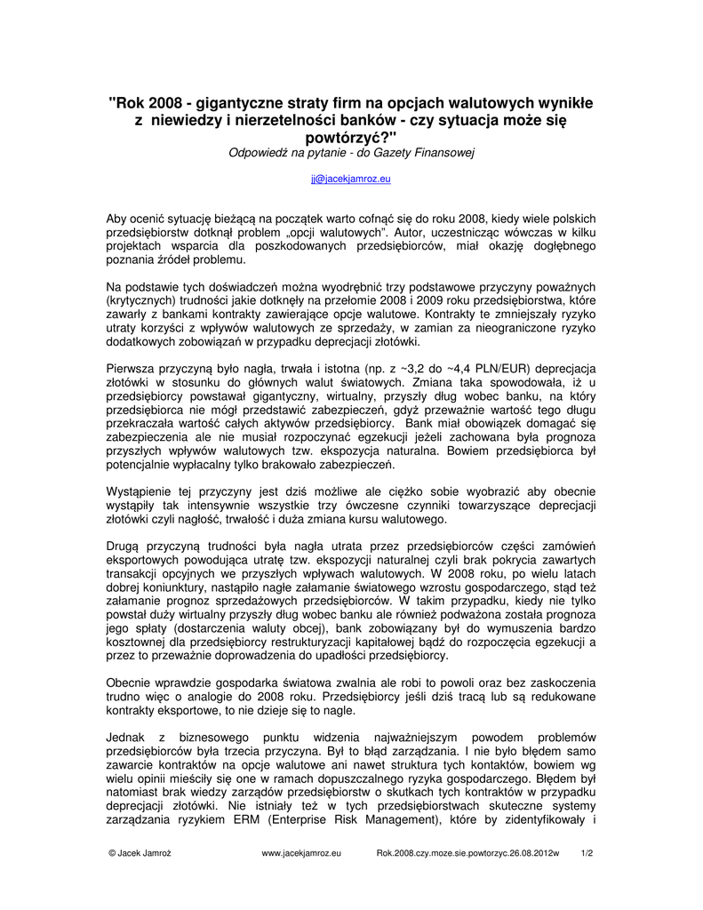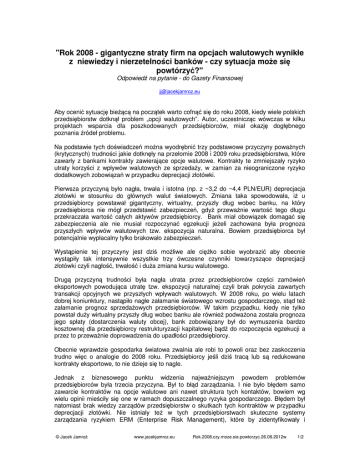 "Rok 2008 - gigantyczne straty firm na opcjach walutowych wynikłe z niewiedzy i nierzetelności banków - czy sytuacja może się powtórzyć?" Odpowiedź na pytanie - do Gazety Finansowej [email protected] Aby ocenić sytuację bieżącą na początek warto cofnąć się do roku 2008, kiedy wiele polskich przedsiębiorstw dotknął problem „opcji walutowych”. Autor, uczestnicząc wówczas w kilku projektach wsparcia dla poszkodowanych przedsiębiorców, miał okazję dogłębnego poznania źródeł problemu. Na podstawie tych doświadczeń można wyodrębnić trzy podstawowe przyczyny poważnych (krytycznych) trudności jakie dotknęły na przełomie 2008 i 2009 roku przedsiębiorstwa, które zawarły z bankami kontrakty zawierające opcje walutowe. Kontrakty te zmniejszały ryzyko utraty korzyści z wpływów walutowych ze sprzedaży, w zamian za nieograniczone ryzyko dodatkowych zobowiązań w przypadku deprecjacji złotówki. Pierwsza przyczyną było nagła, trwała i istotna (np. z ~3,2 do ~4,4 PLN/EUR) deprecjacja złotówki w stosunku do głównych walut światowych. Zmiana taka spowodowała, iż u przedsiębiorcy powstawał gigantyczny, wirtualny, przyszły dług wobec banku, na który przedsiębiorca nie mógł przedstawić zabezpieczeń, gdyż przeważnie wartość tego długu przekraczała wartość całych aktywów przedsiębiorcy. Bank miał obowiązek domagać się zabezpieczenia ale nie musiał rozpoczynać egzekucji jeżeli zachowana była prognoza przyszłych wpływów walutowych tzw. ekspozycja naturalna. Bowiem przedsiębiorca był potencjalnie wypłacalny tylko brakowało zabezpieczeń. Wystąpienie tej przyczyny jest dziś możliwe ale ciężko sobie wyobrazić aby obecnie wystąpiły tak intensywnie wszystkie trzy ówczesne czynniki towarzyszące deprecjacji złotówki czyli nagłość, trwałość i duża zmiana kursu walutowego. Drugą przyczyną trudności była nagła utrata przez przedsiębiorców części zamówień eksportowych powodująca utratę tzw. ekspozycji naturalnej czyli brak pokrycia zawartych transakcji opcyjnych we przyszłych wpływach walutowych. W 2008 roku, po wielu latach dobrej koniunktury, nastąpiło nagłe załamanie światowego wzrostu gospodarczego, stąd też załamanie prognoz sprzedażowych przedsiębiorców. W takim przypadku, kiedy nie tylko powstał duży wirtualny przyszły dług wobec banku ale również podważona została prognoza jego spłaty (dostarczenia waluty obcej), bank zobowiązany był do wymuszenia bardzo kosztownej dla przedsiębiorcy restrukturyzacji kapitałowej bądź do rozpoczęcia egzekucji a przez to przeważnie doprowadzenia do upadłości przedsiębiorcy. Obecnie wprawdzie gospodarka światowa zwalnia ale robi to powoli oraz bez zaskoczenia trudno więc o analogie do 2008 roku. Przedsiębiorcy jeśli dziś tracą lub są redukowane kontrakty eksportowe, to nie dzieje się to nagle. Jednak z biznesowego punktu widzenia najważniejszym powodem problemów przedsiębiorców była trzecia przyczyna. Był to błąd zarządzania. I nie było błędem samo zawarcie kontraktów na opcje walutowe ani nawet struktura tych kontaktów, bowiem wg wielu opinii mieściły się one w ramach dopuszczalnego ryzyka gospodarczego. Błędem był natomiast brak wiedzy zarządów przedsiębiorstw o skutkach tych kontraktów w przypadku deprecjacji złotówki. Nie istniały też w tych przedsiębiorstwach skuteczne systemy zarządzania ryzykiem ERM (Enterprise Risk Management), które by zidentyfikowały i © Jacek Jamroż www.jacekjamroz.eu Rok.2008.czy.moze.sie.powtorzyc.26.08.2012w 1/2 oszacowały ten błąd oraz wskazały działania naprawcze. A można było podjąć przynajmniej jedno działanie mitygujące (tutaj: redukcja skutku) w sytuacji kiedy kontrakt na opcje walutowe jest już zawarty. Było to przygotowanie procedury wypowiedzenia kontraktu, kiedy deprecjacja waluty przekroczy określony poziom (np. 3,6 PLN/EUR). Jest to tzw. operacja stop loss i jeśli nawet nie ma w przedsiębiorstwie wdrożonego kompleksowego systemu ERM to decyzja o takim działaniu może wynikać z systemu zachowania ciągłości działania BCM (Business Continuity Management). Wypowiedzenie kontraktu oznaczałoby duże straty dla przedsiębiorstwa ale jeśli zrobione byłoby w dobrym momencie to straty byłyby i tak istotnie niższe od kosztów wymuszonej przez banki restrukturyzacji kapitałowej czy upadłości. Obecnie wydaje się, że doświadczenia roku 2008 są nadal w pamięci zarządów przedsiębiorstw. Podsumowując, powtórzenie się dziś tak dużych strat przedsiębiorstw, w zakresie podobnych jak 2008 roku kontaktów na opcje walutowe, wydaje się mało prawdopodobne, gdyż nie da się wykazać istotnego prawdopodobieństwa mocnego i kompletnego wystąpienia żadnej z trzech w/w przyczyn problemu. Zgodnie z jedną z dobrych praktyk ERM, warto zapobiegać aby ryzyka ponownie się nie materializowały ale przede wszystkim należy dbać aby nie zaskoczyły przedsiębiorców nowe ryzyka, których nikt się nie spodziewa. Stąd warto dziś rozważyć aby szukać innych krytycznych zagrożeń, uwarunkowanych odmienną przecież bieżącą sytuacją. Nawiązując jeszcze do ryzyk walutowych przedsiębiorców, tam gdzie to możliwe rekomenduje się samodzielne zabezpieczenia naturalne (hedging naturalny). Nie jest to sposób kompletny ale prosty i przeważnie wystraczający. Np. jeśli przedsiębiorca ma duże wpływy w danej walucie (sprzedaż), to stara się przenosić to ryzyko na stronę kosztową poprzez denominowanie cen zakupów w tej samej walucie. Jacek Jamroż Ekspert z zakresu finansów przedsiębiorstw Certyfikowany Menedżer Ryzyka POLRISK © Jacek Jamroż www.jacekjamroz.eu Rok.2008.czy.moze.sie.powtorzyc.26.08.2012w 2/2