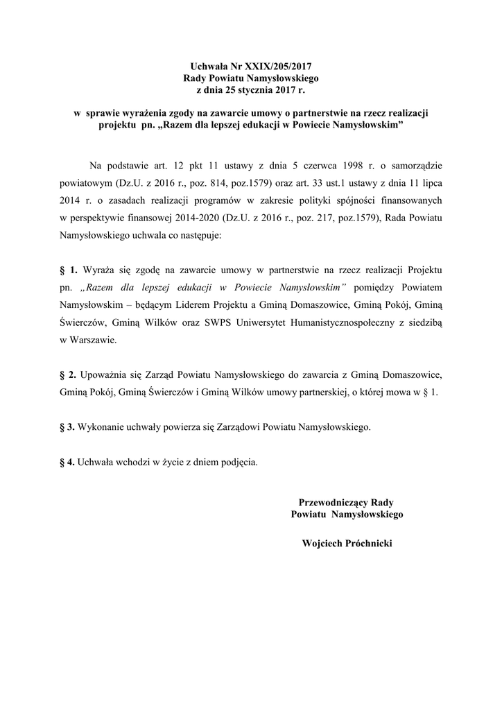 Uchwała Nr XXIX/205/2017 Rady Powiatu Namysłowskiego z dnia 25 stycznia 2017 r. w sprawie wyrażenia zgody na zawarcie umowy o partnerstwie na rzecz realizacji projektu pn. „Razem dla lepszej edukacji w Powiecie Namysłowskim” Na podstawie art. 12 pkt 11 ustawy z dnia 5 czerwca 1998 r. o samorządzie powiatowym (Dz.U. z 2016 r., poz. 814, poz.1579) oraz art. 33 ust.1 ustawy z dnia 11 lipca 2014 r. o zasadach realizacji programów w zakresie polityki spójności finansowanych w perspektywie finansowej 2014-2020 (Dz.U. z 2016 r., poz. 217, poz.1579), Rada Powiatu Namysłowskiego uchwala co następuje: § 1. Wyraża się zgodę na zawarcie umowy w partnerstwie na rzecz realizacji Projektu pn. „Razem dla lepszej edukacji w Powiecie Namysłowskim” pomiędzy Powiatem Namysłowskim – będącym Liderem Projektu a Gminą Domaszowice, Gminą Pokój, Gminą Świerczów, Gminą Wilków oraz SWPS Uniwersytet Humanistycznospołeczny z siedzibą w Warszawie. § 2. Upoważnia się Zarząd Powiatu Namysłowskiego do zawarcia z Gminą Domaszowice, Gminą Pokój, Gminą Świerczów i Gminą Wilków umowy partnerskiej, o której mowa w § 1. § 3. Wykonanie uchwały powierza się Zarządowi Powiatu Namysłowskiego. § 4. Uchwała wchodzi w życie z dniem podjęcia. Przewodniczący Rady Powiatu Namysłowskiego Wojciech Próchnicki