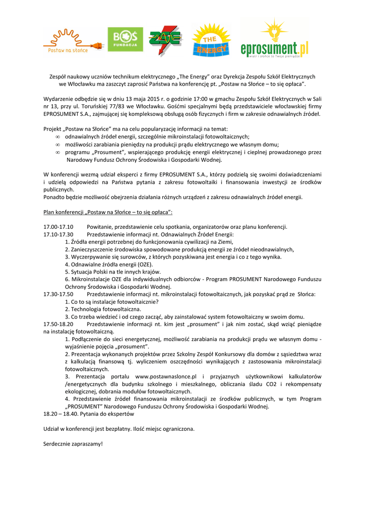 Zespół naukowy uczniów technikum elektrycznego „The Energy” oraz Dyrekcja Zespołu Szkół Elektrycznych we Włocławku ma zaszczyt zaprosić Państwa na konferencję pt. „Postaw na Słońce – to się opłaca”. Wydarzenie odbędzie się w dniu 13 maja 2015 r. o godzinie 17:00 w gmachu Zespołu Szkół Elektrycznych w Sali nr 13, przy ul. Toruńskiej 77/83 we Włocławku. Gośćmi specjalnymi będą przedstawiciele włocławskiej firmy EPROSUMENT S.A., zajmującej się kompleksową obsługą osób fizycznych i firm w zakresie odnawialnych źródeł. Projekt „Postaw na Słońce” ma na celu popularyzację informacji na temat: • odnawialnych źródeł energii, szczególnie mikroinstalacji fotowoltaicznych; • możliwości zarabiania pieniędzy na produkcji prądu elektrycznego we własnym domu; • programu „Prosument”, wspierającego produkcję energii elektrycznej i cieplnej prowadzonego przez Narodowy Fundusz Ochrony Środowiska i Gospodarki Wodnej. W konferencji wezmą udział eksperci z firmy EPROSUMENT S.A., którzy podzielą się swoimi doświadczeniami i udzielą odpowiedzi na Państwa pytania z zakresu fotowoltaiki i finansowania inwestycji ze środków publicznych. Ponadto będzie możliwość obejrzenia działania różnych urządzeń z zakresu odnawialnych źródeł energii. Plan konferencji „Postaw na Słońce – to się opłaca”: 17.00-17.10 Powitanie, przedstawienie celu spotkania, organizatorów oraz planu konferencji. 17.10-17.30 Przedstawienie informacji nt. Odnawialnych Źródeł Energii: 1. Źródła energii potrzebnej do funkcjonowania cywilizacji na Ziemi, 2. Zanieczyszczenie środowiska spowodowane produkcją energii ze źródeł nieodnawialnych, 3. Wyczerpywanie się surowców, z których pozyskiwana jest energia i co z tego wynika. 4. Odnawialne źródła energii (OZE). 5. Sytuacja Polski na tle innych krajów. 6. Mikroinstalacje OZE dla indywidualnych odbiorców - Program PROSUMENT Narodowego Funduszu Ochrony Środowiska i Gospodarki Wodnej. 17.30-17.50 Przedstawienie informacji nt. mikroinstalacji fotowoltaicznych, jak pozyskać prąd ze Słońca: 1. Co to są instalacje fotowoltaicznie? 2. Technologia fotowoltaiczna. 3. Co trzeba wiedzieć i od czego zacząć, aby zainstalować system fotowoltaiczny w swoim domu. 17.50-18.20 Przedstawienie informacji nt. kim jest „prosument” i jak nim zostać, skąd wziąć pieniądze na instalację fotowoltaiczną. 1. Podłączenie do sieci energetycznej, możliwość zarabiania na produkcji prądu we własnym domu wyjaśnienie pojęcia „prosument”. 2. Prezentacja wykonanych projektów przez Szkolny Zespół Konkursowy dla domów z sąsiedztwa wraz z kalkulacją finansową tj. wyliczeniem oszczędności wynikających z zastosowania mikroinstalacji fotowoltaicznych. 3. Prezentacja portalu www.postawnaslonce.pl i przyjaznych użytkownikowi kalkulatorów /energetycznych dla budynku szkolnego i mieszkalnego, obliczania śladu CO2 i rekompensaty ekologicznej, dobrania modułów fotowoltaicznych. 4. Przedstawienie źródeł finansowania mikroinstalacji ze środków publicznych, w tym Program „PROSUMENT” Narodowego Funduszu Ochrony Środowiska i Gospodarki Wodnej. 18.20 – 18.40. Pytania do ekspertów Udział w konferencji jest bezpłatny. Ilość miejsc ograniczona. Serdecznie zapraszamy!