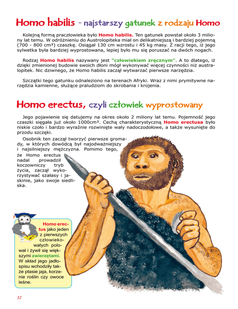 Homo habilis - najstarszy gatunek z rodzaju Homo Kolejną formą praczłowieka było Homo habilis. Ten gatunek powstał około 3 miliony lat temu. W odróżnieniu do Austrolopiteka miał on delikatniejszą i bardziej pojemną (700 - 800 cm³) czaszkę. Osiągał 130 cm wzrostu i 45 kg masy. Z racji tego, iż jego sylwetka była bardziej wyprostowana, lepiej było mu się poruszać na dwóch nogach. Rodzaj Homo habilis nazywany jest "człowiekiem zręcznym". A to dlatego, iż dzięki zmienionej budowie swoich dłoni mógł wykonywać więcej czynności niż australopitek. Nic dziwnego, że Homo habilis zaczął wytwarzać pierwsze narzędzia. Szczątki tego gatunku odnaleziono na terenach Afryki. Wraz z nimi prymitywne narzędzia kamienne, służące praludziom do skrobania i krojenia. Homo erectus, czyli człowiek wyprostowany Jego pojawienie się datujemy na okres około 2 miliony lat temu. Pojemność jego czaszki sięgała już około 1000cm³. Cechą charakterystyczną Homo erectusa było niskie czoło i bardzo wyraźnie rozwinięte wały nadoczodołowe, a także wysunięte do przodu szczęki. Osobnik ten zaczął tworzyć pierwsze gromady, w których dowódcą był najodważniejszy i najsilniejszy mężczyzna. Pomimo tego, że Homo erectus nadal prowadził koczowniczy tryb życia, zaczął wykorzystywać szałasy i jaskinie, jako swoje siedliska. Homo erectus jako jeden z pierwszych człowiekowatych polował i żywił się większymi zwierzętami. W skład jego jadłospisu wchodziły także ptasie jaja, korzenie roślin czy owoce leśne. 32