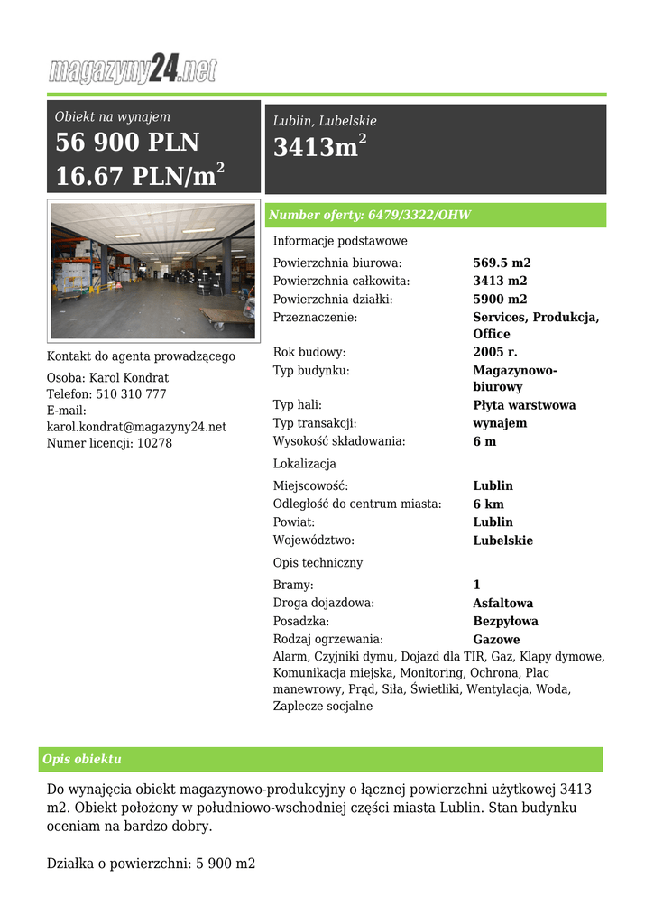 Obiekt na wynajem 56 900 PLN 2 16.67 PLN/m Lublin, Lubelskie 2 3413m Number oferty: 6479/3322/OHW Informacje podstawowe Powierzchnia biurowa: Powierzchnia całkowita: Powierzchnia działki: Przeznaczenie: Kontakt do agenta prowadzącego Osoba: Karol Kondrat Telefon: 510 310 777 E-mail: [email protected] Numer licencji: 10278 Rok budowy: Typ budynku: Typ hali: Typ transakcji: Wysokość składowania: 569.5 m2 3413 m2 5900 m2 Services, Produkcja, Office 2005 r. Magazynowobiurowy Płyta warstwowa wynajem 6m Lokalizacja Miejscowość: Odległość do centrum miasta: Powiat: Województwo: Lublin 6 km Lublin Lubelskie Opis techniczny Bramy: 1 Droga dojazdowa: Asfaltowa Posadzka: Bezpyłowa Rodzaj ogrzewania: Gazowe Alarm, Czyjniki dymu, Dojazd dla TIR, Gaz, Klapy dymowe, Komunikacja miejska, Monitoring, Ochrona, Plac manewrowy, Prąd, Siła, Świetliki, Wentylacja, Woda, Zaplecze socjalne Opis obiektu Do wynajęcia obiekt magazynowo-produkcyjny o łącznej powierzchni użytkowej 3413 m2. Obiekt położony w południowo-wschodniej części miasta Lublin. Stan budynku oceniam na bardzo dobry. Działka o powierzchni: 5 900 m2 Powierzchnia magazynowa (parter): 1543,5 m2 [18 zł/m2] Powierzchnia magazynowa (antresola+pomost): 1300 m2 [9 zł/m2] Powierzchnia biurowa (parter, I-piętro): 569,5 m2 [28 zł/m2] Utwardzony plac składowy: 750 m2 [2 zł/m2] Wysokość hali: - do dźwigarów - 6 [m] - maksymalna - 7 [m] - antresola - 3 [m] Bramy wjazdowe poziom "0": - 3 bramy o wymiarach, wys. 3 m, szer. 4 m - 1 brama wjazdowa, wys. 3 m, szer. 3 m Hala magazynowa przystosowana do zamontowania suwnicy. Możliwość zdemontowania antresoli pod potrzeby najemcy. Posadzka przemysłowa, bezpyłowa. Budynek administracyjny (2 kondygnacje) wykończony w wysokim standardzie, klimatyzowany. Parter z dużą powierzchnią open space i salą konferencyjną. Na pierwszym piętrze dotychczas znajdowały się biura zarządu. Teren obiektu jest ogrodzony i strzeżony przez 24h/dobę 7 dni w tygodniu. Przy obiekcie znajduję się parking na około 20 samochodów osobowych i 2 miejsca postojowe dla TIR-ów. Cały plac wokół nieruchomości utwardzony jest kostką brukową. Cena najmu netto: 56 900 zł/m-c (netto) Dodatkowo opłaty licznikowe i kaucja.
