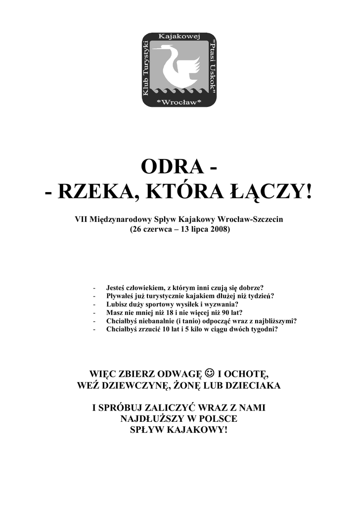 ODRA - RZEKA, KTÓRA ŁĄCZY! VII Międzynarodowy Spływ Kajakowy Wrocław-Szczecin (26 czerwca – 13 lipca 2008) - Jesteś człowiekiem, z którym inni czują się dobrze? Pływałeś juŜ turystycznie kajakiem dłuŜej niŜ tydzień? Lubisz duŜy sportowy wysiłek i wyzwania? Masz nie mniej niŜ 18 i nie więcej niŜ 90 lat? Chciałbyś niebanalnie (i tanio) odpocząć wraz z najbliŜszymi? Chciałbyś zrzucić 10 lat i 5 kilo w ciągu dwóch tygodni? ☺ WIĘC ZBIERZ ODWAGĘ I OCHOTĘ, WEŹ DZIEWCZYNĘ, śONĘ LUB DZIECIAKA I SPRÓBUJ ZALICZYĆ WRAZ Z NAMI NAJDŁUśSZY W POLSCE SPŁYW KAJAKOWY! Podstawowe warunki uczestnictwa: − − − − − − − − waŜny dowód osobisty, własny sprzęt biwakowy, transportowany w kajaku; kondycja i umiejętność pływania; niepływający muszą wiosłować w kapoku; organizator nie odpowiada za ewentualne szkody wyrządzone przez uczestnika, a dotyczące mienia lub zdrowia; straty z tego tytułu pokrywa sam uczestnik; kaŜda łódź musi mieć nazwę (litery wys. min. 10 cm) i oznaczone barwy narodowe; termin zgłoszeń – do 10.05.2008; w zgłoszeniu naleŜy podać datę urodzenia, numer dowodu osobistego, miejsce zamieszkania, PESEL, nr telefonu, adres e-mail oraz załączyć dowód wpłaty wpisowego za odcinek polski (180 zł, po 10 maja: 200 zł) względnie jego kopię; wycofanie się ze spływu zgłoszone do 25.05 spowoduje zwrot 2/3 wpłaconej kwoty (120 zł); po tym terminie wpisowe nie podlega zwrotowi; organizatorzy zastrzegają sobie wyłączne prawo interpretowania regulaminu. KaŜdy uczestnik ma prawo do: − − − − − − korzystania z apteczki spływowej, gorącego posiłku na koszt organizatorów na mecie kaŜdego polskiego etapu; uczestniczenia we wszystkich imprezach towarzyszących spływowi, otrzymania pamiątek spływowych, wklejek na odznaki turystyczne, ubezpieczenia w okresie od zejścia na wodę pierwszego dnia spływu do zakończenia spływu w Szczecinie 12 lipca (sobota), pomocy organizatorów przy doraźnej naprawie uszkodzonego sprzętu. KaŜdy uczestnik jest zobowiązany do: − − − − − − − − − przestrzegania niniejszego regulaminu i rozporządzeń doraźnych kierownictwa spływu; wykazania szczególnej ostroŜności przy mijaniu promów, barek i śluz; przestrzegania poleceń słuŜb granicznych obu państw; posiadania i okazywania dokumentów osobistych na Ŝądanie upowaŜnionych słuŜb; uczestniczenia (po co najmniej jednej osoby z kaŜdej osady) w odprawach organizowanych przez kierownictwo w przeddzień kaŜdego etapu, dbania o czystość obozowiska, niewyprzedzania na trasie pilota i płynięcia przed zamykającym spływ, zgłoszenia chorób mających wpływ na bezpieczeństwo uczestnika (np. padaczka), przestrzegania ogólnych przepisów ppoŜ. i bezpieczeństwa na wodzie. Przepisy porządkowe: − − − − − − − − − − godzina startu oznacza koniec czasu udostępniania spływowi pola biwakowego; godzina dopłynięcia do mety – moment otwarcia biwaku dla spływu; rano przed etapem i na wodzie obowiązuje bezwzględny zakaz picia alkoholu; pływanie poza grupą grozi ominięciem miejsc odpoczynku lub zakończenia etapu! przez śluzy cały spływ przepływa wspólnie; uczestnicy mogą – po zgłoszeniu – przepłynąć tylko odcinek Wrocław–Krosno Odrz.; w godzinach 23.00–6.00 na polu namiotowym obowiązuje cisza nocna; w wypadku zagroŜeń dla zdrowia uczestników komandor ma prawo do zmiany programu: skrócenia spływu lub rozwiązania bez zwrotu wpisowego; uczestnicy w 100% odpowiadają za szkody wyrządzone innym osadom i osobom trzecim; w wypadku zakłócenia spokoju i porządku (nieprzestrzeganie ciszy nocnej, alkohol na wodzie itp.) komandor moŜe wykluczyć uczestnika ze spływu; wykluczonym nie przysługuje zwrot wpisowego ani Ŝadne inne świadczenia. Zgłoszenia: kolega Andrzej Pawlak tel. 601 181 192 Wpłaty (tylko tej kwoty w złotych – 180 lub 200!) na konto: PKO BP S.A. I O/Wrocław 90 1020 5226 0000 6202 0214 4970 (z dopiskiem: VII MSK – 2008) Do zobaczenia na wodzie!