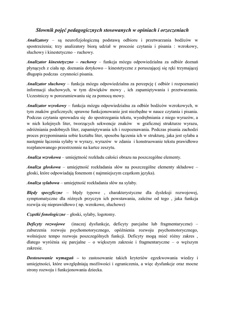 Słownik pojęć pedagogicznych stosowanych w opiniach i orzeczeniach Analizatory – są neurofizjologiczną podstawą odbioru i przetwarzania bodźców w spostrzeżenia; trzy analizatory biorą udział w procesie czytania i pisania : wzrokowy, słuchowy i kinestetyczno – ruchowy. Analizator kinestetyczno – ruchowy – funkcja mózgu odpowiedzialna za odbiór doznań płynących z ciała np. doznania dotykowo – kinestetyczne z poruszającej się ręki trzymającej długopis podczas czynności pisania. Analizator słuchowy – funkcja mózgu odpowiedzialna za percepcję ( odbiór i rozpoznanie) informacji słuchowych, w tym dźwięków mowy , ich zapamiętywania i przetwarzania. Uczestniczy w porozumiewaniu się za pomocą mowy. Analizator wzrokowy – funkcja mózgu odpowiedzialna za odbiór bodźców wzrokowych, w tym znaków graficznych; sprawne funkcjonowanie jest niezbędne w nauce czytania i pisania. Podczas czytania sprowadza się do spostrzegania tekstu, wyodrębniania z niego wyrazów, a w nich kolejnych liter, tworzących sekwencje znaków w graficznej strukturze wyrazu, odróżniania podobnych liter, zapamiętywania ich i rozpoznawania. Podczas pisania zachodzi proces przypominania sobie kształtu liter, sposobu łączenia ich w strukturę, jaka jest sylaba a następnie łączenia sylaby w wyrazy, wyrazów w zdania i konstruowanie tekstu prawidłowo rozplanowanego przestrzennie na kartce zeszytu. Analiza wzrokowa – umiejętność rozkładu całości obrazu na poszczególne elementy. Analiza głoskowa – umiejętność rozkładania słów na poszczególne elementy składowe – głoski, które odpowiadają fonemom ( najmniejszym cząstkom języka). Analiza sylabowa – umiejętność rozkładania słów na sylaby. Błędy specyficzne – błędy typowe , charakterystyczne dla dysleksji rozwojowej, symptomatyczne dla różnych przyczyn ich powstawania, zależne od tego , jaka funkcja rozwija się nieprawidłowo ( np. wzrokowe, słuchowe) Cząstki fonologiczne – głoski, sylaby, logotomy. Deficyty rozwojowe (inaczej dysfunkcje, deficyty parcjalne lub fragmentaryczne) – zaburzenia rozwoju psychomotorycznego, opóźnienia rozwoju psychomotorycznego, wolniejsze tempo rozwoju poszczególnych funkcji. Deficyty mogą mieć różny zakres , dlatego wyróżnia się parcjalne – o większym zakresie i fragmentaryczne – o węższym zakresie. Dostosowanie wymagań – to zastosowanie takich kryteriów egzekwowania wiedzy i umiejętności, które uwzględniają możliwości i ograniczenia, a więc dysfunkcje oraz mocne strony rozwoju i funkcjonowania dziecka. Dysleksja rozwojowa – specyficzne trudności w czytaniu i pisaniu, występujące u dzieci o prawidłowym rozwoju intelektualnym. Termin „rozwojowa” wskazuje na jej wczesne uwarunkowania, trwające od początku nauki czytania i pisania. Dysleksja nie wynika wprost z wad wzroku, słuchu ani zaniedbania środowiskowego czy dydaktycznego. Dysleksja – specyficzne trudności w opanowaniu procesu czytania ( wąskie ujęcie), występujące u dzieci o prawidłowym rozwoju intelektualnym, które mimo własnych starań i prawidłowych metod dydaktycznych szkoły, znacznie odbiega stanem swych umiejętności czytania ( technika, rozumienie) od poziomu osiągniętego przez rówieśników i na danym etapie edukacyjnym. Dysortografia – specyficzne trudności w opanowaniu poprawnej pisowni, występujące u dziecka o prawidłowym rozwoju intelektualnym, od początku nauki szkolnej. Rozpoznajemy w przypadkach, gdy trudności występują pomimo znajomości zasad poprawnej pisowni, prawidłowej motywacji do pracy nad poprawą pisania, braku wad zmysłów i zaniedbania pedagogicznego a spowodowane są zaburzeniami w rozwoju procesów poznawczych i funkcji percepcyjno – motorycznych. Dysgrafia – trudności w opanowaniu poprawnej formy graficznej pisma, zaburzony poziom graficzny pisma znacznie utrudniający odczytanie pisma. Dysgrafia wyraża się w formie zniekształceń strony graficznej takich jak niedokładności w odtwarzaniu liter, nieprawidłowe proporcje liter, brak połączeń liter w wyrazie , brak należytego odstępu między literami i wyrazami. Zniekształcenia te wynikają z zaburzeń funkcji percepcyjno – motorycznych ( motoryki ręki, koordynacji wzrokowo – ruchowej, percepcji wzrokowej). Utrzymują się we wszystkich formach pisania i nie ustępują samoistnie. Głęboka dysleksja rozwojowa – głębokie zaburzenia w uczeniu się podstawowych technik szkolnych o specyficznym charakterze ( postać kliniczna wg ICD – 10). Jako podstawę rozpoznania przyjmuje się zatrzymanie się na poziomie czytania elementarnego i nieosiągnięcie czytania zaawansowanego ze współwystępującymi poważnymi zaburzeniami w opanowaniu poprawnej pisowni. Najczęściej współtowarzyszą nasilone trudności w budowaniu wypowiedzi na piśmie, błędy stylistyczne, gramatyczne i interpunkcyjne ( w klasyfikacjach medycznych określa się je jako zaburzenia ekspresji pisania). Wskaźniki diagnostyczne to szeroki obszar zaburzeń, głębokie deficyty rozwojowe oraz trwałość zaburzeń. Występowanie głębokiej dysleksji rozwojowej jest podstawą do zwolnienia z nauki drugiego języka obcego. Funkcje słuchowo - językowe – zdolności, które umożliwiają w sposób swobodny i poprawny posługiwanie się przyswojonym językiem w formie pisemnej i ustnej. Integracja percepcyjno – motoryczna – prawidłowe skoordynowanie i współpraca funkcji wzrokowych, słuchowych i ruchowych. Koordynacja wzrokowo – ruchowa – współdziałanie, zharmonizowanie funkcji wzrokowych i ruchowych ( manipulacyjnych), współpraca „oka i ręki”, dzięki której można wykonywać precyzyjne ruchy rąk pod kontrolą wzroku, między innymi rysować, pisać. Lateralizacja jednorodna – dominacja czynności ruchowych jednej ze stron ciała, związana z funkcjonalną dominacją jednej półkuli mózgowej nad drugą, dotyczy wszystkich parzystyc