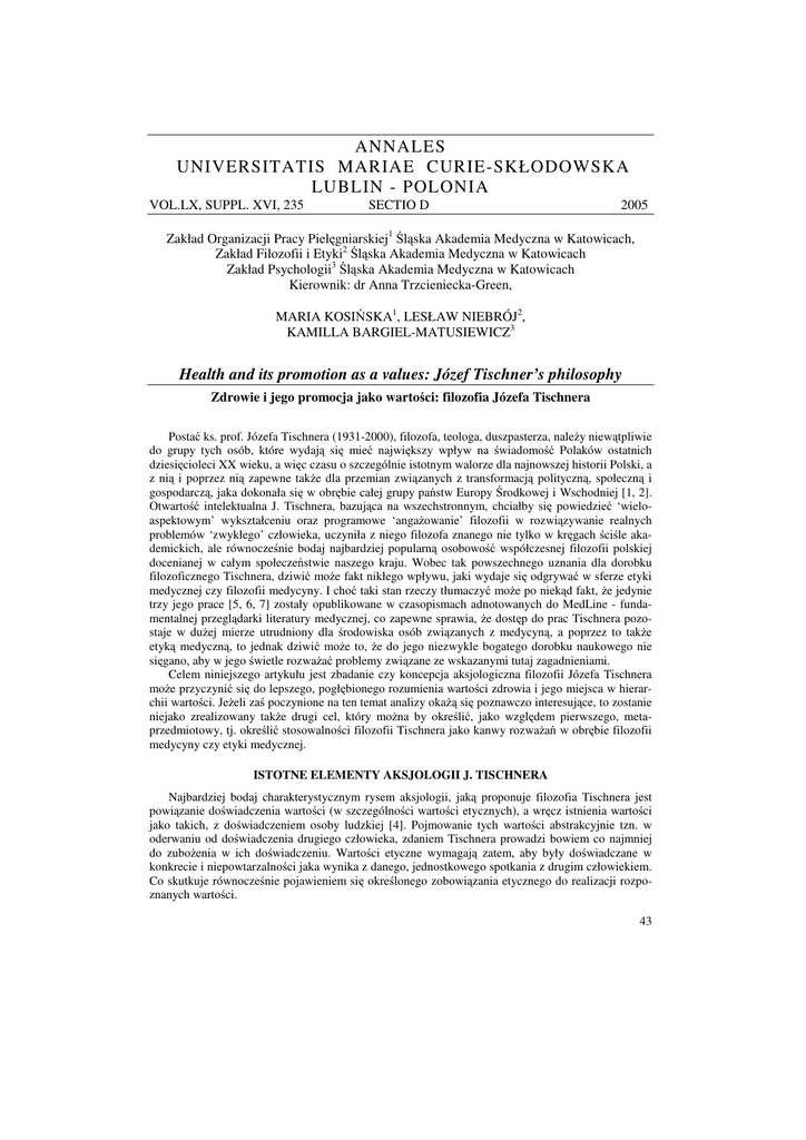 ANNALES UNIVERSITATIS MARIAE CURIE-SKŁODOWSKA LUBLIN - POLONIA VOL.LX, SUPPL. XVI, 235 SECTIO D 2005 Zakład Organizacji Pracy Pielęgniarskiej1 Śląska Akademia Medyczna w Katowicach, Zakład Filozofii i Etyki2 Śląska Akademia Medyczna w Katowicach Zakład Psychologii3 Śląska Akademia Medyczna w Katowicach Kierownik: dr Anna Trzcieniecka-Green, MARIA KOSIŃSKA1, LESŁAW NIEBRÓJ2, KAMILLA BARGIEL-MATUSIEWICZ3 Health and its promotion as a values: Józef Tischner’s philosophy Zdrowie i jego promocja jako wartości: filozofia Józefa Tischnera Postać ks. prof. Józefa Tischnera (1931-2000), filozofa, teologa, duszpasterza, należy niewątpliwie do grupy tych osób, które wydają się mieć największy wpływ na świadomość Polaków ostatnich dziesięcioleci XX wieku, a więc czasu o szczególnie istotnym walorze dla najnowszej historii Polski, a z nią i poprzez nią zapewne także dla przemian związanych z transformacją polityczną, społeczną i gospodarczą, jaka dokonała się w obrębie całej grupy państw Europy Środkowej i Wschodniej [1, 2]. Otwartość intelektualna J. Tischnera, bazująca na wszechstronnym, chciałby się powiedzieć ‘wieloaspektowym’ wykształceniu oraz programowe ‘angażowanie’ filozofii w rozwiązywanie realnych problemów ‘zwykłego’ człowieka, uczyniła z niego filozofa znanego nie tylko w kręgach ściśle akademickich, ale równocześnie bodaj najbardziej popularną osobowość współczesnej filozofii polskiej docenianej w całym społeczeństwie naszego kraju. Wobec tak powszechnego uznania dla dorobku filozoficznego Tischnera, dziwić może fakt nikłego wpływu, jaki wydaje się odgrywać w sferze etyki medycznej czy filozofii medycyny. I choć taki stan rzeczy tłumaczyć może po niekąd fakt, że jedynie trzy jego prace [5, 6, 7] zostały opublikowane w czasopismach adnotowanych do MedLine - fundamentalnej przeglądarki literatury medycznej, co zapewne sprawia, że dostęp do prac Tischnera pozostaje w dużej mierze utrudniony dla środowiska osób związanych z medycyną, a poprzez to także etyką medyczną, to jednak dziwić może to, że do jego niezwykle bogatego dorobku naukowego nie sięgano, aby w jego świetle rozważać problemy związane ze wskazanymi tutaj zagadnieniami. Celem niniejszego artykułu jest zbadanie czy koncepcja aksjologiczna filozofii Józefa Tischnera może przyczynić się do lepszego, pogłębionego rozumienia wartości zdrowia i jego miejsca w hierarchii wartości. Jeżeli zaś poczynione na ten temat analizy okażą się poznawczo interesujące, to zostanie niejako zrealizowany także drugi cel, który można by określić, jako względem pierwszego, metaprzedmiotowy, tj. określić stosowalności filozofii Tischnera jako kanwy rozważań w obrębie filozofii medycyny czy etyki medycznej. ISTOTNE ELEMENTY AKSJOLOGII J. TISCHNERA Najbardziej bodaj charakterystycznym rysem aksjologii, jaką proponuje filozofia Tischnera jest powiązanie doświadczenia wartości (w szczególności wartości etycznych), a wręcz istnienia wartości jako takich, z doświadczeniem osoby ludzkiej [4]. Pojmowanie tych wartości abstrakcyjnie tzn. w oderwaniu od doświadczenia drugiego człowieka, zdaniem Tischnera prowadzi bowiem co najmniej do zubożenia w ich doświadczeniu. Wartości etyczne wymagają zatem, aby były doświadczane w konkrecie i niepowtarzalności jaka wynika z danego, jednostkowego spotkania z drugim człowiekiem. Co skutkuje równocześnie pojawieniem się określonego zobowiązania etycznego do realizacji rozpoznanych wartości. 43 Wartości etyczne są obiektywne, „to znaczy stają przed nami jako coś nam zadanego, coś działającego na nas, coś, co nas do czegoś zobowiązuje” [4, s. 63]. Obiektywność wartości nie zakłada ich realności. Wartości są realne i idealne. Tischner wskazuje na wartość zdrowia, jako przykład wartości obiektywnej a zarazem idealnej: chociaż zdrowy człowiek ma coś z wartości zdrowia, przecież nie wyczerpuje w sobie tej wartości. Nie sposób byłoby wskazać na realnie istniejących ludzie idealnie zdrowych, tj. realizujących w sobie wartość zdrowia, taką, jaką ona jest. Wartości mogą być zarówno pozytywne, jak i negatywne. Jakkolwiek sam Tischner zauważa, że termin „wartość negatywna” może razić z punktu widzenia użytkownika języka, który samemu terminowi „wartość” jest gotów przypisywać jedynie pozytywne znaczenie, to jednak gotów jest zaakceptować używanie wskazanego terminu, z braku innego, który mógłby równie adekwatnie wyrażać przypisywaną temu terminowi treść. Różnica pomiędzy wartościami pozytywnymi a negatywnymi ma charakter jakościowy a nie tylko ilościowy. Różnica ta nie jest zatem kwestią stopnia. Wartości pozytywne i negatywne to nie krańce swoistego kontinuum np. pomiędzy sprawiedliwością (wartość pozytywna) a niesprawiedliwością (wartość negatywna). Tischner gotów jest twierdzić, że obiektywne są nie tylko wartości, ale obiektywna jest też przeciwstawność wartości pozytywnych i negatywnych. Wreszcie istotnym rysem wartości jest ich ułożenie w hierarchiczny porządek. Opisując ów porządek Tischner czyni wprost odwołanie do filozofii Maxa Schelera [4]. Nie oznacza to jednak, że koncepcja hierarchiczności wartości została jedynie niejako „skopiowana” od tego filozofa. Z łatwością można odkryć, że opisanie przez Tischnera hierarchii wartości pozostaje jego autorskim, krytycznym odniesieniem do myśli Schelera. Za Schelerem Tischner przyjmuje istnienie czterech zasadniczych stopni w hierarchii wartości. Najniżej w owej hierarchii osadza wartości związane z przyjemnością i nieprzyjemnością (wartości hedonistyczne), powyżej nich wartości związane ze zdrowiem i życiem (wartości witalne), ponad którymi z kolei odkrywa takie wartości takie jak prawda, dobro i piękno (wartości duchowe), podporządkowane już jedynie najwyższej wa