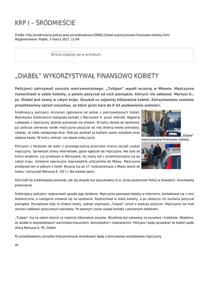 KRP I – ŚRÓDMIEŚCIE Źródło: http://srodmiescie.policja.waw.pl/rs/aktualnosci/28982,Diabel-wykorzystywal-finansowo-kobiety.html Wygenerowano: Piątek, 3 marca 2017, 11:49 Strona znajduje się w archiwum. „DIABEŁ” WYKORZYSTYWAŁ FINANSOWO KOBIETY Policjanci zatrzymali oszusta matrymonialnego. „Tulipan” wpadł wczoraj w Mławie. Mężczyzna rozkochiwał w sobie kobiety, a potem pożyczał od nich pieniądze, których nie oddawał. Mariusz K., ps. Diabeł jest znany w całym kraju. Oszukał co najmniej kilkanaście kobiet. Zatrzymanemu zostanie przedstawiony zarzut oszustwa, za które grozi kara do 8 lat pozbawienia wolności. Śródmiejscy policjanci otrzymali zgłoszenie od jednej z pokrzywdzonych kobiet. Mieszkanka Śródmieścia nawiązała kontakt z Mariuszem K. przez Internet. Najpierw czatowała z mężczyzną, później wymieniali się smsami. W końcu doszło do spotkania. Już podczas pierwszej randki mężczyzna pożyczył od niej drobną kwotę pieniędzy, mówiąc, że odda następnego dnia. Podczas spotkań za każdym razem wyłudzał coraz większe kwoty. W końcu zniknął i nie dawał znaku życia. „Diabeł” wykorzystywał finansowo kobiety Policjanci z Wydziału do walki z przestępczością przeciwko mieniu zaczęli szukać mężczyzny. Sprawdzali strony internetowe, gdzie ogłaszał się mężczyzna. Nie było do końca wiadomo, czy przebywa w Warszawie, bo znany był z przemieszczania się po całym kraju. Ustalenia operacyjne doprowadziły policjantów do Mławy. Mężczyzna przebywał tam w jednym z hoteli. Wczoraj tuż po 17. funkcjonariusze z Mławy weszli do hotelu i zatrzymali Mariusza K. (43 l.). Nie stawiał oporu. Dziś trafił do śródmiejskiej komendy. Jak się okazało był poszukiwany m.in. przez posterunek Policji w Kowalach i wrocławską prokuraturę. Śródmiejscy policjanci rozpracowali sposób jego działania. Mężczyzna poznawał kobiety w Internecie, kontaktował się z nimi telefonicznie, a następnie umawiał się na spotkania. Rozkochiwał w sobie kobiety, a po zdobyciu ich zaufania pożyczał pieniądze. Początkowo były to drobne kwoty, jednak stopniowo „Tulipan” prosił o większe pożyczki. Mężczyzna nie miał zamiaru oddawać pożyczonych pieniędzy. Po pewnym czasie urywał kontakt z poznanymi kobietami. „Tulipan” ma na swoim koncie co najmniej kilkanaście oszustw. Wcześniej był notowany za oszustwa i kradzieże. Wiadomo, że działał w województwach warmińsko-mazurskim, dolnośląskim i mazowieckim. Policjanci będą sprawdzać ile kobiet padło ofiarą Mariusza K. PS. Diabeł. Po przedstawieniu zarzutów funkcjonariusze wnioskować będą o tymczasowe aresztowanie mężczyzny. ah Ocena: 0/5 (0) Tweetnij