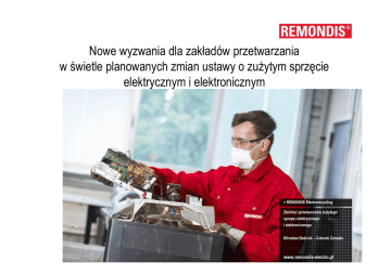 Nowe wyzwania dla zakładów przetwarzania w świetle planowanych zmian ustawy o zużytym sprzęcie elektrycznym i elektronicznym > REMONDIS Electrorecycling Zbiórka i przetwarzanie zużytego sprzętu elektrycznego i elektronicznego Mirosław Baściuk – Członek Zarządu www.remondis-electro.pl 2 REMONDIS Electrorecycling Sp.z o.o. Opracował: Mirosław Baściuk Aktualna sytuacja dla zakładów przetwarzania Niskie ceny ze strony organizacji odzysku, brak zainteresowania dla wysokiej jakości Wysoki koszt pozyskania odpadów Konieczność zbiórki i przetwarzania wg 10 grup ZSEE Szara strefa definiowana jako: Brak minimalnego wyposażenia i standardów przetwarzania Zbiórka i przetwarzanie ilości nie możliwych z punktu widzenia technologicznego Przetwarzanie niezgodne z przepisami europejskimi i przepisami ochrony środowiska Brak wymaganych prawem zezwoleń Sytuacja poprawiła się jednak znacznie w stosunku do lat ubiegłych! Powstały 3 zakłady przetwarzania sprzętu chłodniczego dysponujące niezbędną technologią 3 REMONDIS Electrorecycling Sp.z o.o. Opracował: Mirosław Baściuk Nowy podział odpadów ZSEE 6 grup odpadów urządzenia działające na zasadzie wymiany temperatury (w tym sprzęt chłodniczy), urządzenia zawierające ekran (telewizory i monitory), lampy, sprzęt wielkogabarytowy (jeden z wymiarów przekraczający 50 cm), sprzęt małogabarytowy sprzęt IT i telekomunikacyjny Podział stosowany już wcześniej w innych krajach europejskich Dostosowany do możliwości technologicznych i kosztowych Konieczność finansowania grup „kosztowych” przez organizacje odzysku 4 REMONDIS Electrorecycling Sp.z o.o. Opracował: Mirosław Baściuk Standardy przetwarzania Minimalne standardy jakości dla przetwarzania, odzysku, recyklingu i porzygotowania do ponownego użycia zużytego sprzętu Komisja Europejska wyda akty wykonawcze określające minimalne standardy Standardy zostaną opracowane przez europejskie organizacje normalizacyjne Cenelec rozpoczął już pracę na europejską normą Czy w Polsce pojawią się standardy w okresie przejściowym? 5 REMONDIS Electrorecycling Sp.z o.o. Opracował: Mirosław Baściuk Audyty zakładów przetwarzania Skuteczne narzędzie autokontroli ze strony organizacji odzysku Wykonywane przez firmy zewnętrzne na zlecenie OO Potwierdzające możliwość przetwarzania konkretnych grup sprzętu Np. test 100 urządzeń 6 REMONDIS Electrorecycling Sp.z o.o. Opracował: Mirosław Baściuk System informatyczny Dane wprowadzane na bieżąco, w trybie online Rejestracja ilości przyjętych do zakładu, przetworzonych i wysłanych do odzysku i recyklingu Dobre narzędzie do weryfikacji danych i możliwości 7 REMONDIS Electrorecycling Sp.z o.o. Opracował: Mirosław Baściuk Forum Zakładów Przetwarzania Działalność informacyjna w zakresie ustawy o zużytym sprzęcie elektrycznym i elektronicznym Tworzenie i propagowanie standardów przetwarzania Praca w zakresie zapisów nowej ustawy o zużytym sprzęcie elektrycznym i elektronicznym Utworzenie Kodeksu Dobrych Praktyk Zakład przetwarzania nie przyjmuje zdekompletowanego zużytego sprzętu elektrycznego i elektronicznego (ZSEiE). Zdekompletowany sprzęt nie jest sprzętem i nie może być klasyfikowany w kodach odpowiadających ZSEiE Za przyjęcie zdekompletowanych urządzeń pobierana jest odpłatność Lodówki zawierające freony i inne czynniki chłodnicze zawierające substancje zubażające warstwę ozonową (GWP > 15) są przekazywane do zakładów posiadających właściwe technologie Prowadząc zbiórki na terenie gminy zbierający i ZP dobrowolnie przekazuje do gminy rzetelne informacje o ilości i rodzajach zebranych odpadów. ZP raportuje wyłącznie rzeczywiście zebrane i przetworzone ilości ZSEiE. Dziękuję za uwagę! REMONDIS Electrorecycling Sp. z o.o. Centrala Zarządu ul.Ekologiczna 2 05-870 Błonie tel. +48 22 / 593 03 00 fax +48 22 / 593 03 01 [email protected] www.remondis-electro.pl