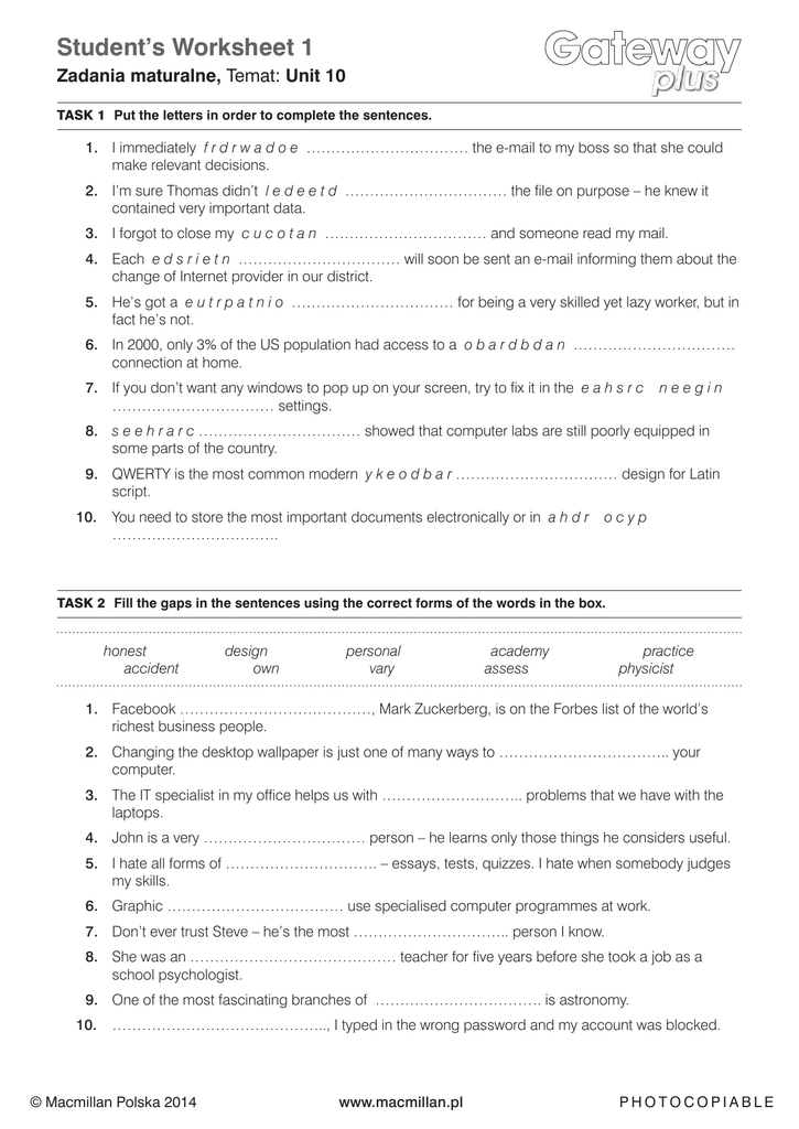 Student’s Worksheet 1 Zadania maturalne, Temat: Unit 10 TASK 1 Put the letters in order to complete the sentences. 1. I immediately f r d r w a d o e …………………………… the e-mail to my boss so that she could make relevant decisions. 2. I’m sure Thomas didn’t l e d e e t d …………………………… the file on purpose – he knew it contained very important data. 3. I forgot to close my c u c o t a n …………………………… and someone read my mail. 4. Each e d s r i e t n …………………………… will soon be sent an e-mail informing them about the change of Internet provider in our district. 5. He’s got a e u t r p a t n i o …………………………… for being a very skilled yet lazy worker, but in fact he’s not. 6. In 2000, only 3% of the US population had access to a o b a r d b d a n …………………………… connection at home. 7. If you don’t want any windows to pop up on your screen, try to fix it in the e a h s r c …………………………… settings. neegin 8. s e e h r a r c …………………………… showed that computer labs are still poorly equipped in some parts of the country. 9. QWERTY is the most common modern y k e o d b a r …………………………… design for Latin script. 10. You need to store the most important documents electronically or in a h d r ……………………………. ocyp TASK 2 Fill the gaps in the sentences using the correct forms of the words in the box. honest accident design own personal vary academy assess practice physicist 1. Facebook …………………………………, Mark Zuckerberg, is on the Forbes list of the world’s richest business people. 2. Changing the desktop wallpaper is just one of many ways to …………………………….. your computer. 3. The IT specialist in my office helps us with ……………………….. problems that we have with the laptops. 4. John is a very …………………………… person – he learns only those things he considers useful. 5. I hate all forms of …………………………. – essays, tests, quizzes. I hate when somebody judges my skills. 6. Graphic ……………………………… use specialised computer programmes at work. 7. Don’t ever trust Steve – he’s the most ………………………….. person I know. 8. She was an …………………………………… teacher for five years before she took a job as a school psychologist. 9. One of the most fascinating branches of ……………………………. is astronomy. 10. …………………………………….., I typed in the wrong password and my account was blocked. © Macmillan Polska 2014 www.macmillan.pl PHOTOCOPIABLE Student’s Worksheet 2 Zadania maturalne, Temat: Unit 10 TASK 3 EXAM TASK – BASIC LEVEL Przeczytaj tekst. Z podanych odpowiedzi wybierz właściwą, otrzymać logiczny i gramatycznie poprawny tekst. Zakreśl literę A, B albo C. The Man Who Invented Email It all began in the summer 1978 when Shiva Ayyadurai, a 14-year-old boy 3.1. ______ to a programming course at the University of Medicine and Dentistry of New Jersey in Newark. One of his professors noticed his talent and gave him a challenge. The teenager 3.2. _____ to change the traditional paper-based communication system to an electronic one. At that time, a very primitive form of digital messages existed, but it was used by computer specialists only. Shiva imagined something simple; something that everyone could use, quickly and efficiently. The teenager began his project by examining paper-based mail systems 3.3. _____ in companies around the world. He noticed that there were several elements present in all of them: inbox, outbox, draft, to, from, attachment, and 3.4. _______ others, which we know so well these days. What Shiva did was include all of them in a very simple interface. And that’s 3.5. ______ the e-mail accounts we know today came from. 3.1. a. is recruited b. recruited c. was recruited TASK 4 3.2. a. was asking b. asked c. was asked 3.3. a. uses b. used c. using 3.4. a. a few b. few c. some 3.5. a. why b. where c. what EXAM TASK – BASIC LEVEL Uzupełnij poniższe mini dialogi (4.1–4.5), wybierając brakującą wypowiedź jednej z osób. Zakreśl literę A, B albo C. 4.1 X: There is something wrong with my hard drive. Y: …………………………………………………………………….. X: Thanks, that would be great. a. Why don’t you call an IT specialist? b. I could come and have a look at it. c. Have you asked anyone for help? 4.2 X: ……………………………………………………….. . Y: No, but it will be once I finish writing it. a. Have you sent the e-mails yet? b. Will you be writing the e-mail any time soon? c. Has the e-mail been sent yet? 4.3 X: ………………………………………………………………. Y: Really? Did you have a good time? a. The city is visited by hundreds of tourists every day. b. I’ve visited this city three times already. c. I’ve visited many cities in England, but never this one. © Macmillan Polska 2014 www.macmillan.pl PHOTOCOPIABLE Student’s Worksheet 3 Zadania maturalne, Temat: Unit 10 4.4 X: I’ve forgotten the password to my online bank account. Y: ………………………………………………………………….. X: Yes, but it’s going to take some time. a. That’s bad. Is it blocked now? b. Have you got any idea how to recover it? c. Poor you, it happened to me last month. 4.5 X: So how are things with you and Tom? Y: …………………………………………………………….. X: Congratulations! I knew it was going to end well. a. We finally got back together. b. Well, we decided to split up. c. I’m getting married, you know! TASK 5 EXAM TASK – EXTENDED LEVEL Uzupełnij zdania 5.1–5.5, wykorzystując podane w nawiasach wyrazy w odpowiedniej formie. Nie należy zmieniać kolejnoś