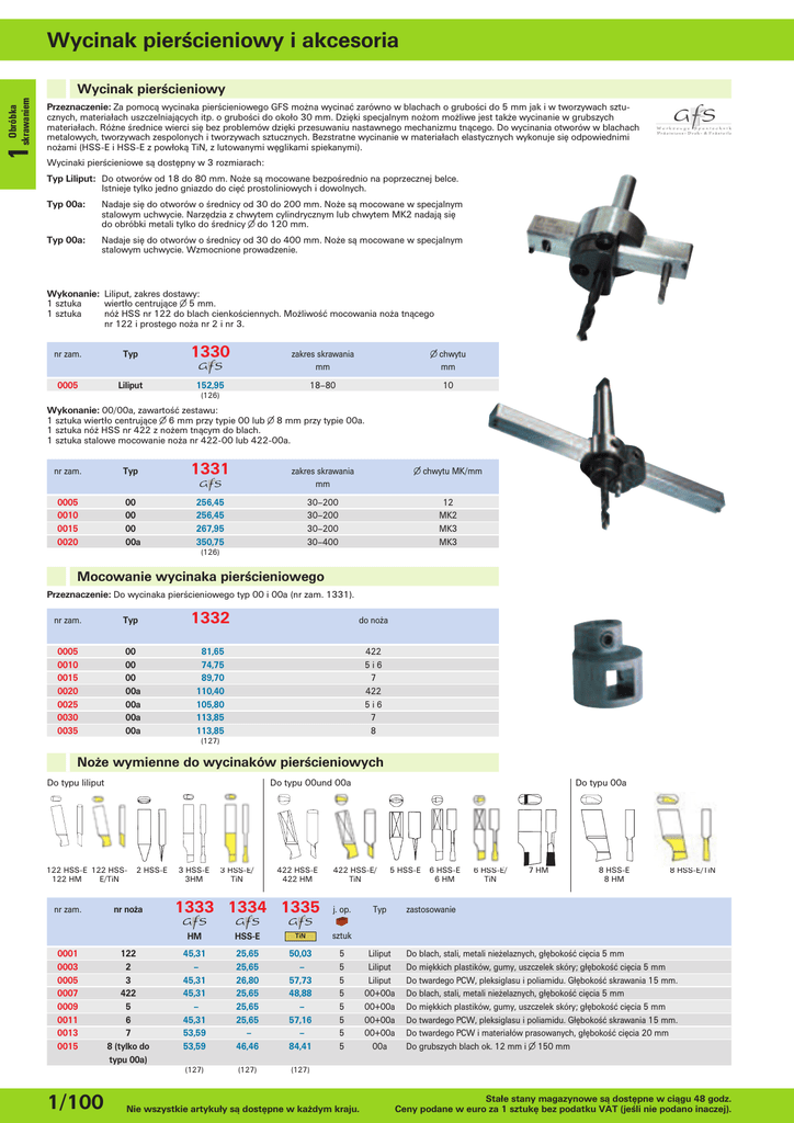 Wycinak pierścieniowy i akcesoria 1 Obróbka skrawaniem Wycinak pierścieniowy Przeznaczenie: Za pomocą wycinaka pierścieniowego GFS można wycinać zarówno w blachach o grubości do 5 mm jak i w tworzywach sztucznych, materiałach uszczelniających itp. o grubości do około 30 mm. Dzięki specjalnym nożom możliwe jest także wycinanie w grubszych materiałach. Różne średnice wierci się bez problemów dzięki przesuwaniu nastawnego mechanizmu tnącego. Do wycinania otworów w blachach metalowych, tworzywach zespolonych i tworzywach sztucznych. Bezstratne wycinanie w materiałach elastycznych wykonuje się odpowiednimi nożami (HSS-E i HSS-E z powłoką TiN, z lutowanymi węglikami spiekanymi). Wycinaki pierścieniowe są dostępny w 3 rozmiarach: Typ Liliput: Do otworów od 18 do 80 mm. Noże są mocowane bezpośrednio na poprzecznej belce. Istnieje tylko jedno gniazdo do cięć prostoliniowych i dowolnych. Typ 00a: Nadaje się do otworów o średnicy od 30 do 200 mm. Noże są mocowane w specjalnym stalowym uchwycie. Narzędzia z chwytem cylindrycznym lub chwytem MK2 nadają się do obróbki metali tylko do średnicy ∅ do 120 mm. Typ 00a: Nadaje się do otworów o średnicy od 30 do 400 mm. Noże są mocowane w specjalnym stalowym uchwycie. Wzmocnione prowadzenie. Wykonanie: Liliput, zakres dostawy: 1 sztuka wiertło centrujące ∅ 5 mm. 1 sztuka nóż HSS nr 122 do blach cienkościennych. Możliwość mocowania noża tnącego nr 122 i prostego noża nr 2 i nr 3. nr zam. Typ 1330 zakres skrawania mm ∅ chwytu mm 0005 Liliput 152,95 18–80 10 (126) Wykonanie: 00/00a, zawartość zestawu: 1 sztuka wiertło centrujące ∅ 6 mm przy typie 00 lub ∅ 8 mm przy typie 00a. 1 sztuka nóż HSS nr 422 z nożem tnącym do blach. 1 sztuka stalowe mocowanie noża nr 422-00 lub 422-00a. nr zam. Typ 1331 zakres skrawania mm ∅ chwytu MK/mm 0005 0010 0015 0020 00 00 00 00a 256,45 256,45 267,95 350,75 30–200 30–200 30–200 30–400 12 MK2 MK3 MK3 (126) Mocowanie wycinaka pierścieniowego Przeznaczenie: Do wycinaka pierścieniowego typ 00 i 00a (nr zam. 1331). nr zam. Typ 1332 do noża 0005 0010 0015 0020 0025 0030 0035 00 00 00 00a 00a 00a 00a 81,65 74,75 89,70 110,40 105,80 113,85 113,85 422 5i6 7 422 5i6 7 8 (127) Noże wymienne do wycinaków pierścieniowych Do typu 00und 00a Do typu liliput 122 HSS-E 122 HSS122 HM E/TiN 2 HSS-E nr zam. nr noża 0001 0003 0005 0007 0009 0011 0013 0015 122 2 3 422 5 6 7 8 (tylko do typu 00a) 1/100 3 HSS-E 3HM 3 HSS-E/ TiN 422 HSS-E 422 HM 1333 1334 1335 Do typu 00a 422 HSS-E/ TiN j. op. HM HSS-E TiN sztuk 45,31 – 45,31 45,31 – 45,31 53,59 53,59 25,65 25,65 26,80 25,65 25,65 25,65 – 46,46 50,03 – 57,73 48,88 – 57,16 – 84,41 5 5 5 5 5 5 5 5 (127) (127) (127) Nie wszystkie artykuły są dostępne w każdym kraju. 5 HSS-E Typ 6 HSS-E 6 HM 6 HSS-E/ TiN 7 HM 8 HSS-E 8 HM 8 HSS-E/TiN zastosowanie Liliput Liliput Liliput 00+00a 00+00a 00+00a 00+00a 00a Do blach, stali, metali nieżelaznych, głębokość cięcia 5 mm Do miękkich plastików, gumy, uszczelek skóry; głębokość cięcia 5 mm Do twardego PCW, pleksiglasu i poliamidu. Głębokość skrawania 15 mm. Do blach, stali, metali nieżelaznych, głębokość cięcia 5 mm Do miękkich plastików, gumy, uszczelek skóry; głębokość cięcia 5 mm Do twardego PCW, pleksiglasu i poliamidu. Głębokość skrawania 15 mm. Do twardego PCW i materiałów prasowanych, głębokość cięcia 20 mm Do grubszych blach ok. 12 mm i ∅ 150 mm Stałe stany magazynowe są dostępne w ciągu 48 godz. Ceny podane w euro za 1 sztukę bez podatku VAT (jeśli nie podano inaczej).