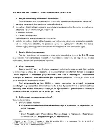 ROCZNE SPRAWOZDANIA Z GOSPODAROWANIA ODPADAMI 1. Kto jest obowiązany do składania sprawozdań? 1 Roczne sprawozdanie o wytwarzanych odpadach i o gospodarowaniu odpadami sporządza : 1) wytwórca obowiązany do prowadzenia ewidencji odpadów; 2) prowadzący działalność polegającą na gospodarowaniu odpadami, (z wyłączeniem prowadzącego odbieranie odpadów komunalnych), w zakresie: a) zbierania odpadów, b) przetwarzania odpadów – obowiązany do prowadzenia ewidencji odpadów; 3) podmiot prowadzący działalność polegającą na wydobywaniu odpadów ze składowiska odpadów lub ze zwałowiska odpadów, na podstawie zgody na wydobywanie odpadów lub decyzji zatwierdzającej instrukcję prowadzenia składowiska odpadów w fazie poeksploatacyjnej. 2. Termin składania sprawozdań. Podmioty obowiązane do sporządzania sprawozdań składają je w terminie do dnia 15 marca za poprzedni rok kalendarzowy marszałkowi województwa właściwemu ze względu na: miejsce 2 wytwarzania, zbierania lub przetwarzania odpadów . 3. Wzory formularzy. Zgodnie z art. 237 ust. 1 pkt 1 ustawy o odpadach podmioty obowiązane przed dniem wejścia w życie niniejszej ustawy do sporządzania i składania zbiorczych zestawień danych o rodzajach i ilości odpadów, o sposobach gospodarowania nimi oraz o instalacjach i urządzeniach służących do odzysku i unieszkodliwiania tych odpadów sporządzają i składają je, za lata 2012 -2014, stosując przepisy dotychczasowe. Stąd sprawozdania za lata 2012-2014 należy sporządzać na wzorach formularzy określonych rozporządzeniem Ministra Środowiska z dnia 8 grudnia 2010 r. w sprawie zakresu informacji oraz wzorów formularzy służących do sporządzania i przekazywania zbiorczych zestawień danych o odpadach (Dz. U. Nr 249, poz. 1674). 4. Gdzie wysłać formularz sprawozdania? Sprawozdania można: 1. przesyłać pocztą na adres: Urząd Marszałkowski Województwa Mazowieckiego w Warszawie, ul. Jagiellońska 26, 03-719 Warszawa lub: Urząd Marszałkowski Województwa Mazowieckiego w Warszawie, Departament Środowiska ul. ks. I. Kłopotowskiego 5, 03-718 Warszawa. 1 Zgodnie z art. 75 ust. 1 ustawy z dnia 14 grudnia 2012 r. o odpadach (Dz. U. z 2013 r. poz. 21, z późn. zm. zwanej dalej ustawą o odpadach). 2 Zgodne z art. 76 ust. 1 ustawy o odpadach. 1 2. Składać osobiście w Kancelarii Ogólnej Urzędu Marszałkowskiego Województwa Mazowieckiego w Warszawie przy ul. Jagiellońskiej 26 (parter) lub w punkcie kancelaryjnym przy ul. ks. I. Kłopotowskiego 5 (parter, pok. 7), gdzie siedzibę ma Departament Środowiska. 3. W przypadku posiadania kwalifikowanego podpisu elektronicznego wysyłać drogą elektroniczną na adres elektronicznej skrzynki podawczej Urzędu Marszałkowskiego Województwa Mazowieckiego w Warszawie (esp.mazovia.pl). 5. Obowiązki posiadacza odpadów z zakresu prowadzenia ewidencji. Posiadacz odpadów jest obowiązany do prowadzenia na bieżąco ich ilościowej i jakościowej 3 ewidencji zgodnie z katalogiem odpadów . Katalog określono w rozporządzeniu Ministra Środowiska z dnia 9 grudnia 2014 r. w sprawie katalogu odpadów (Dz. U. poz. 1923). W przypadku korzystania przez wytwórców odpadów ze wspólnego lokalu dopuszcza się przeniesienie odpowiedzialności za wytworzone odpady na rzecz jednego z nich lub na rzecz wynajmującego lokal, jeżeli podmiot ten zapewni postępowanie z przyjętymi odpadami w sposób 4 zgodny z ustawą o odpadach . Przeniesienie odpowiedzialności, oznacza przeniesienie praw i obowiązków ciążących na wytwórcy odpadów i następuje pod warunkiem zawarcia umowy w formie pisemnej pod rygorem nieważności. Sprzedawca odpadów i pośrednik w obrocie odpadami niebędący posiadaczami odpadów są 5 obowiązani do prowadzenia na bieżąco ilościowej i jakościowej ewidencji odpadów niebezpiecznych . 6 Obowiązek prowadzenia ewidencji odpadów nie dotyczy : 1) wytwórców: a) odpadów komunalnych, b) odpadów w postaci pojazdów wycofanych z eksploatacji, jeżeli pojazdy te zostały przekazane do przedsiębiorcy prowadzącego stację demontażu lub przedsiębiorcy prowadzącego punkt zbierania pojazdów; 2) osób fizycznych i jednostek organizacyjnych niebędących przedsiębiorcami, które wykorzystują odpady na potrzeby własne, zgodnie z rozporządzeniem Ministra Środowiska z dnia 21 kwietnia 2006 r. w sprawie listy rodzajów odpadów, które posiadacz odpadów może przekazywać osobom fizycznym lub jednostkom organizacyjnym niebędącym przedsiębiorcami, oraz dopuszczalnych metod ich odzysku (Dz. U. Nr 75, poz. 527) 3) podmiotów prowadzących działalność inną niż działalność gospodarcza w zakresie gospodarowania odpadami, które zbierają odpady opakowaniowe i odpady w postaci zużytych artykułów konsumpcyjnych, w tym leki i opakowania po lekach przez apteki, przyjmowania 3 Zgodnie z art. 66 ust. 1 ustawy o odpadach. Zgodnie z art. 28 ust. 1 ustawy o odpadach. 5 Zgodnie z art. 66 ust. 3 ustawy o odpadach. 6 Zgodnie z art. 66 ust. 4 ustawy o odpadach. 4 2 zużytych artykułów konsumpcyjnych w sklepach, systemów zbierania odpadów w szkołach, placówkach oświatowo-wychowawczych, urzędach i instytucjach (nieprofesjonalnej działalności w zakresie zbierania odpadów); 4) rodzajów odpadów lub ilości odpadów określonych w rozporządzeniu Ministra Środowiska z dnia 12 grudnia 2014 r. (Dz. U. poz. 1974) w sprawie rodzajów odpadów i ilości odpadów, dla których nie ma obowiązku prowadzenia ewidencji odpadów. 7 Ewidencję odpadów prowadzi się z zastosowaniem następujących dokumentów : 1) w przypadku posiadaczy odpadów: a) karty przekazania odpadów, b) karty ewidencji odpadów, c) karty ewidencji komunalnych osadów ściekowych, d) karty ewidencji zużytego sprzętu elektrycznego i elektronicznego, e) karty ewidencji pojazdów wycofanych z eksploatacji; 2) w przypadku sprzedawcy odpadów i pośrednika w obrocie odpadami, niebędących posiadaczami odpadów - kar