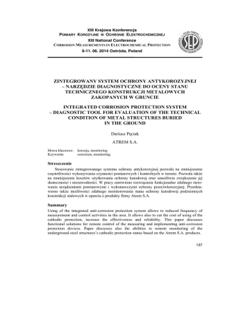 XIII Krajowa Konferencja POMIARY KOROZYJNE W OCHRONIE ELEKTROCHEMICZNEJ XIII National Conference CORROSION MEASUREMENTS IN ELECTROCHEMICAL PROTECTION 9-11. 06. 2014 Ostróda, Poland ZINTEGROWANY SYSTEM OCHRONY ANTYKOROZYJNEJ – NARZĘDZIE DIAGNOSTYCZNE DO OCENY STANU TECHNICZNEGO KONSTRUKCJI METALOWYCH ZAKOPANYCH W GRUNCIE INTEGRATED CORROSION PROTECTION SYSTEM – DIAGNOSTIC TOOL FOR EVALUATION OF THE TECHNICAL CONDITION OF METAL STRUCTURES BURIED IN THE GROUND Dariusz Pęciak ATREM S.A. Słowa kluczowe: Keywords: korozja, monitoring corrosion, monitoring Streszczenie Stosowanie zintegrowanego systemu ochrony antykorozyjnej pozwala na zmniejszenie częstotliwości wykonywania czynności pomiarowych i kontrolnych w terenie. Pozwala także na zmniejszenie kosztów użytkowania ochrony katodowej oraz umożliwia zwiększenie jej skuteczności i niezawodności. W pracy omówiono rozwiązania funkcjonalne zdalnego sterowania urządzeniami pomiarowymi i wykonawczymi ochrony przeciwkorozyjnej. Przedstawiono także możliwości zdalnego monitorowania stanu ochrony katodowej podziemnych konstrukcji stalowych w oparciu o produkty firmy Atrem S.A. Summary Using of the integrated anti-corrosion protection system allows to reduced frequency of measurement and control activities in the area. It allows also to cut the cost of using of the cathodic protection, increase the effectiveness and reliability. This paper discusses functional solutions for remote control of the measuring and implementing anti-corrosion protection devices. Paper discusses also the abilities to remote monitoring of the underground steel structures’s cathodic protection status based on the Atrem S.A. products. 137 1. Wstęp Zgodnie z normą PN-EN 12954 służby eksploatacyjne konstrukcji metalowych w gruntach i wodach zobowiązane są do przeprowadzania inspekcji skuteczności ochrony katodowej obejmującej kontrolę wyposażenia oraz pomiary na konstrukcji. Skuteczność ochrony katodowej oceniana przez personel ochrony katodowej polega na porównywaniu wyników pomiarów bieżących z wartościami odniesienia lub kryteriami ochrony. Jako wartości odniesienia służą wartości zmierzone w stacjach ochrony katodowej i w stacjach pomiarowych podczas uruchomienia lub w następnych latach za pomocą odpowiednich metod pomiarowych. Jeżeli w trakcie eksploatacji konstrukcji nastąpią zmiany, które spowodują, że ochrona katodowa nie jest w pełni skuteczna w stosunku do całej konstrukcji, to należy wykonać badania funkcjonalne i wprowadzić odpowiednie zmiany celem przywrócenia efektywnej ochrony katodowej. Inspekcja systemu ochrony katodowej, o ile nie są stosowane i regularnie weryfikowane metody kontroli zdalnej, to badania funkcjonalne należy wykonywać w typowych odstępach czasu: Badanie Częstość Układy anod galwanicznych Co rok lub częściej, o ile wymagają tego warunki pracy Urządzenia z zewnętrznym źródłem prądu Co 3 miesiące lub częściej, o ile wymagają tego warunki pracy Urządzenia drenażowe Co miesiąc lub częściej o ile prądy błądzące są duże Połączenia z obcymi konstrukcjami Co rok lub częściej o ile wymagają tego warunki pracy Odgraniczniki prądu stałego i układy uziemiające Co rok lub częściej o ile wymagają tego warunki pracy Układy bezpieczeństwa i urządzenia zabezpieczające Co rok lub częściej o ile wymagają tego warunki pracy Stacje pomiarowe Co rok wybrane i co 3 lata wszystkie Zgodnie ze standardem ST-IGG-0602, jeśli stosowany jest zdalny nadzór ochrony katodowej i/lub ochrony przed oddziaływaniem prądu przemiennego (zdalny monitoring), to wówczas można odpowiednio zmniejszyć częstotliwość przeprowadzania kontroli działania urządzeń ochrony katodowej i/lub urządzeń zabezpieczających przed oddziaływaniem prądu przemiennego oraz wykonywania pomiarów okresowych w terenie. Rodzaje okresowych czynności eksploatacyjnych ochrony przeciwkorozyjnej gazociągu wykonywanych w terenie (kontroli, pomiarów, przeglądów i konserwacji) i ich częstotliwości powinny być określone przez specjalistę/operatora w zależności od rodzaju zastosowanego monitoringu, informacji uzyskiwanych tą drogą i zakresu stosowania. Firma Atrem, wychodząc naprzeciw oczekiwaniom i potrzebom personelu ochrony przeciwkorozyjnej oraz mając na względzie czynniki ekonomiczne, udostępnia specjalistyczne narzędzie diagnostyczne do oceny stanu technicznego konstrukcji metalowych przez wdrażanie zintegrowanego systemu ochrony antykorozyjnej. 138 2. Zintegrowany system ochrony antykorozyjnej Zintegrowany system ochrony antykorozyjnej, o którym mowa w referacie, zakłada dostarczenie maksymalnej ilości informacji potrzebnych do oceny przez personel ochrony katodowej stanu technicznego konstrukcji metalowych. Zintegrowany system ochrony antykorozyjnej wyróżnia: – zdalny monitoring urządzeń ochrony katodowej, – zdalne zarządzanie urządzeniami ochrony katodowej, – wizualizacja i analiza otrzymanych danych, – ewidencja, paszportyzacja stanu technicznego konstrukcji. Rys. 1. Schemat zintegrowanego systemu ochrony katodowej 3. Zdalny monitoring urządzeń ochrony katodowej Elementy instalacji ochrony katodowej, podlegające zdalnemu monitoringowi, stanowią: – stacje ochrony katodowej, – stacje anod galwanicznych, – stacje pomiarowe, – stacje drenaży elektrycznych. Poniżej przedstawiono rozwiązania zdalnego monitoringu urządzeń ochrony katodowej podzielonego na monitoring: – urządzeń wykonawczych np. MSOK-02, – urządzeń pomiarowych np. TelCorr, z wykorzystaniem systemu Telexsus oraz EwistaGis. Rodzaj zdalnie wykonywanych pomiarów i ich częstotliwość zależą od poziomu izolacji gazociągu, powierzchni chronionej, trybu pracy źródeł polaryzacji, występowania prądów błądzących oraz prądów przemiennych. 139 Taki monitoring może być realizowany przez zdalne wykonywanie kombinacji nw. pomiarów: – natężenia prądów i napi